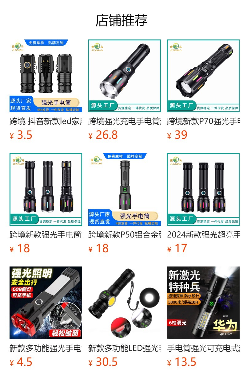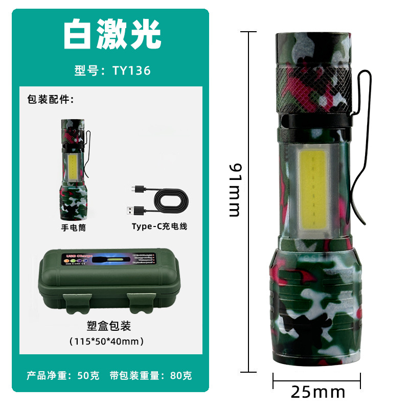 • 136 손전등 [측면 조명 + 내장 리튬 배터리 + 충전 케이블 + 테일 로프 + 플라스틱 상자]