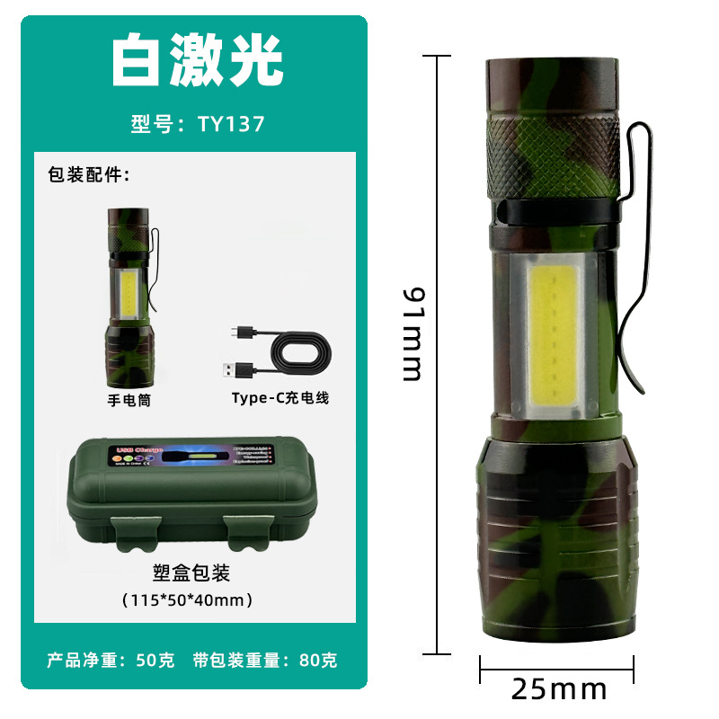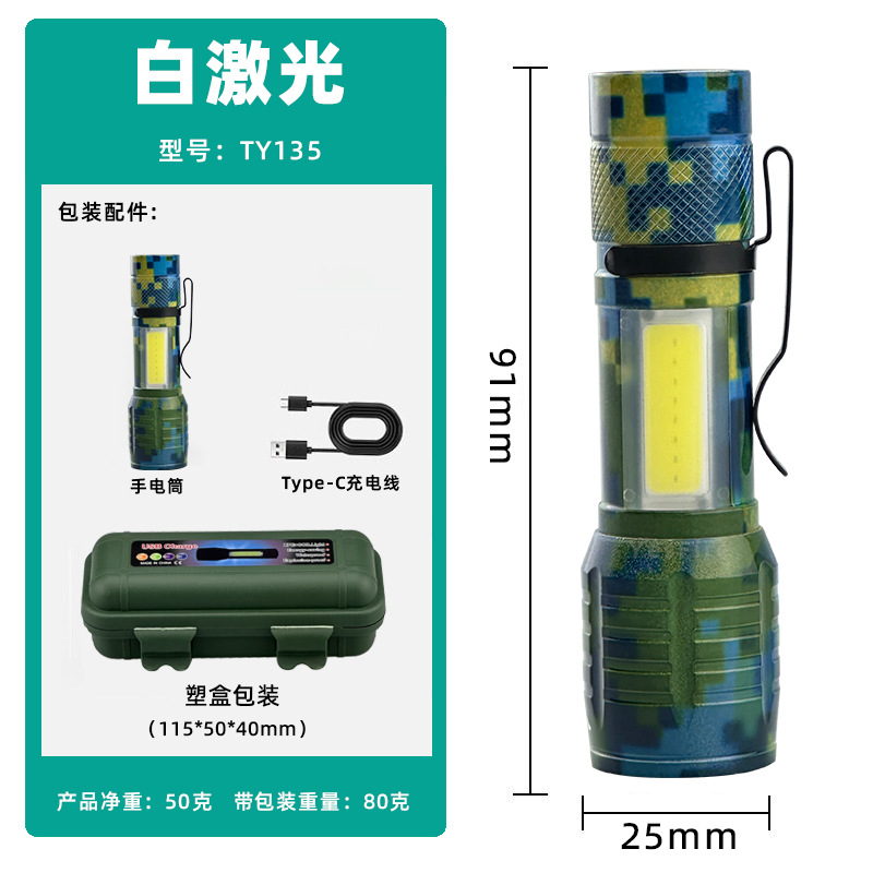 • 135 손전등 [측면 조명 + 내장 리튬 배터리 + 충전 케이블 + 테일 로프 + 플라스틱 상자]
