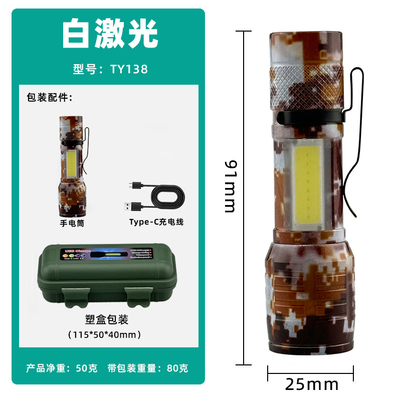 • 138 손전등 [측면 조명 + 내장 리튬 배터리 + 충전 케이블 + 테일 로프 + 플라스틱 상자]