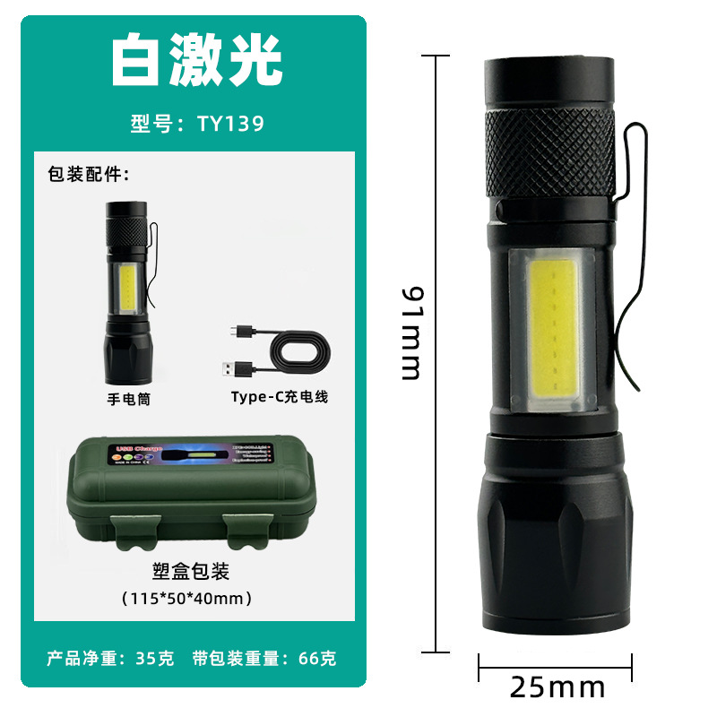 • 139 손전등 [측면 조명 + 내장 리튬 배터리 + 충전 케이블 + 테일 로프 + 플라스틱 상자]