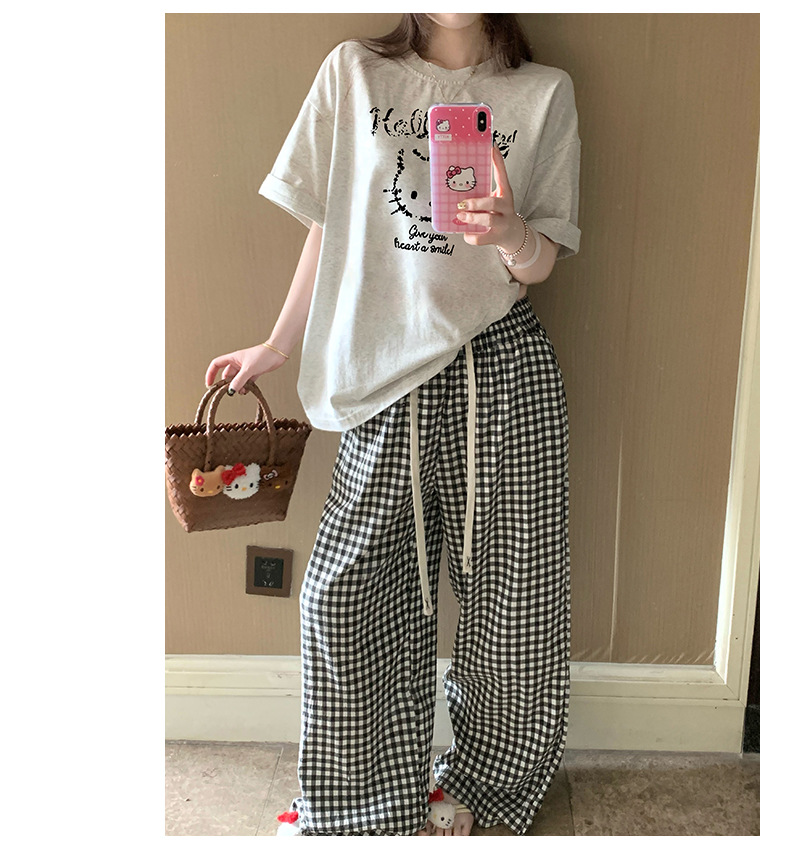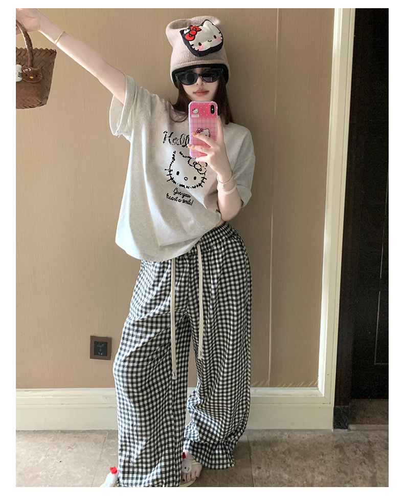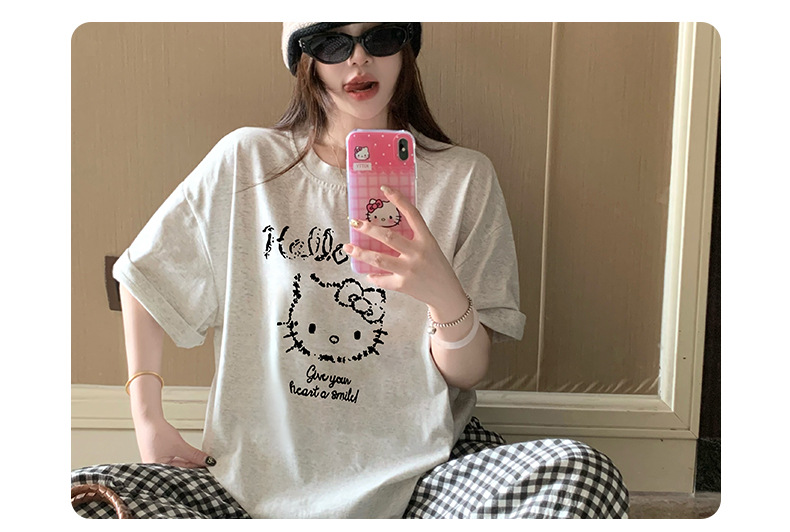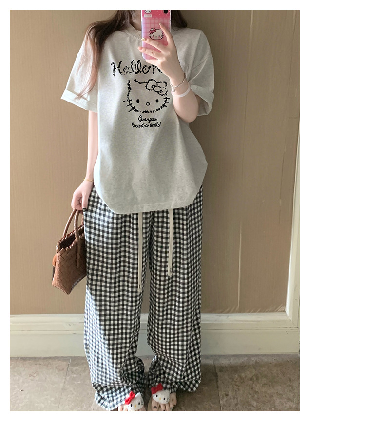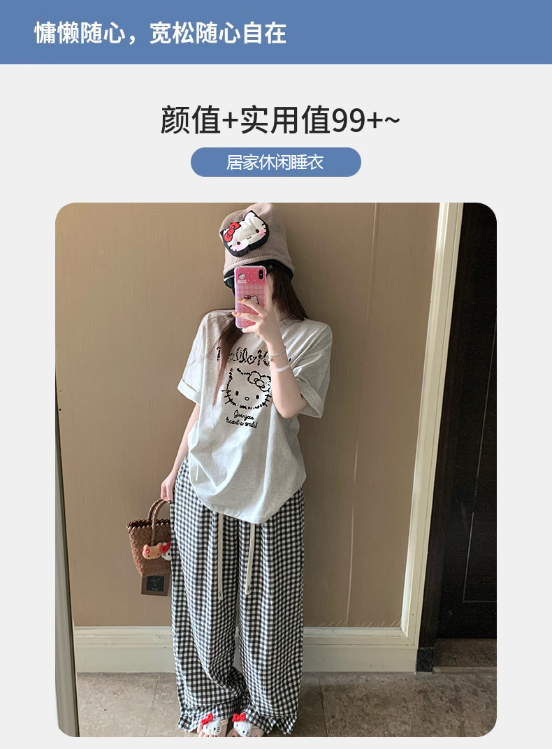 귀여운 KT 고양이 잠옷 여성면 여름 둥근 목 풀오버 짧은 소매 바지 만화 외부 착용 세트스토어 가기
