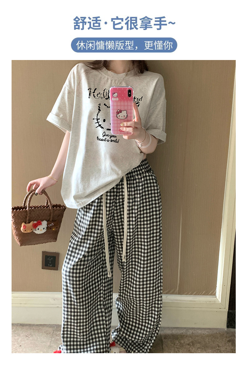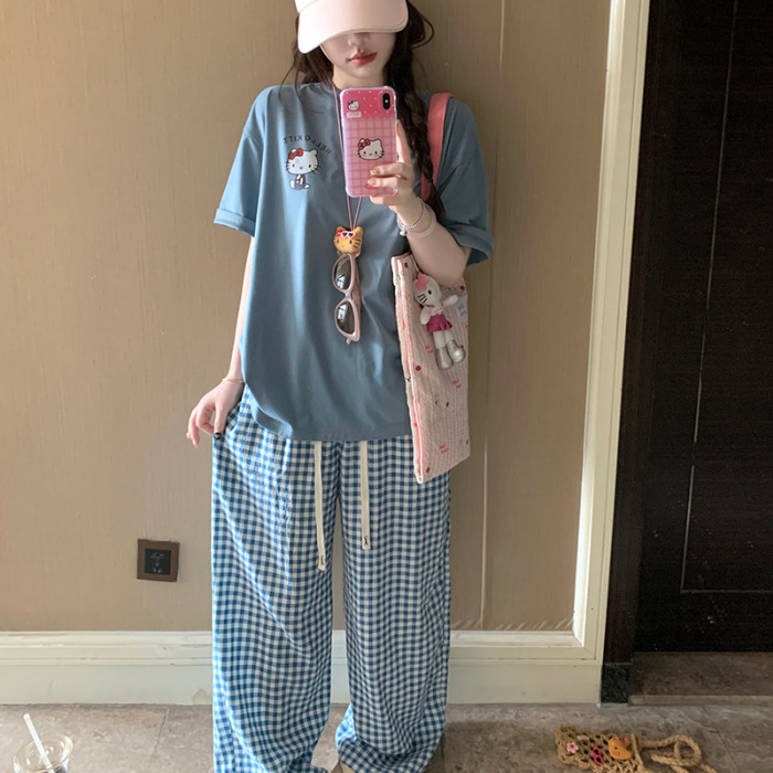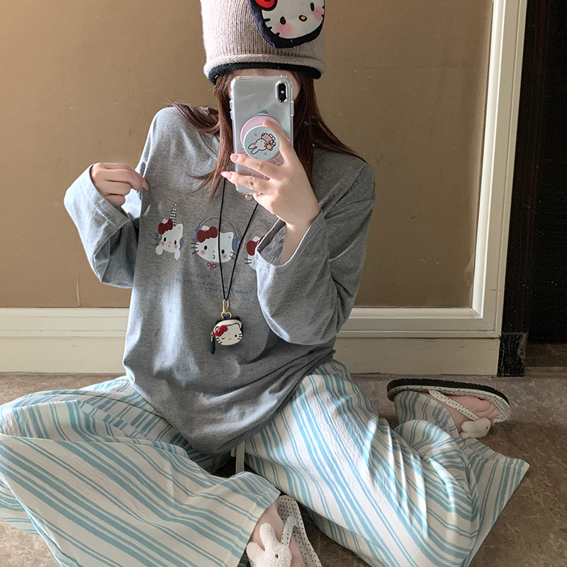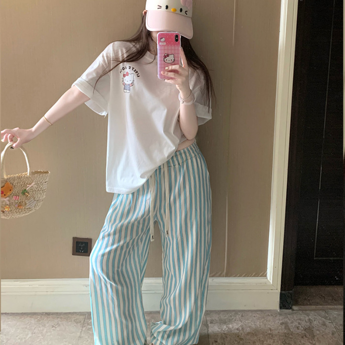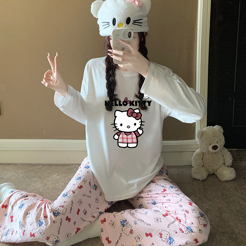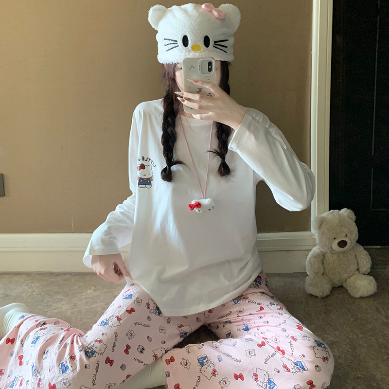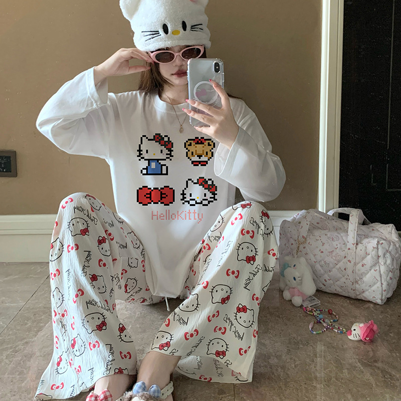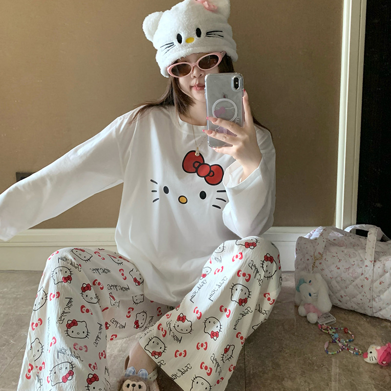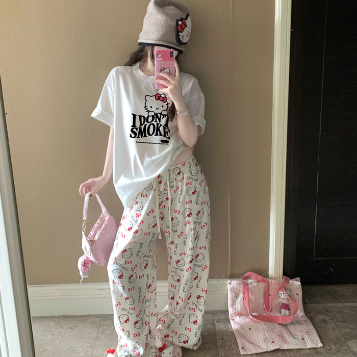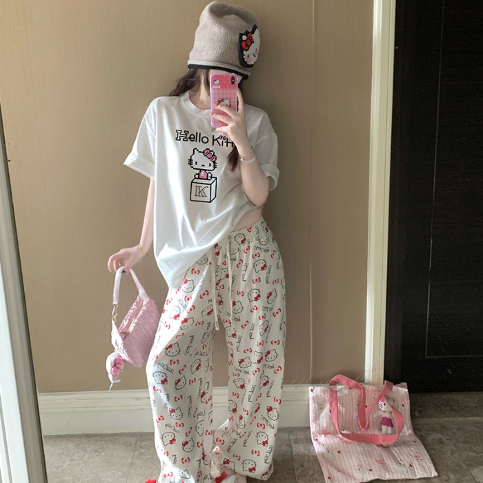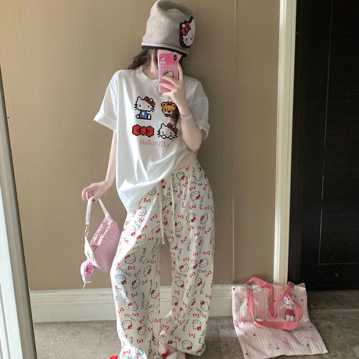 귀여운 KT 고양이 잠옷 여성면 여름 둥근 목 풀오버 짧은 소매 바지 만화 외부 착용 세트