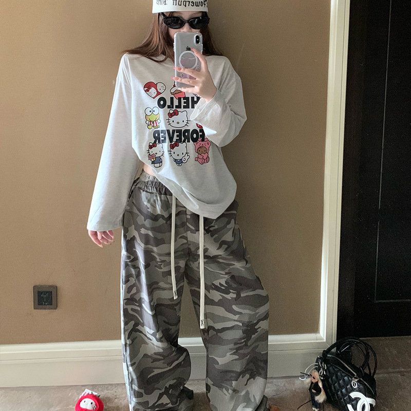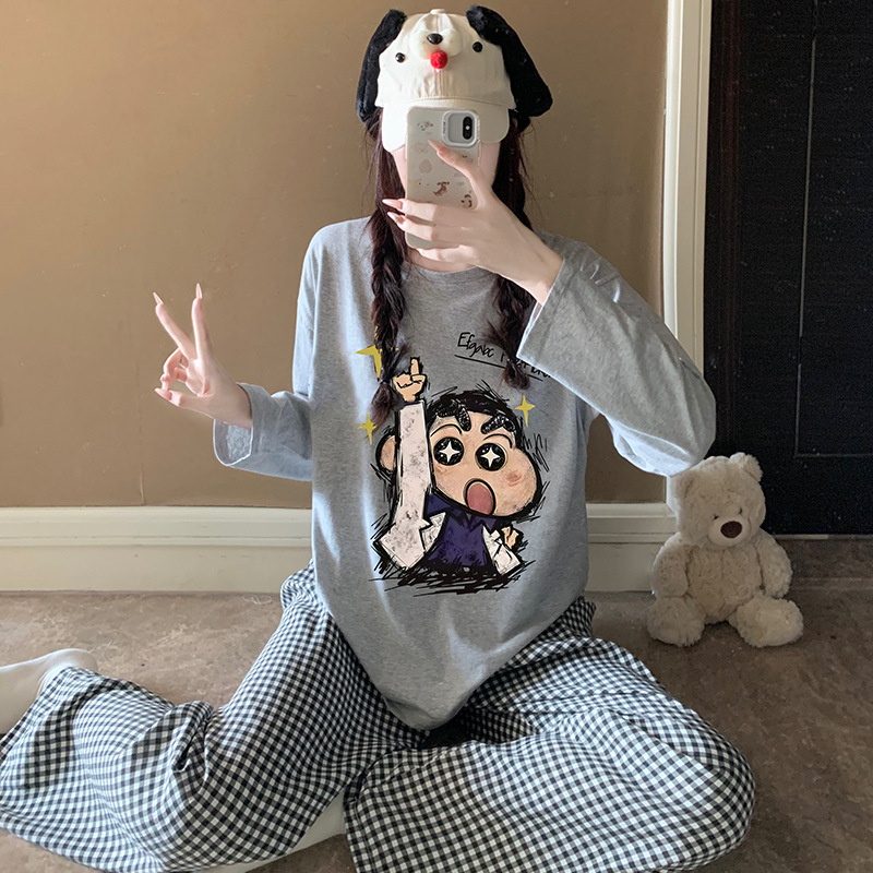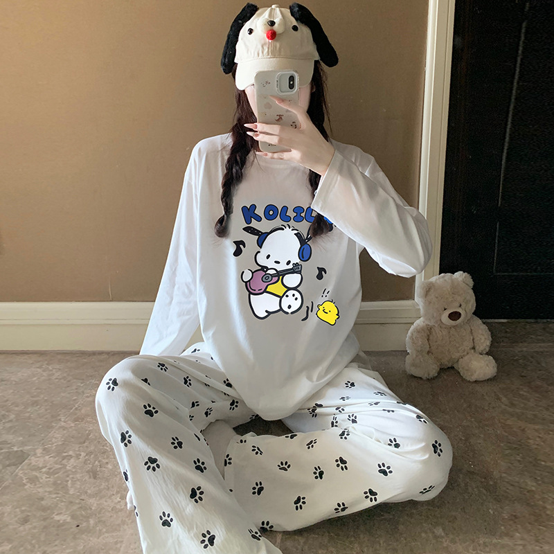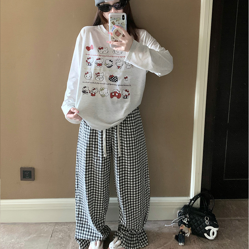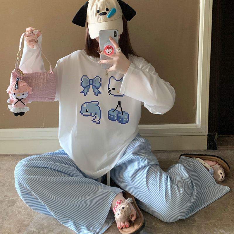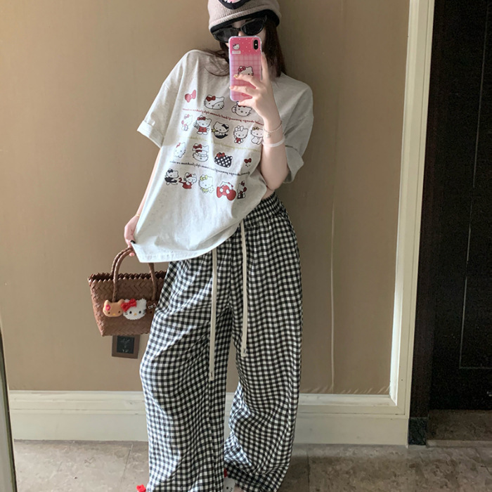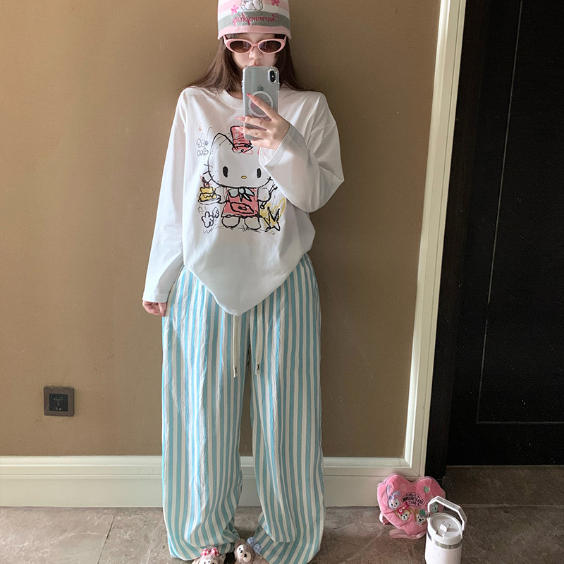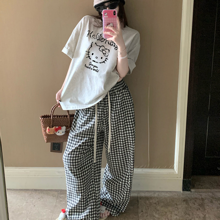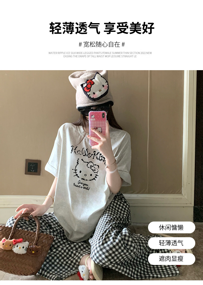 귀여운 KT 고양이 잠옷 여성면 여름 둥근 목 풀오버 짧은 소매 바지 만화 외부 착용 세트
