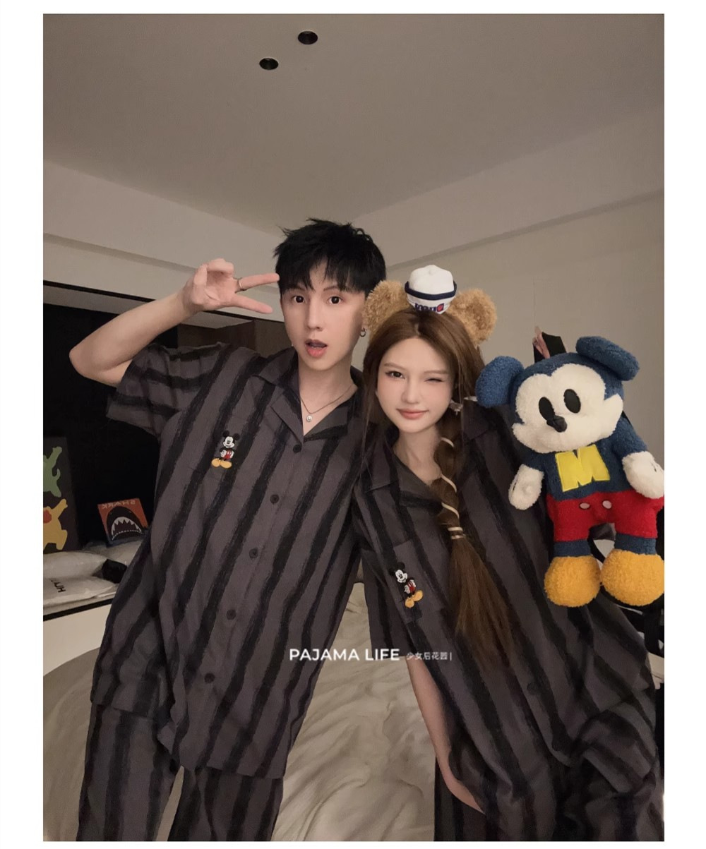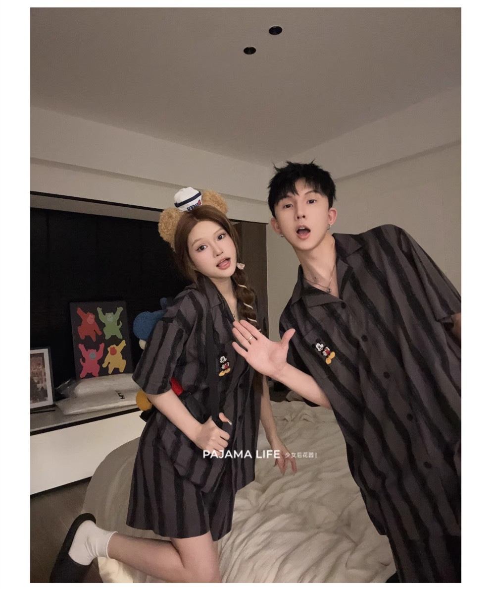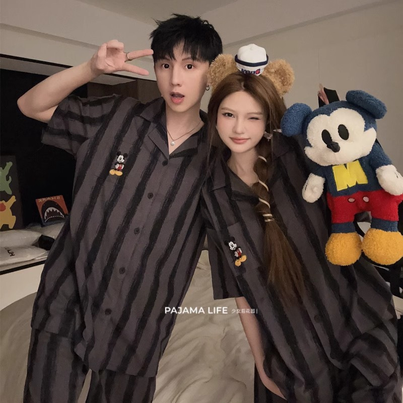 여름 모조 면화 커플 만화 반팔 반바지 잠옷 여성 귀여운 미키 스트라이프 남성 홈웨어 세트스토어 가기