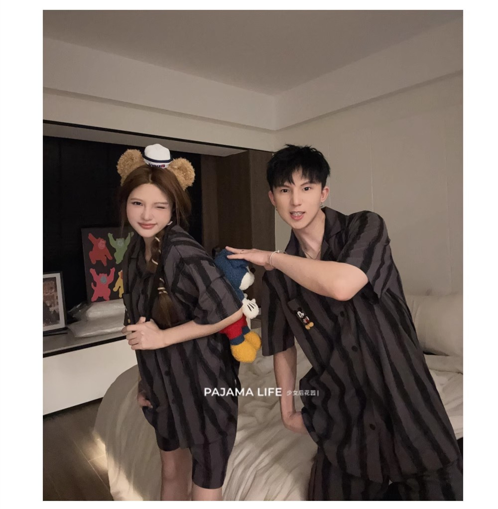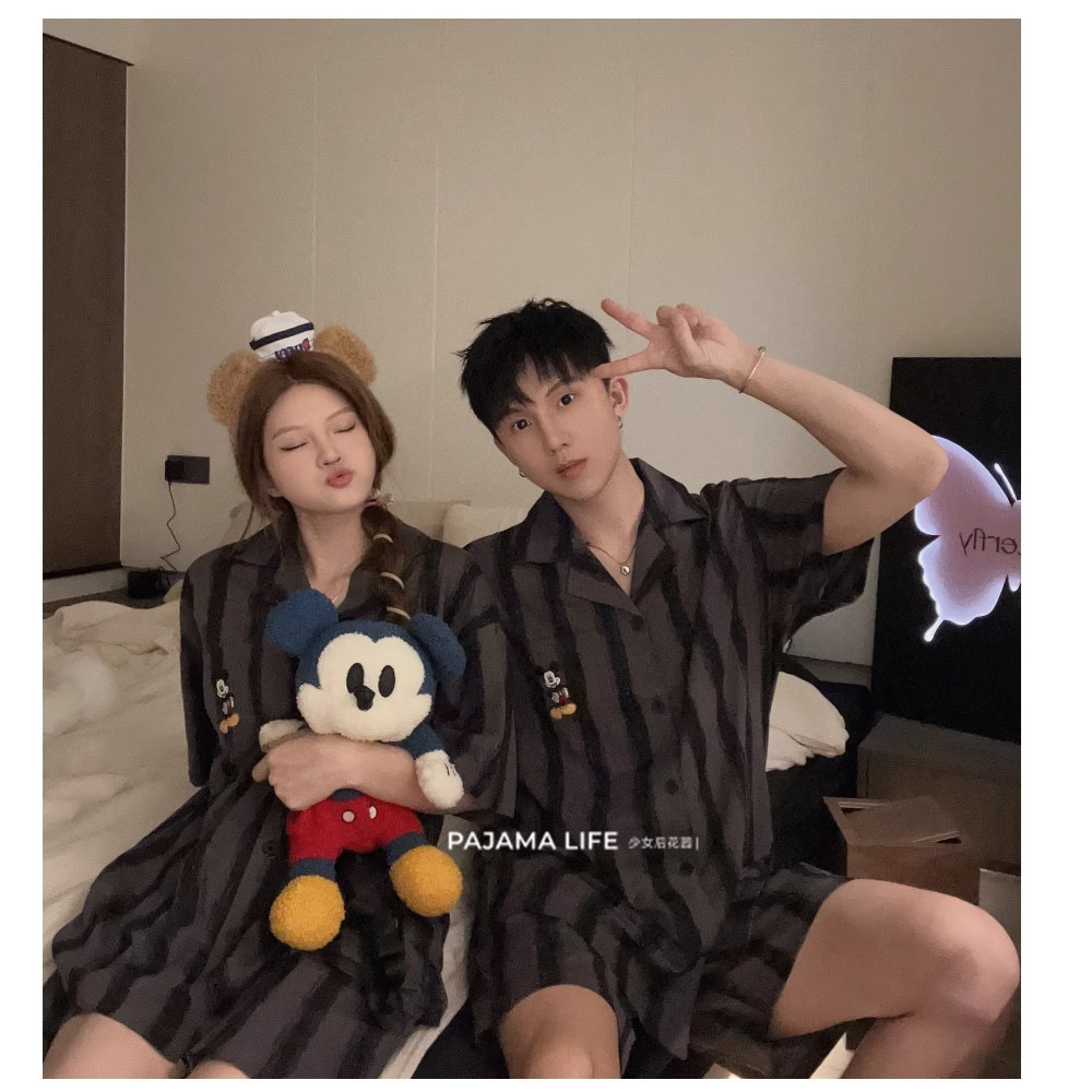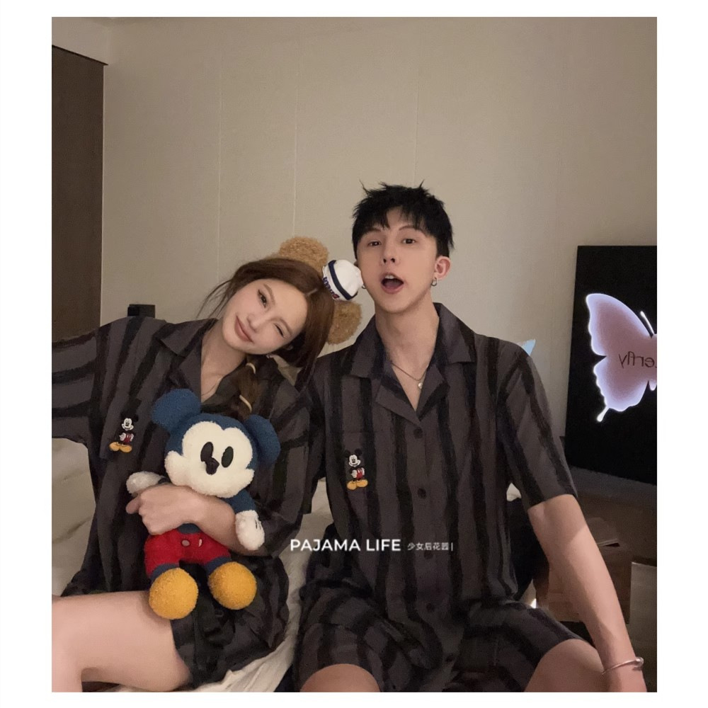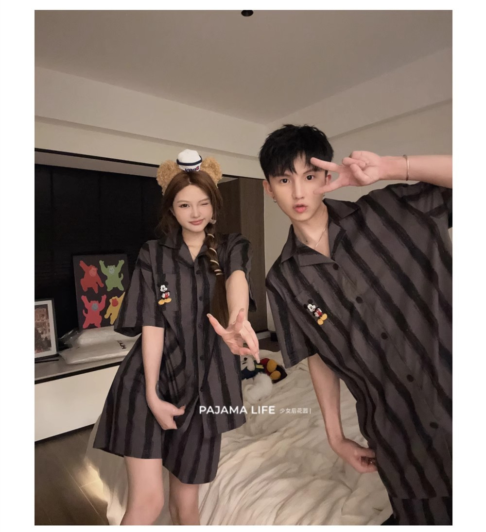 여름 모조 면화 커플 만화 반팔 반바지 잠옷 여성 귀여운 미키 스트라이프 남성 홈웨어 세트스토어 가기