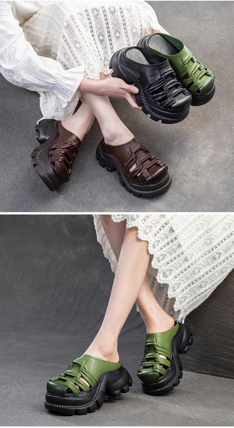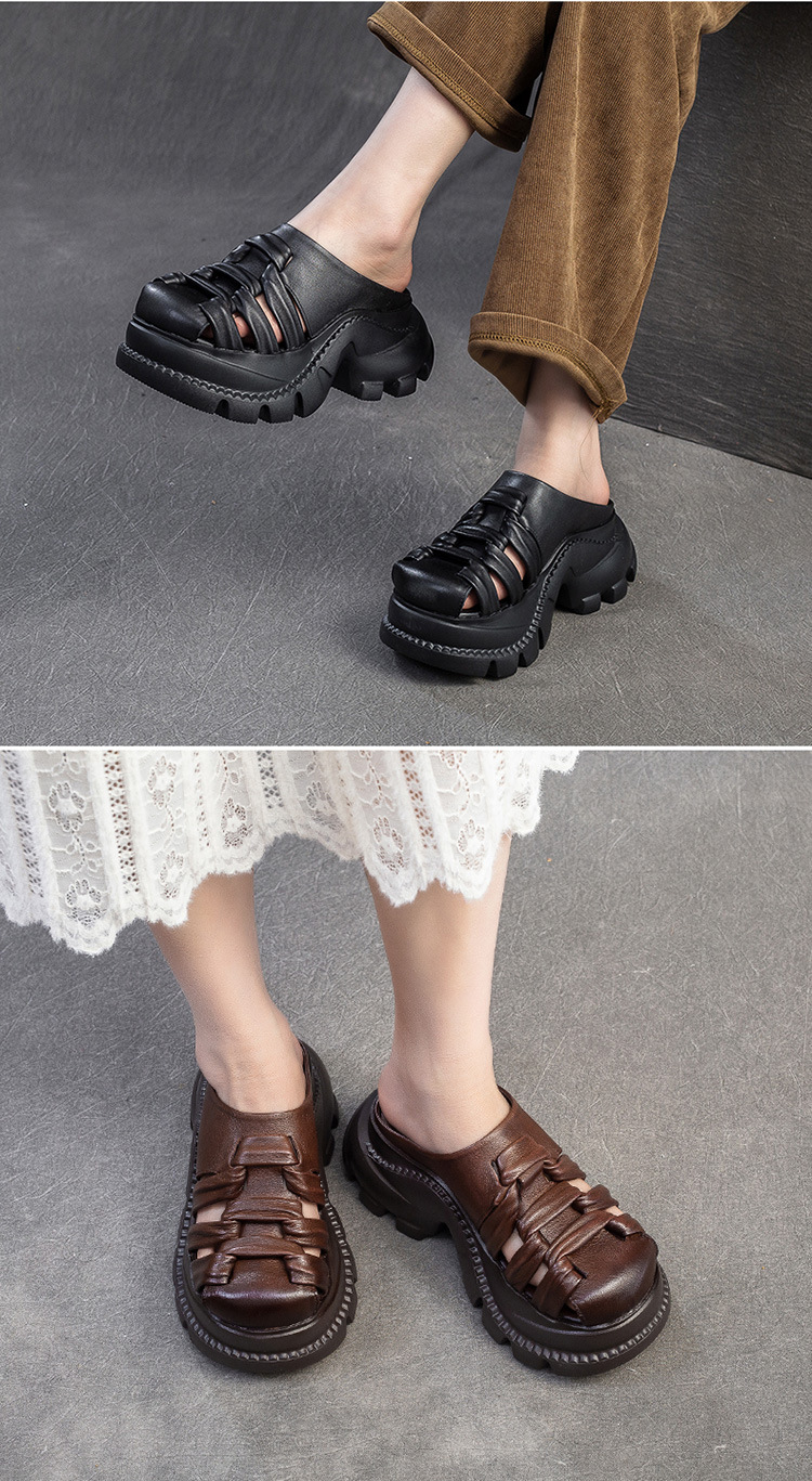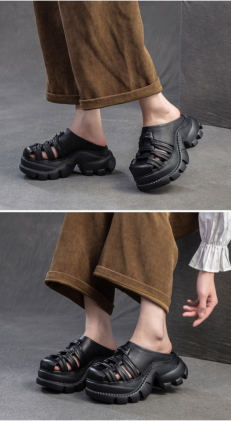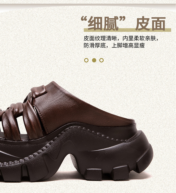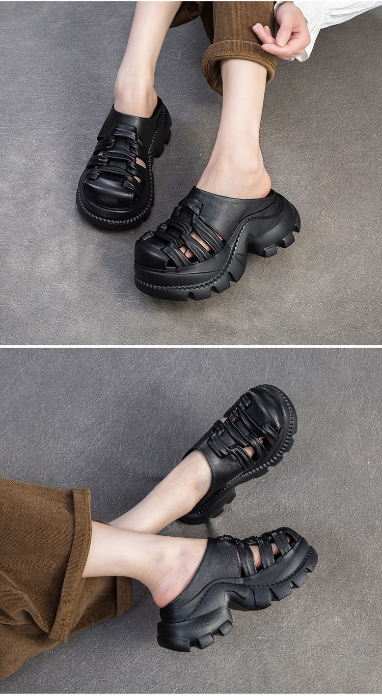 Jiejie 2025 여름 새로운 레트로 높이 증가 Baotou 레이어 Cowhide Outer Wear Slippers Hollow 올 매치 경량 여성 신발스토어 가기