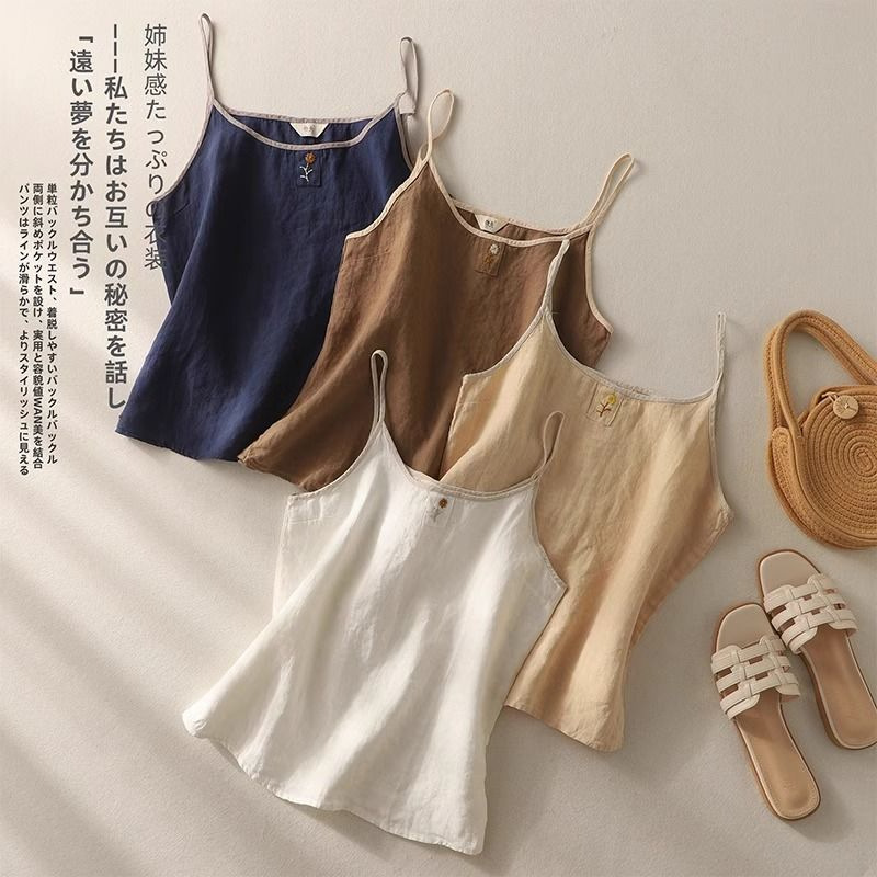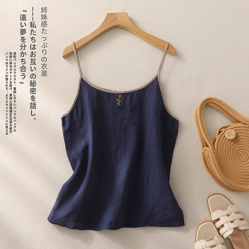 여성을위한 복고풍 작은 수 놓은 코튼과 린넨 작은 슬링 여름 새로운 느슨한 슬리밍 여성용 민소매 바닥 조끼 탑