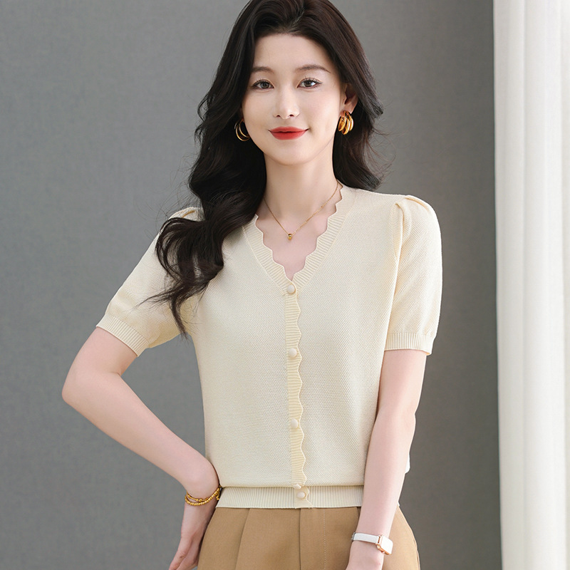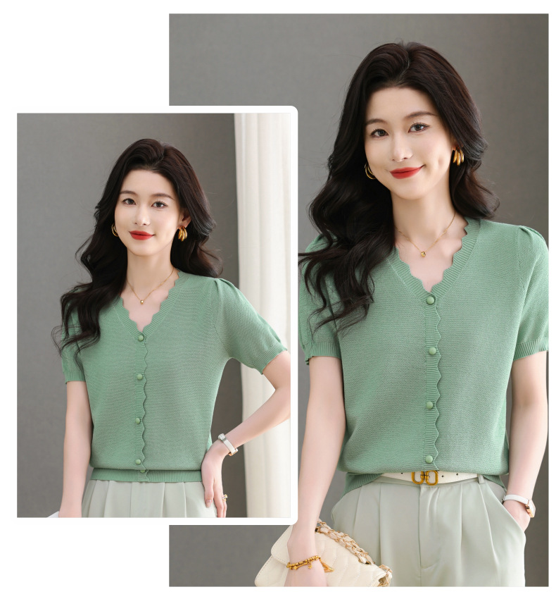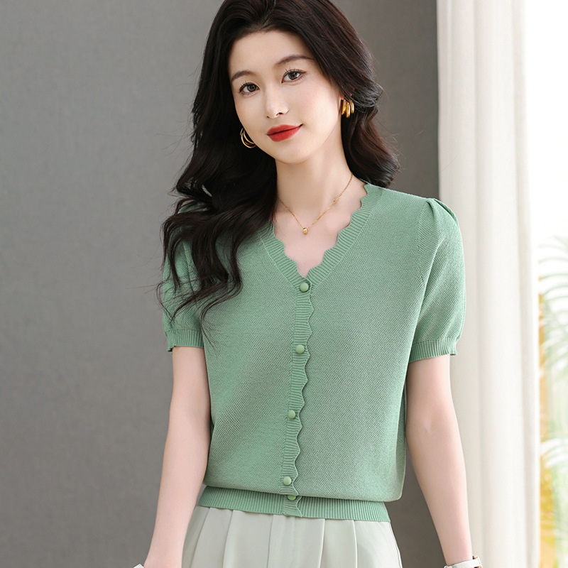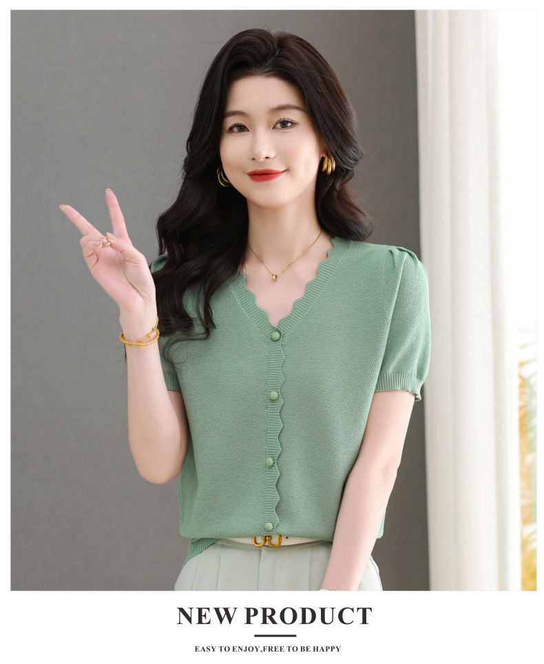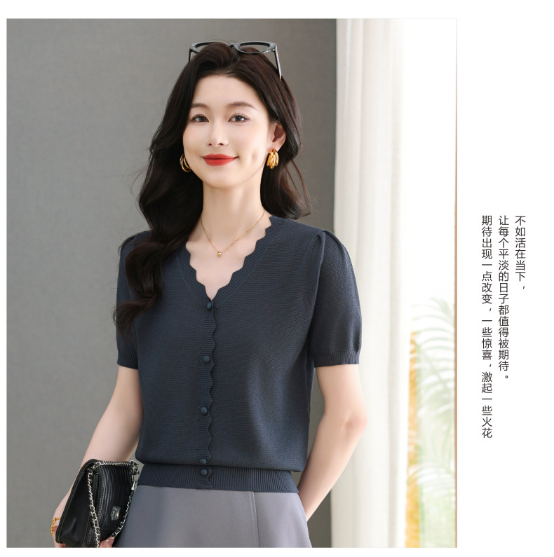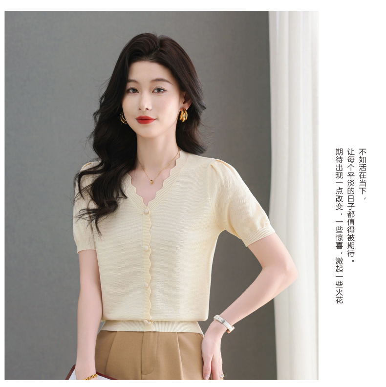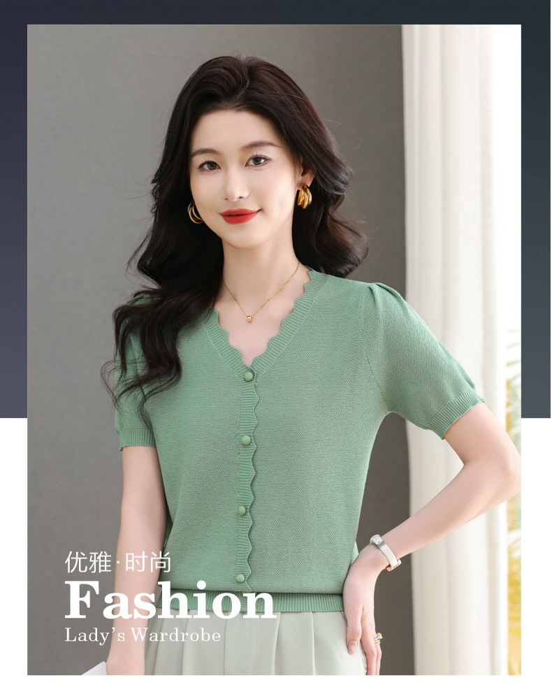 Lyocell Tencel 여름 2025 새로운 V 넥 얇은 니트 셔츠 티셔츠 여성용 반팔 티셔츠 풀오버 탑스토어 가기