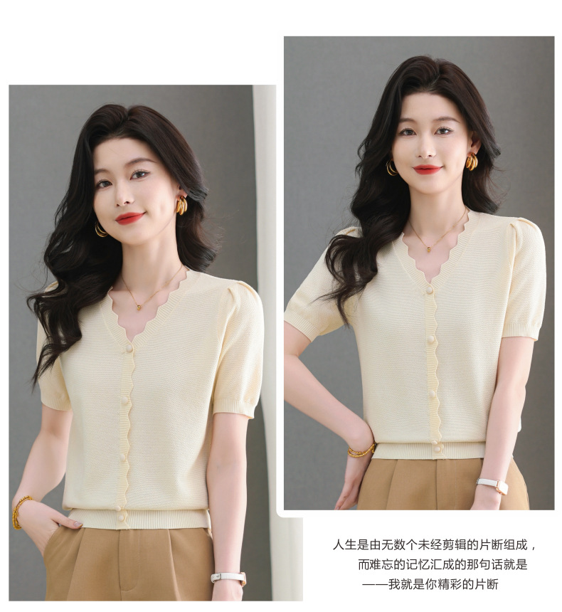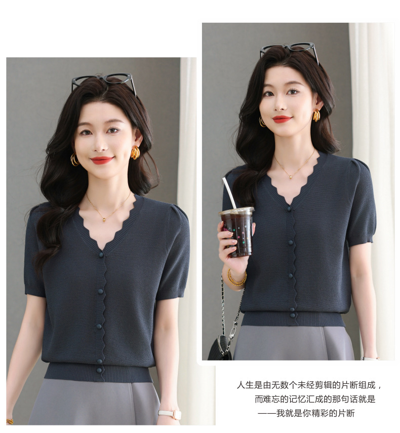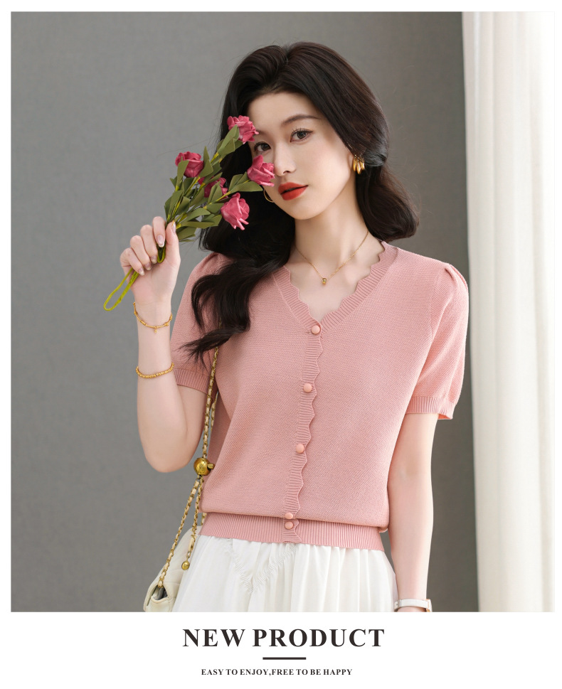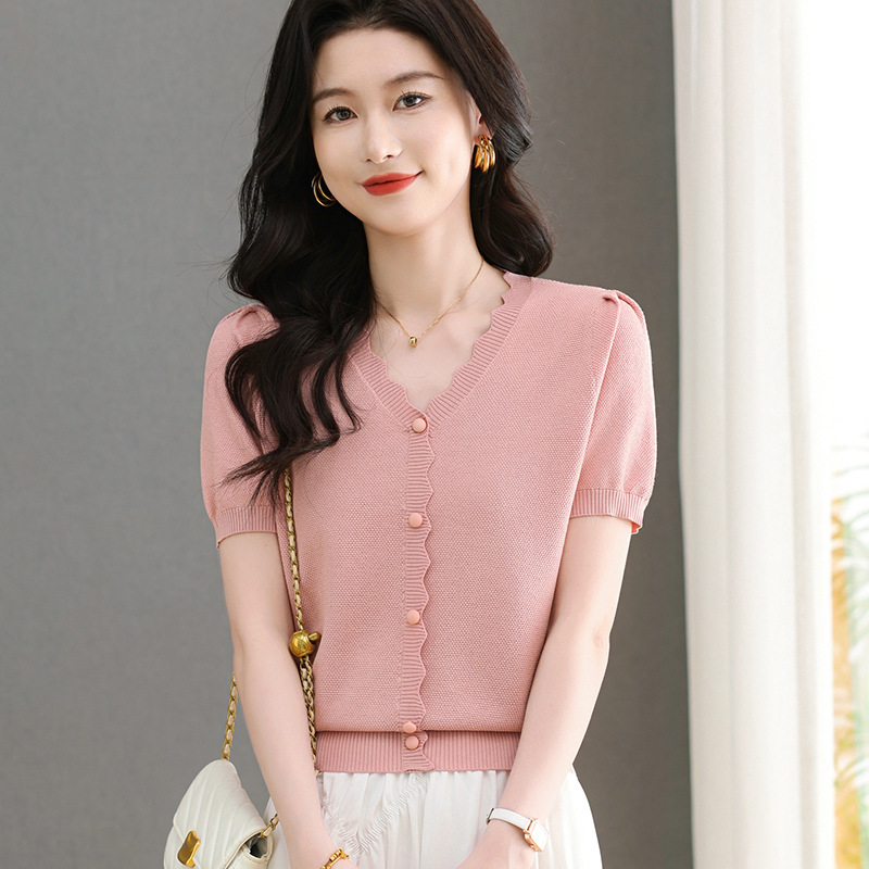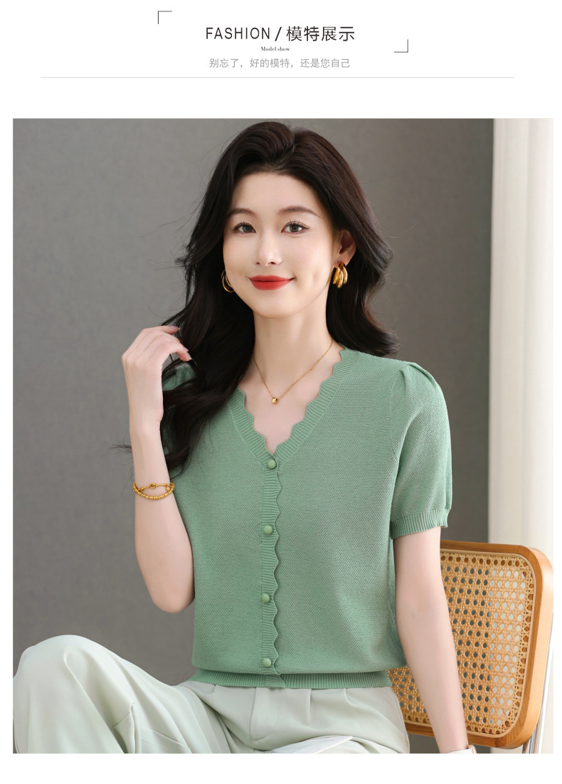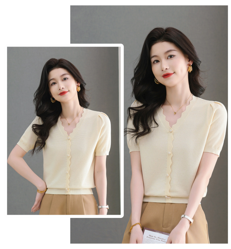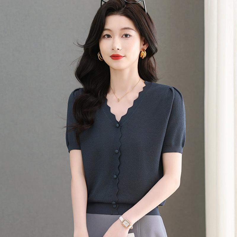 Lyocell Tencel 여름 2025 새로운 V 넥 얇은 니트 셔츠 티셔츠 여성용 반팔 티셔츠 풀오버 탑스토어 가기