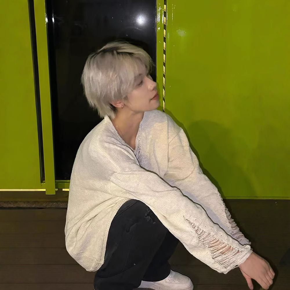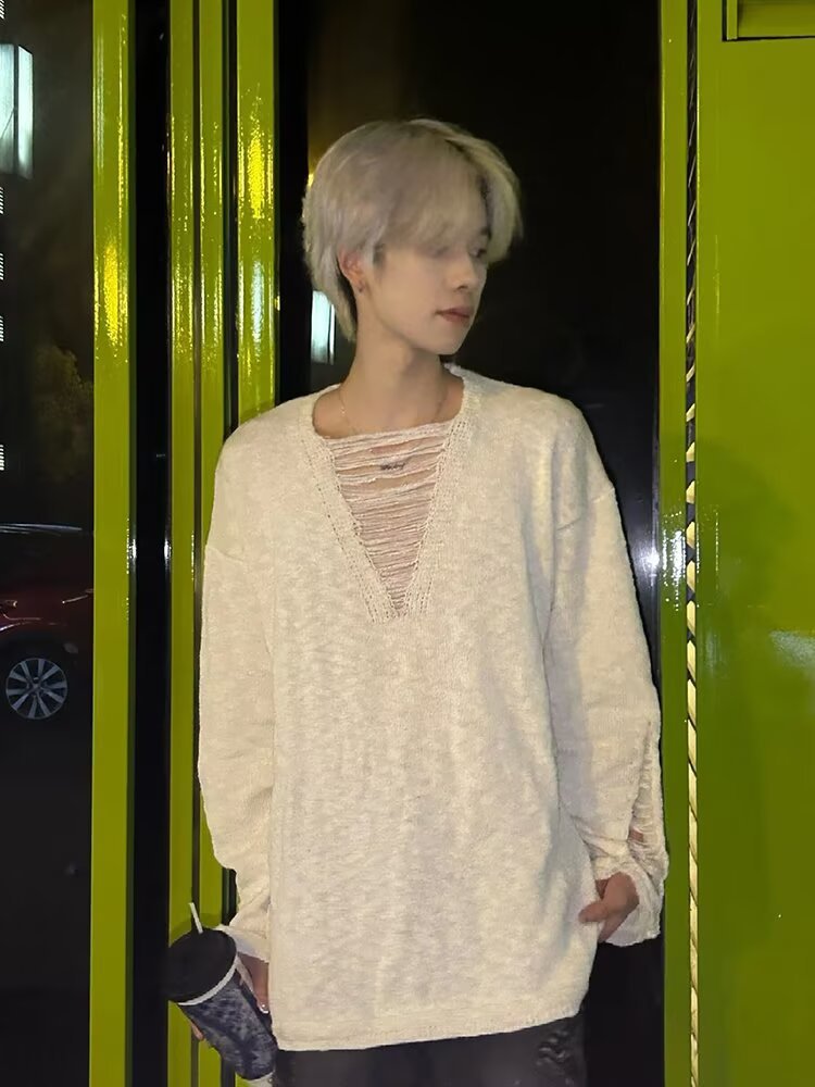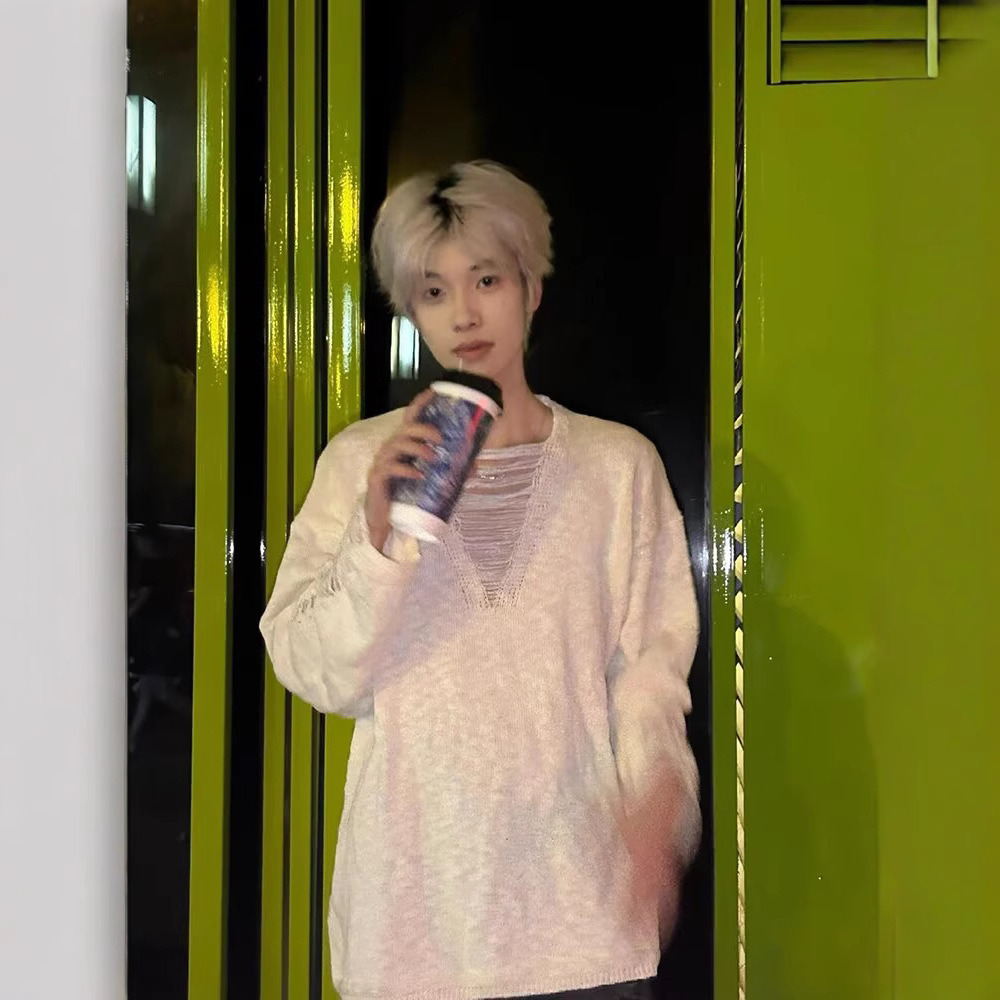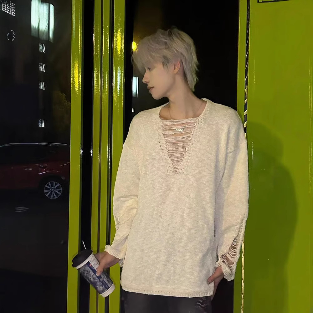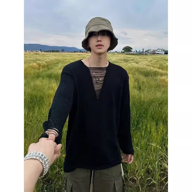 아메리칸 스타일 중공 딥 V 디자인 긴팔 스웨터 트렌디 남성 가을 하이엔드 핸섬 티셔츠 레이지 스타일 남성 모델 탑스토어 가기