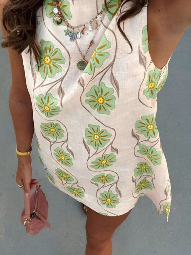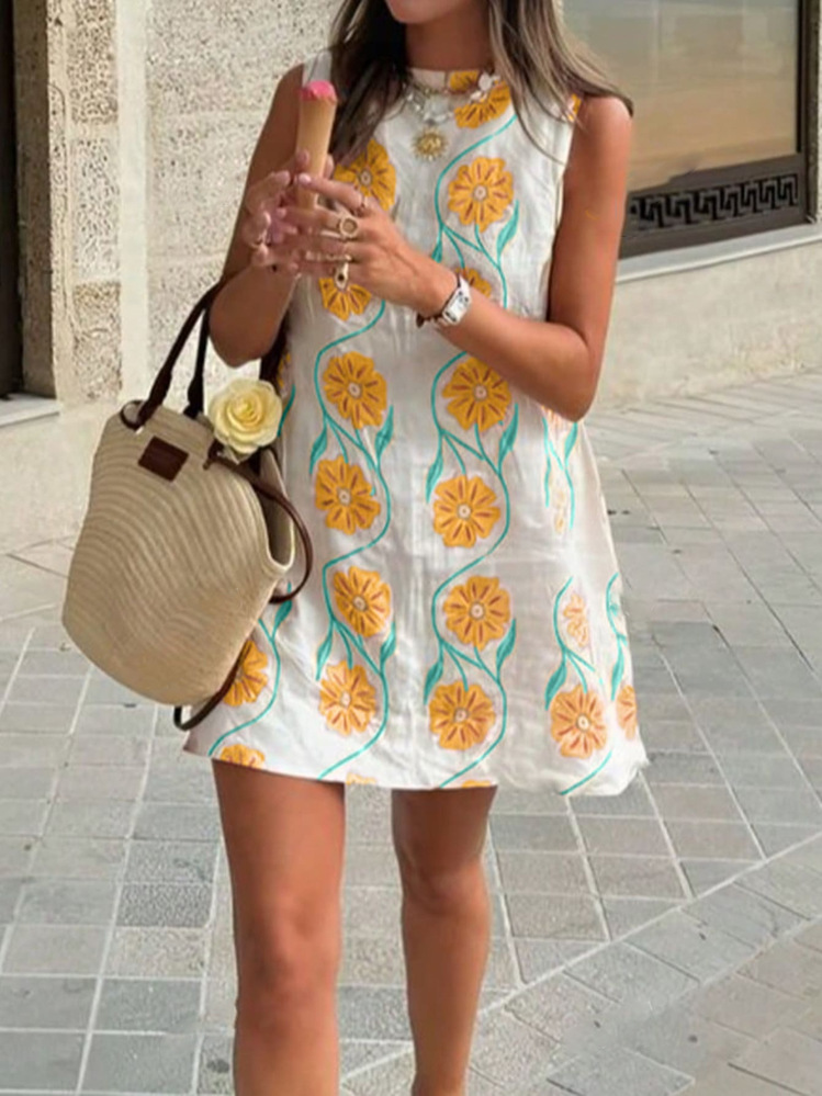 아마존 국경 유럽 및 미국 여성 2025 여름 새로운 캐주얼 핑크 꽃 크루 넥 민소매 조끼 원피스스토어 가기