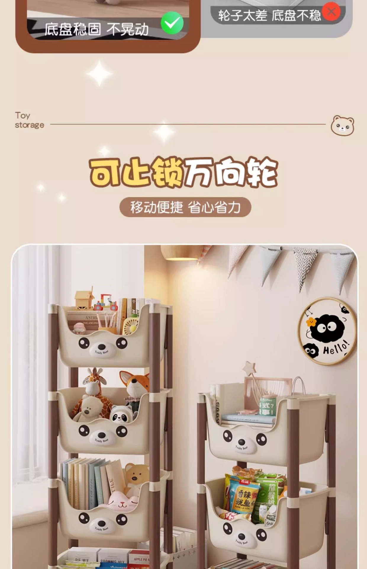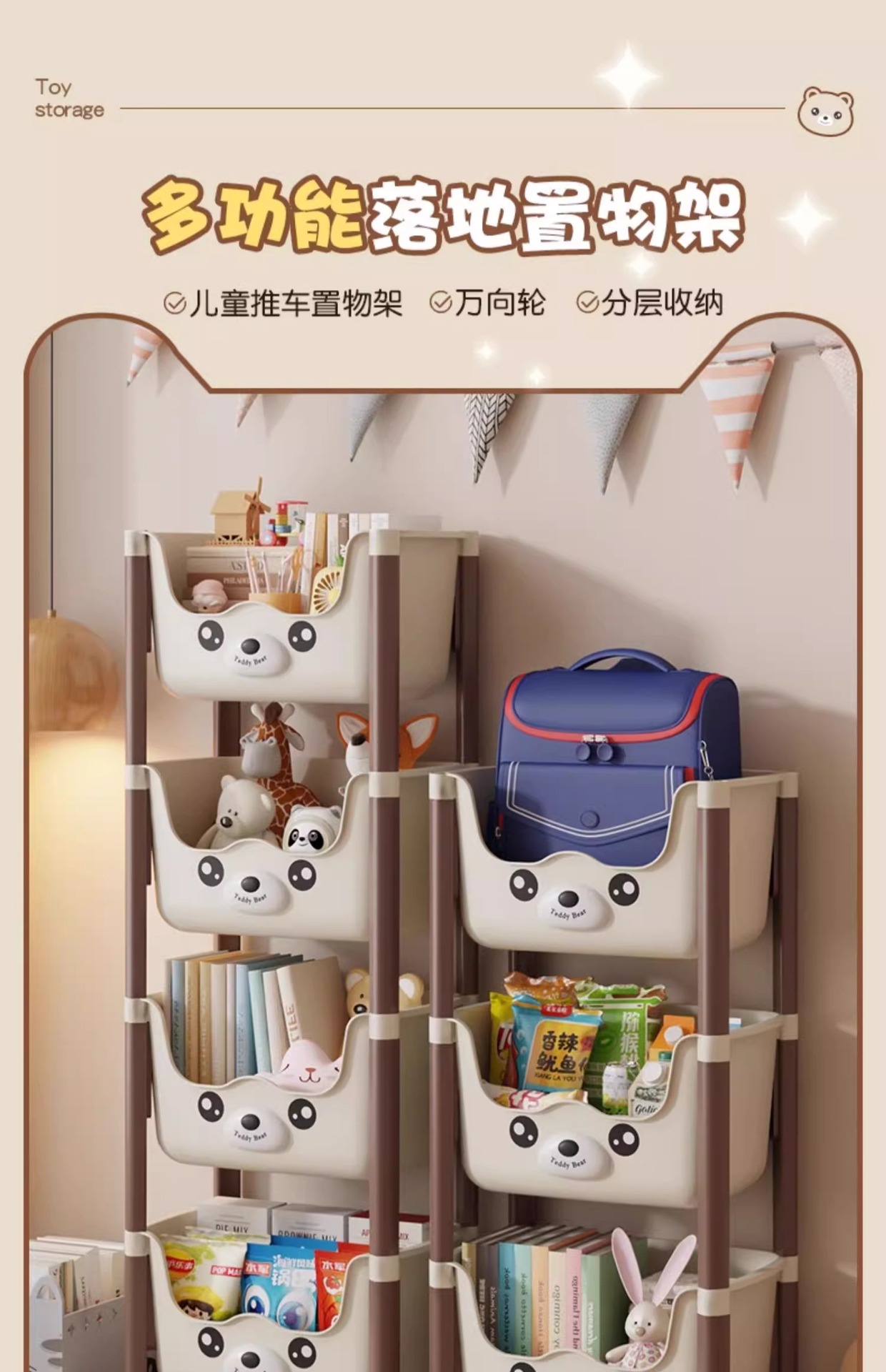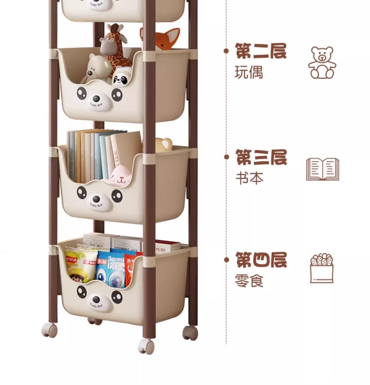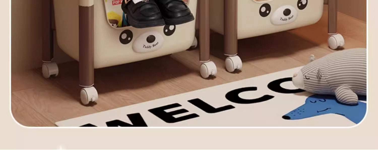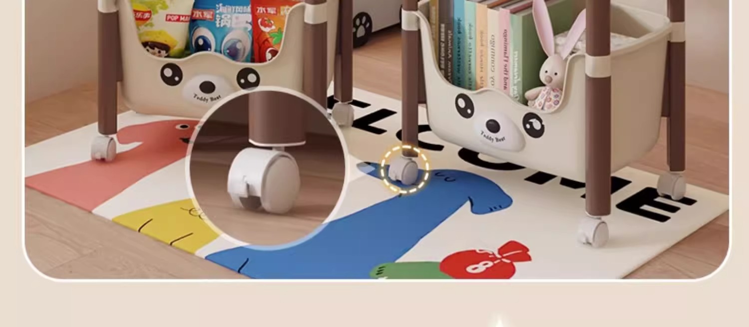 트롤리 선반 바닥에 서있는 다층 가정용 거실 간식 아기 제품 보관 랙 이동식 어린이 책장