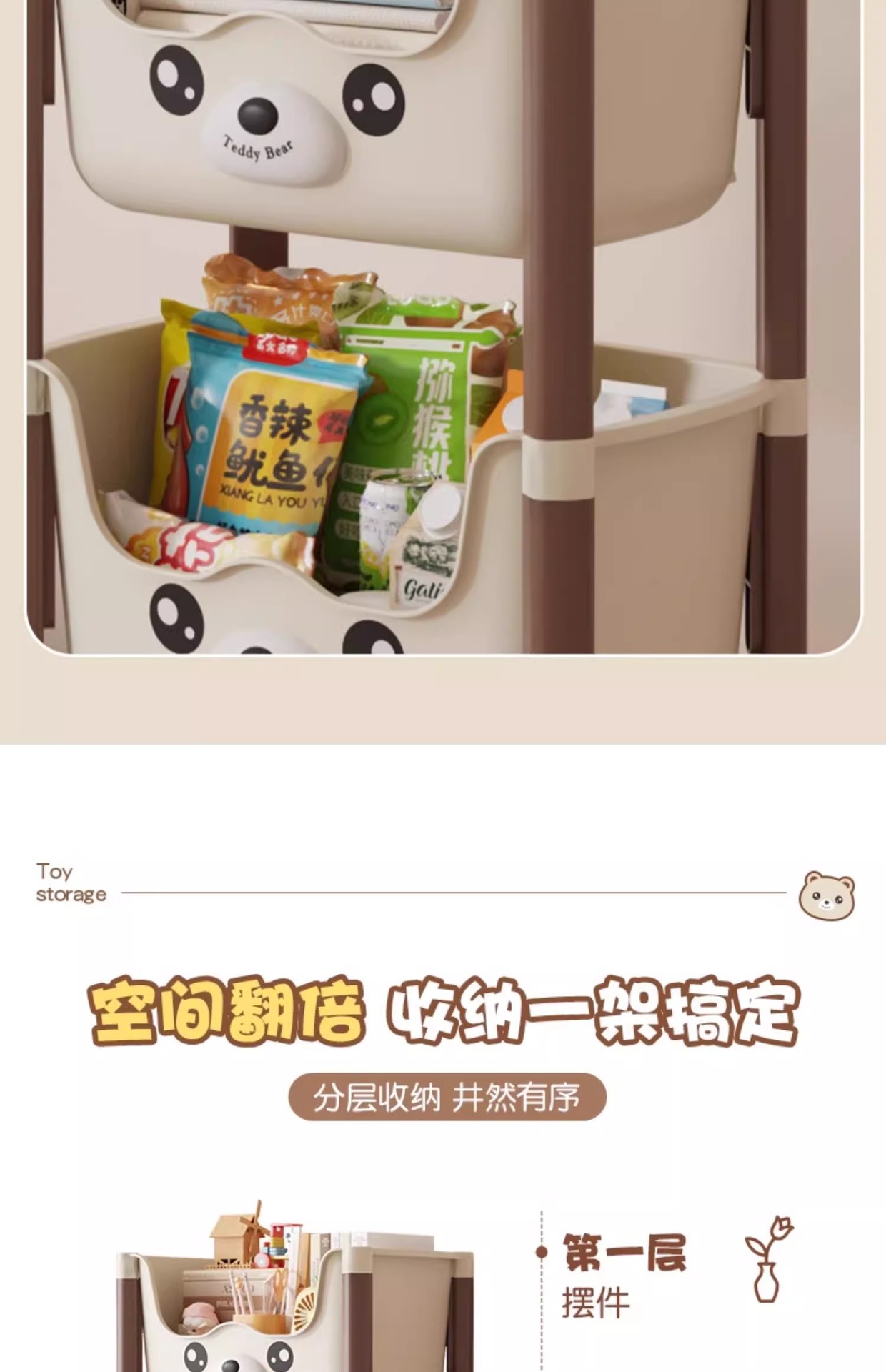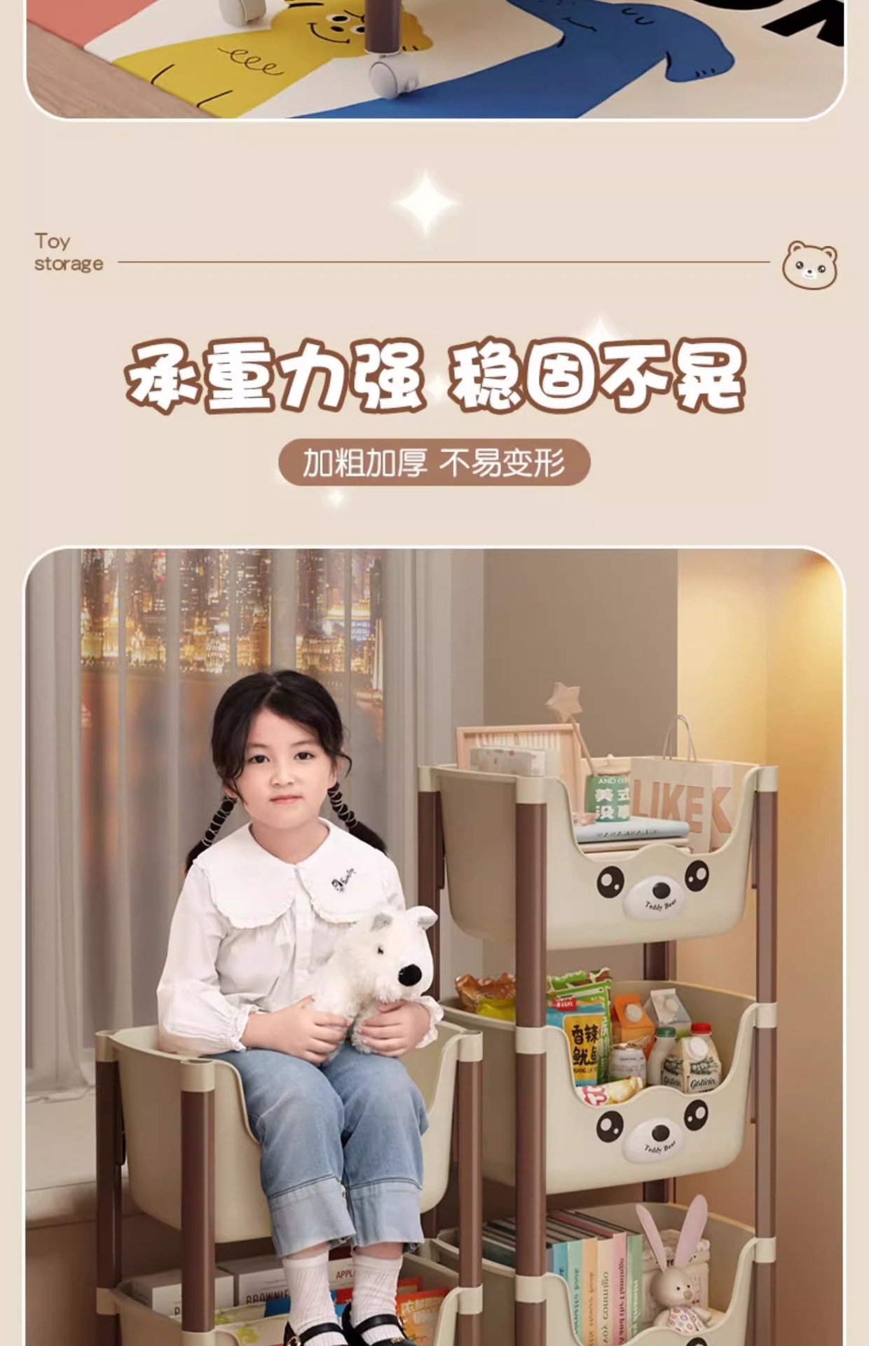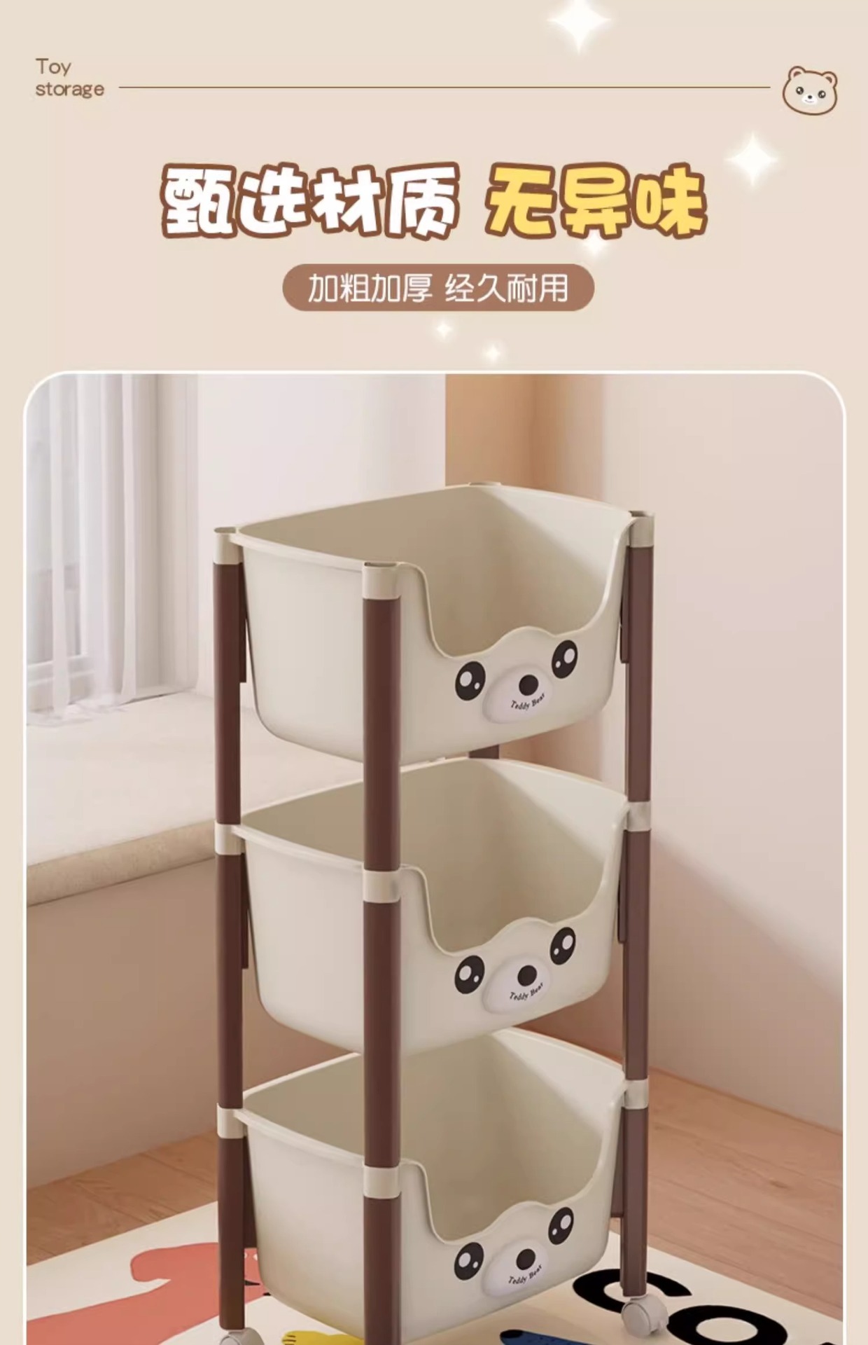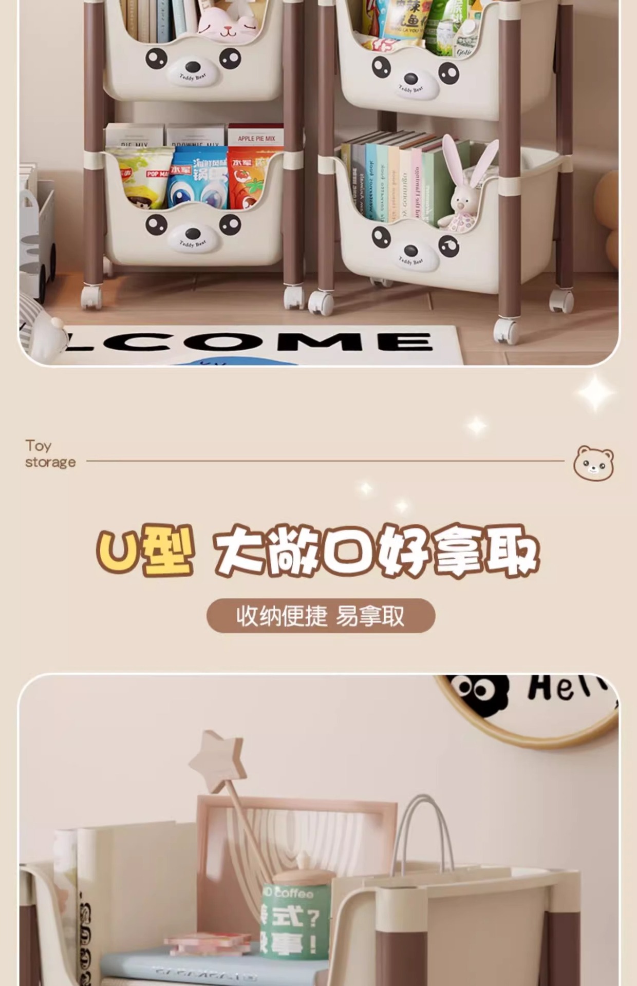 트롤리 선반 바닥에 서있는 다층 가정용 거실 간식 아기 제품 보관 랙 이동식 어린이 책장