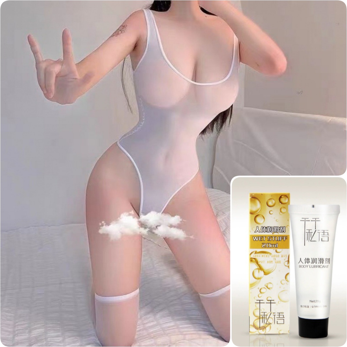 • 흰색 오픈 점프수트 + 흰색 망사 스타킹