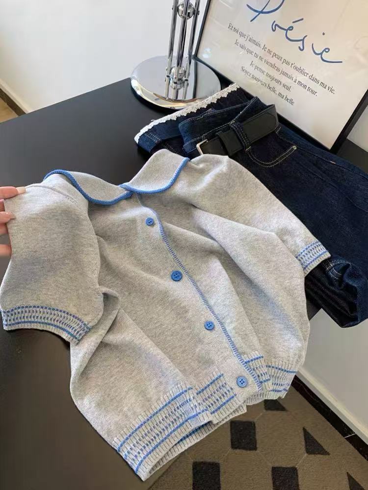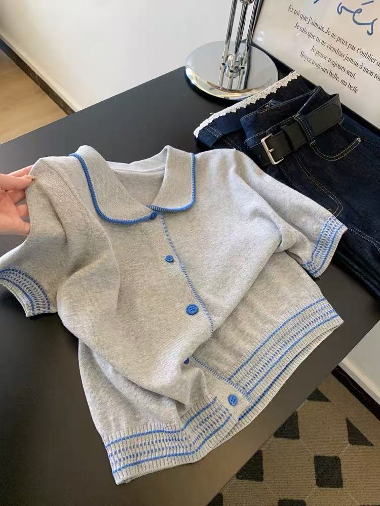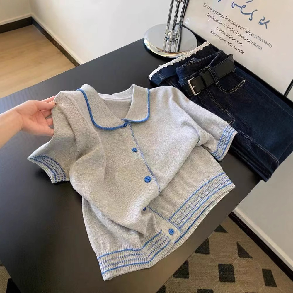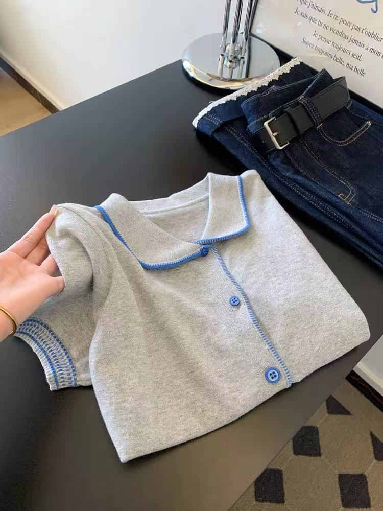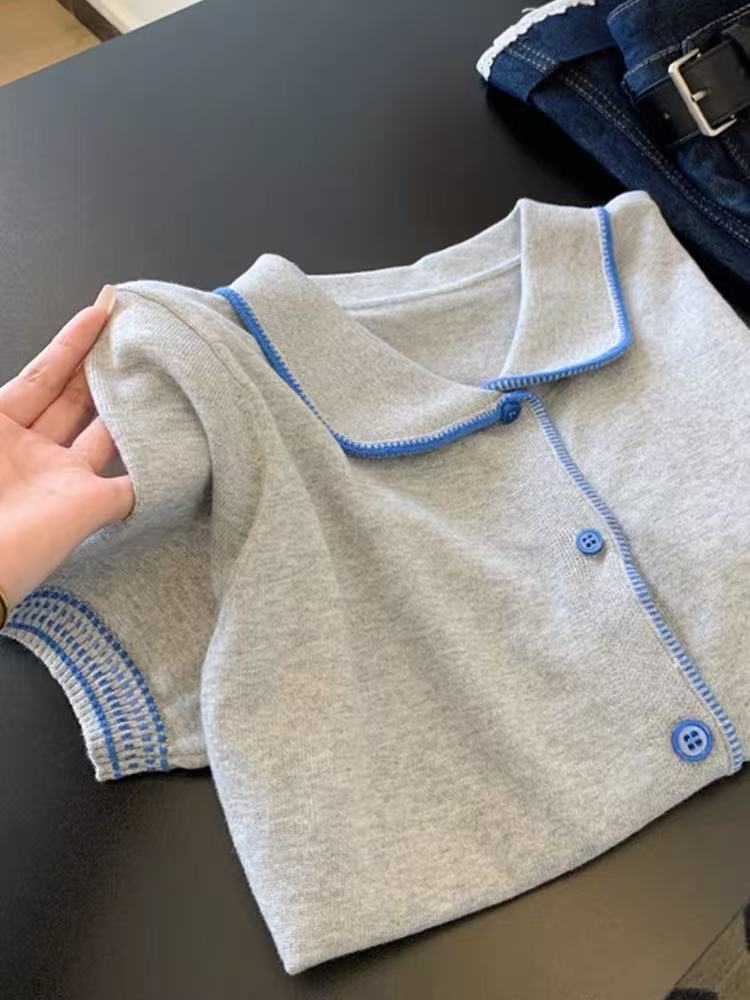 蕾丝边针织短袖t恤女小个子短款设计感正肩直筒气质上衣新款ins