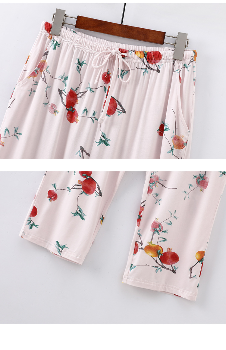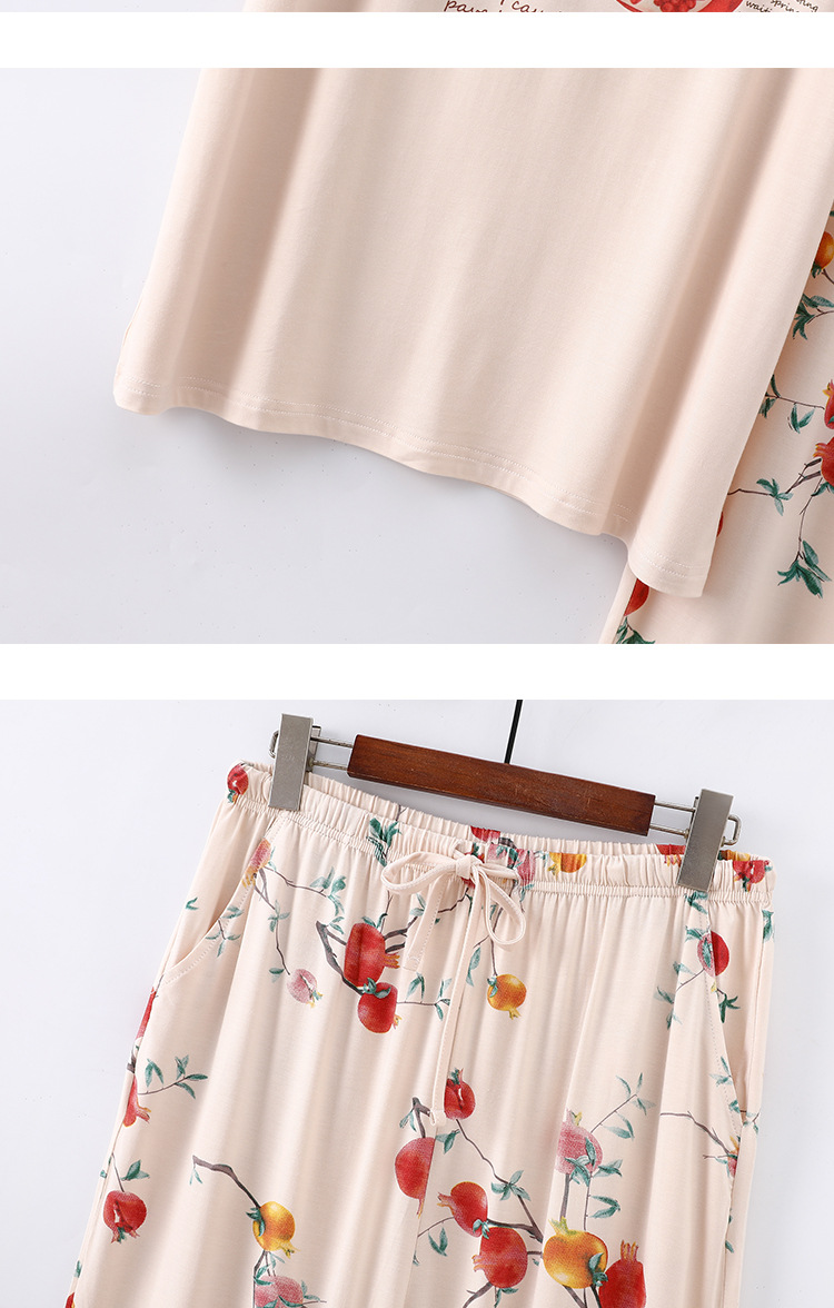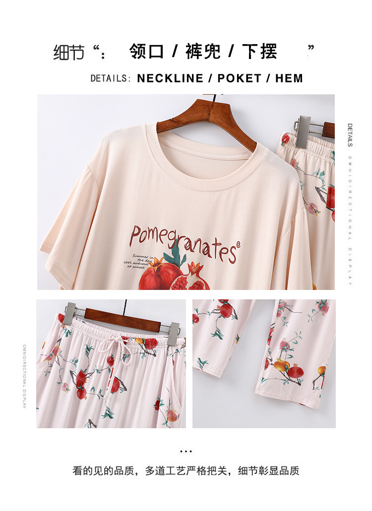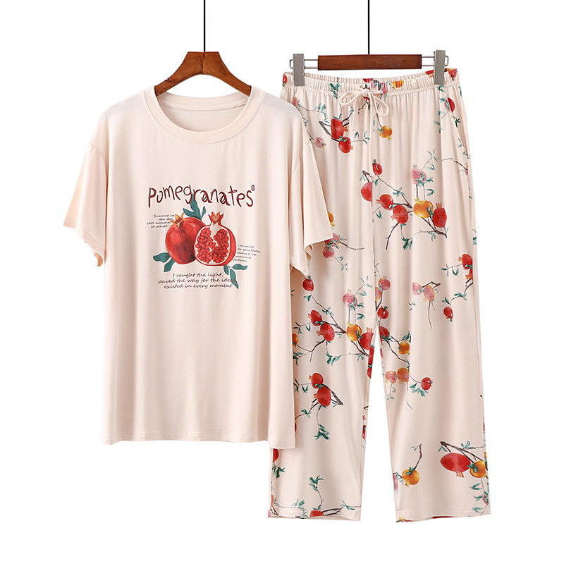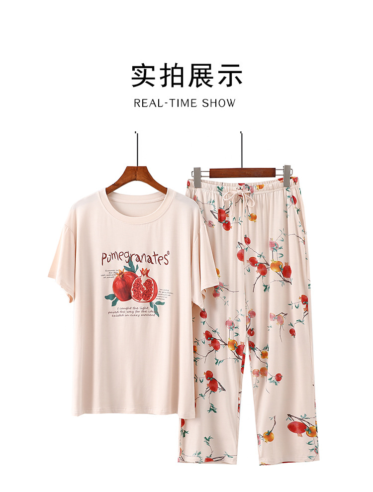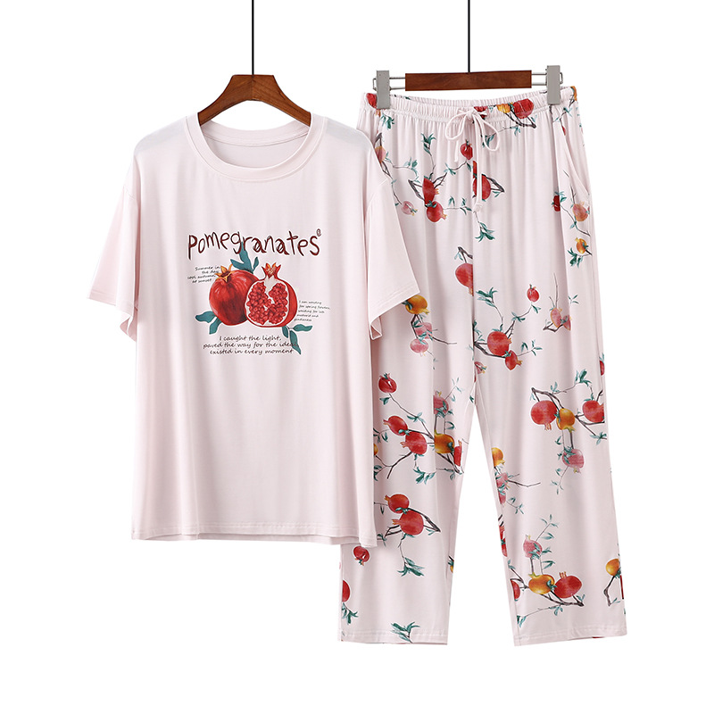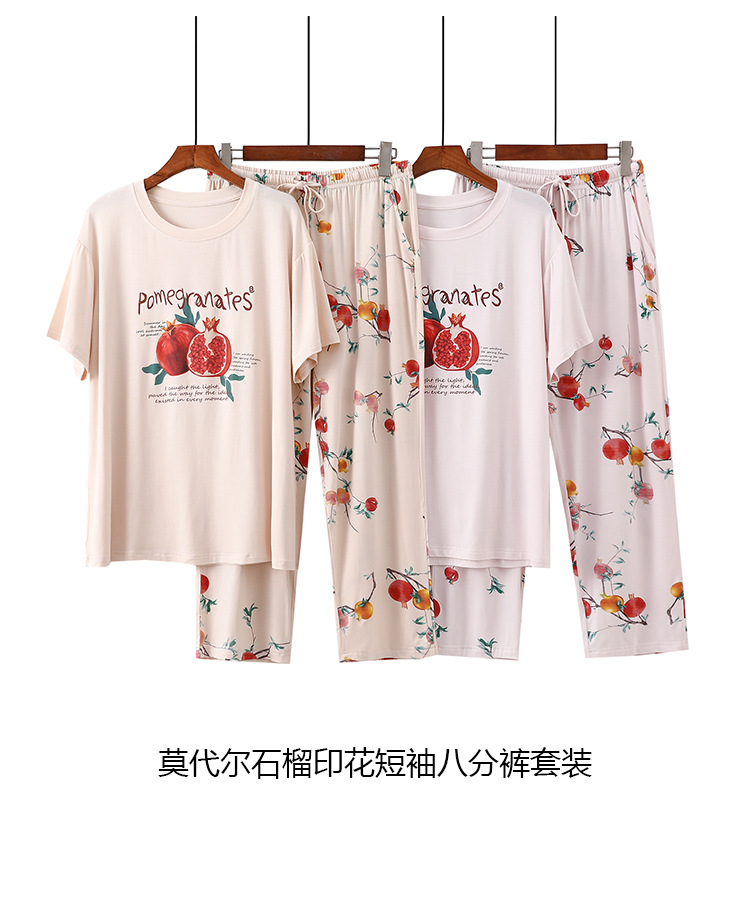 여성용 모달 잠옷 여름 반팔 8 점 바지 만화 석류 프린트 홈웨어 얇은 스트레치 슈트스토어 가기