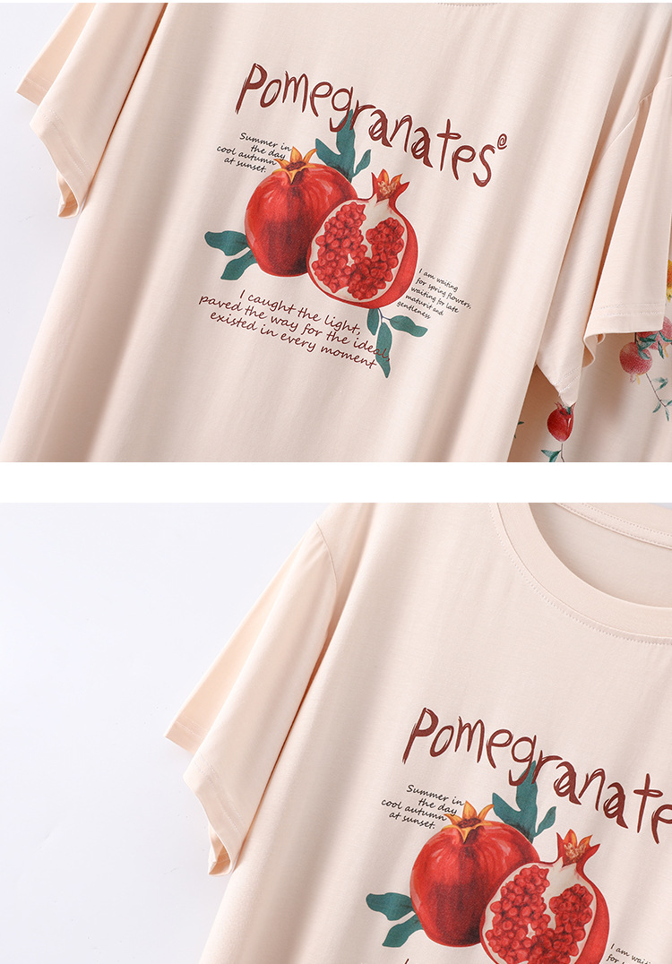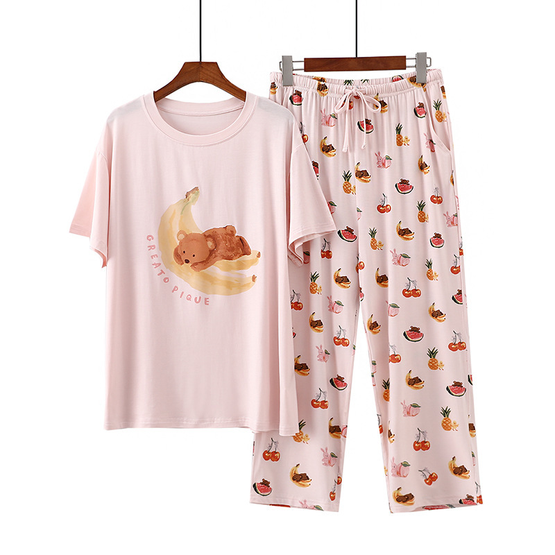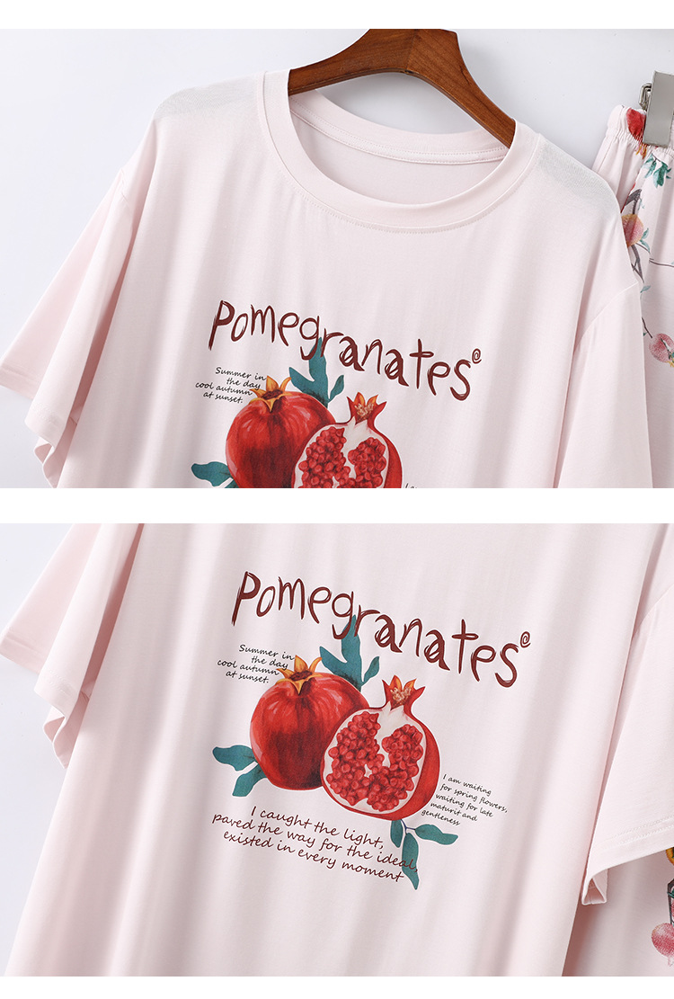 여성용 모달 잠옷 여름 반팔 8 점 바지 만화 석류 프린트 홈웨어 얇은 스트레치 슈트