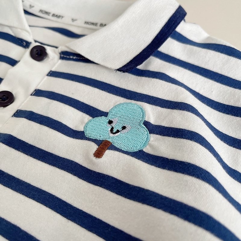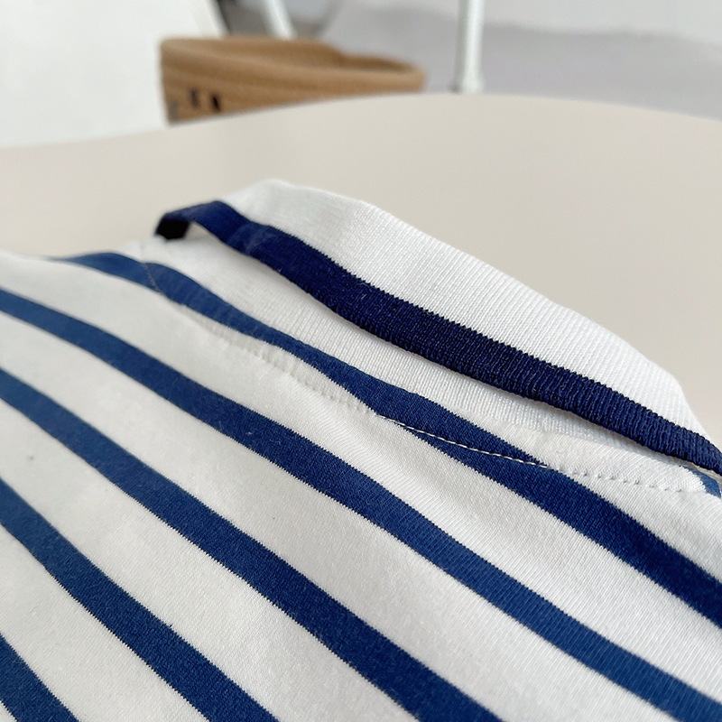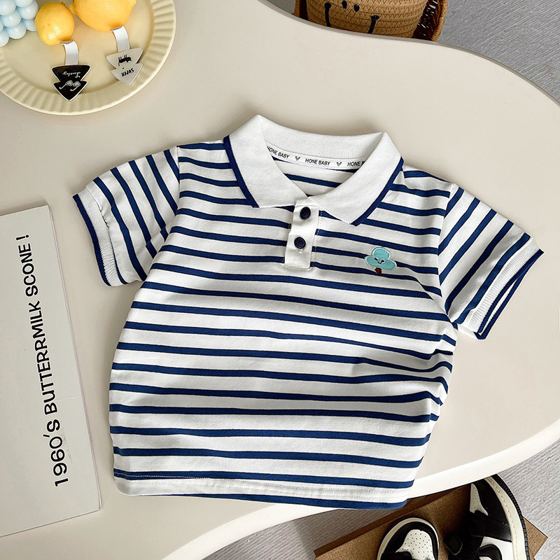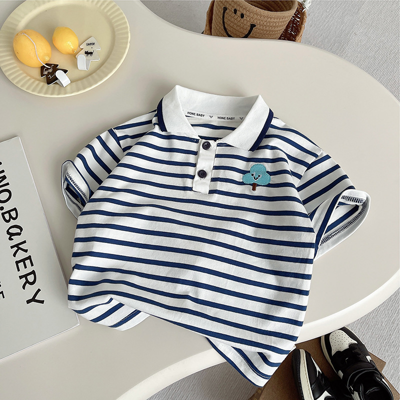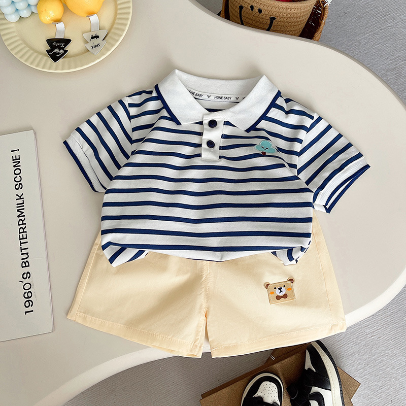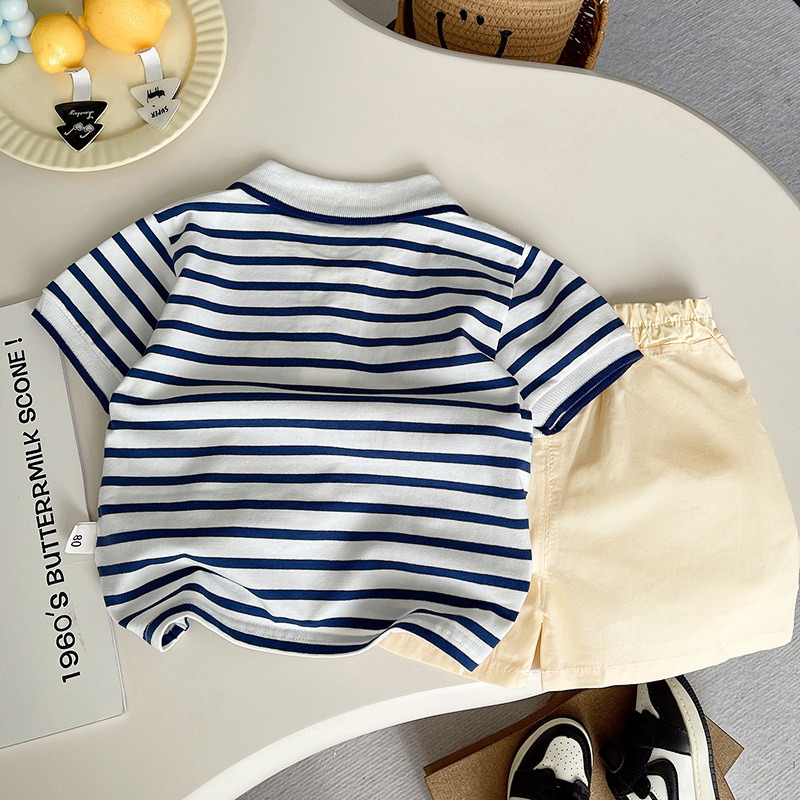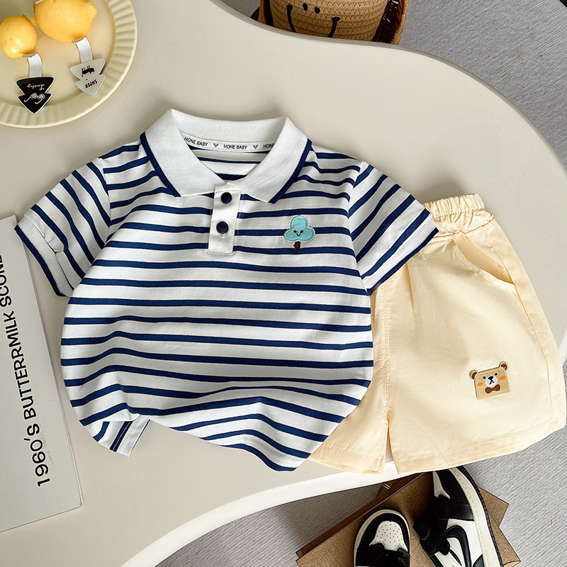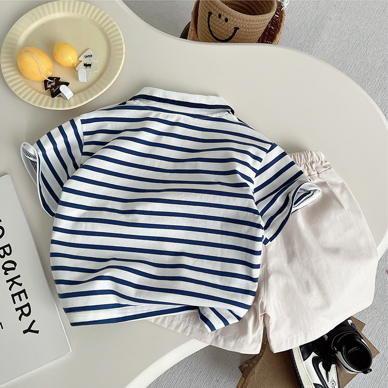 소년 여름 새 세트 옷깃 줄무늬 반팔 어린이 폴로 셔츠 탑 캐주얼 올 매치 반바지 투피스 세트