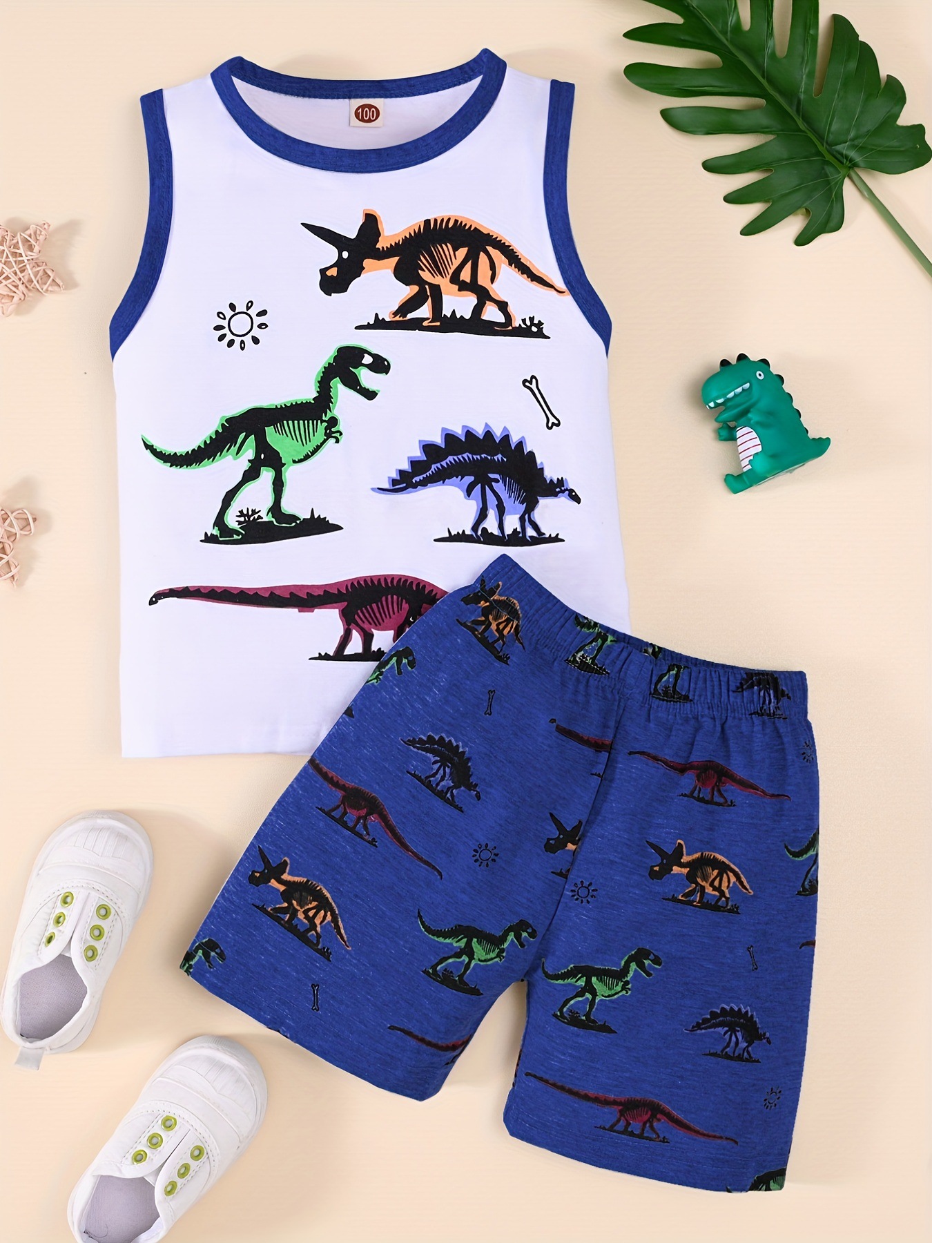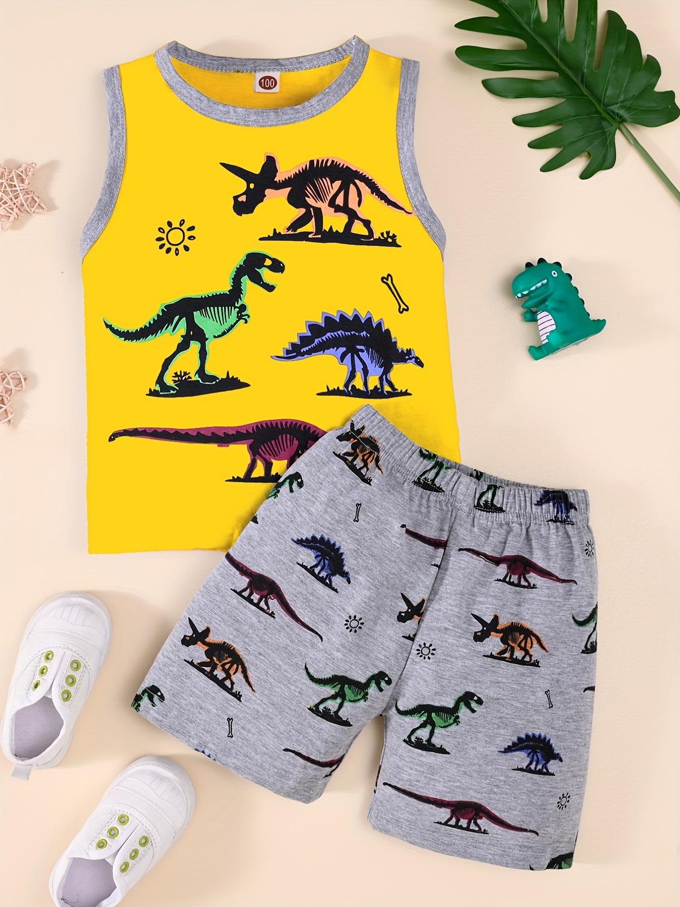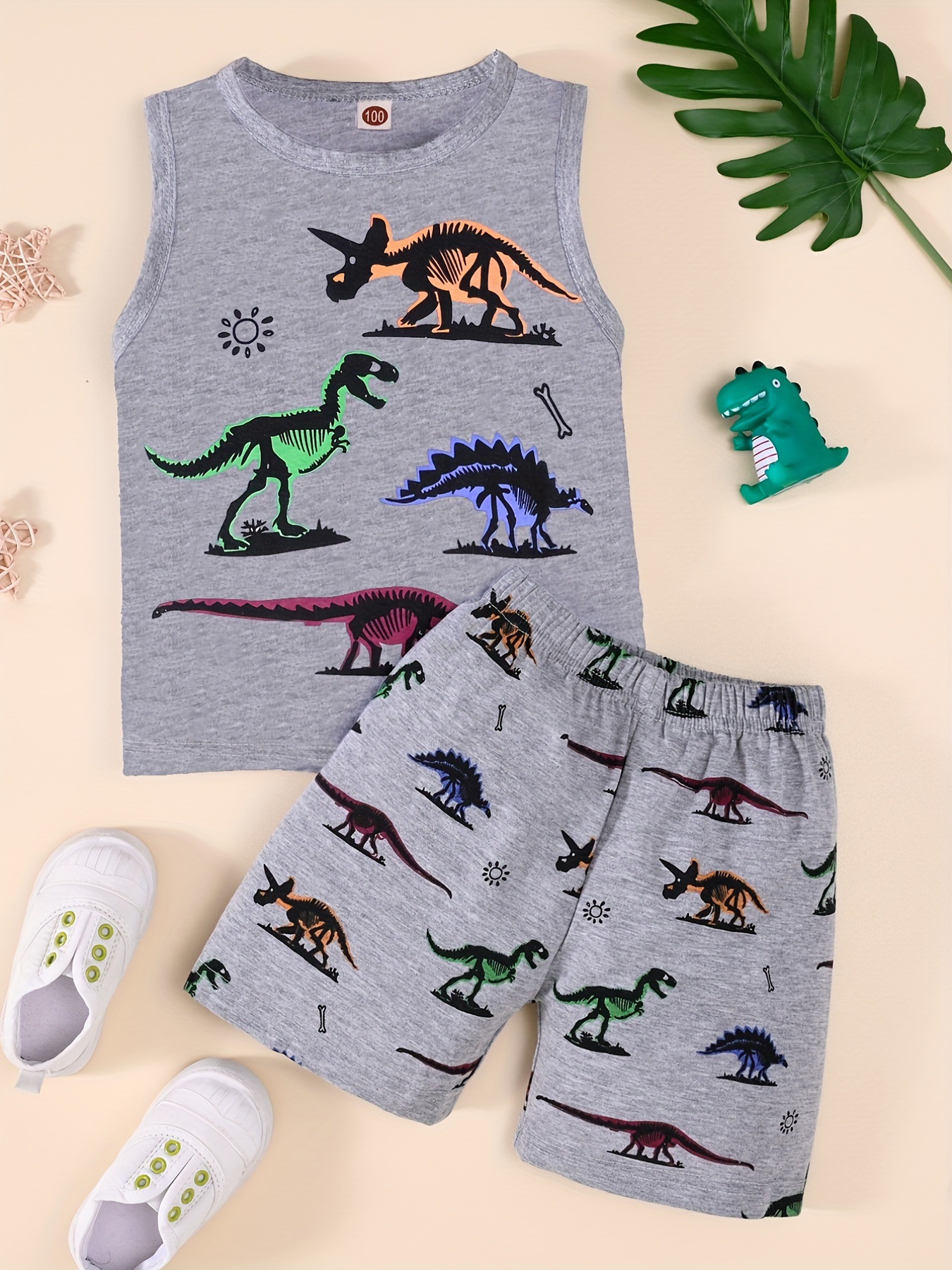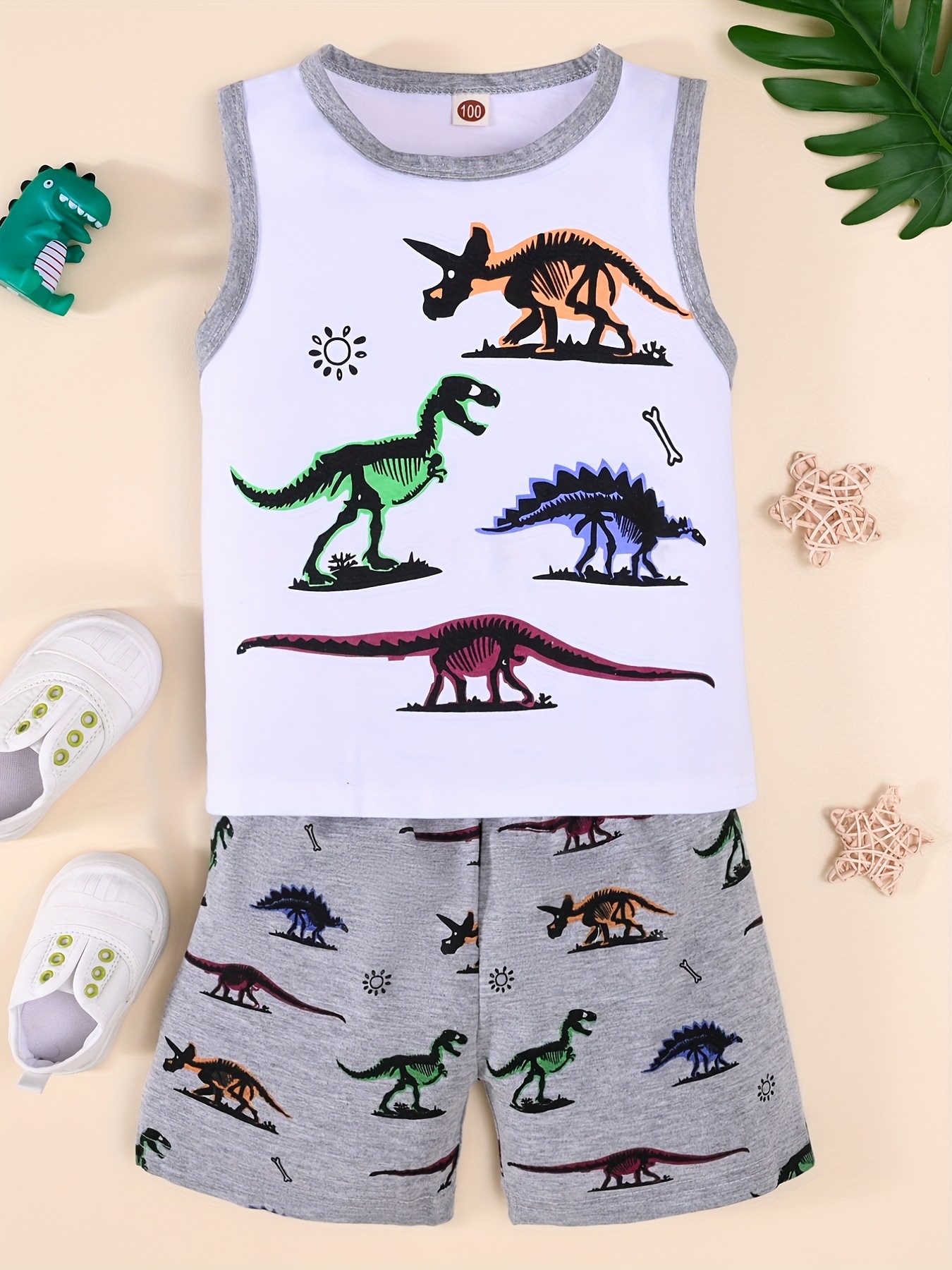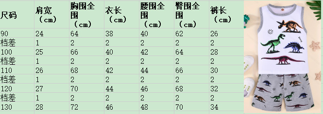 2025 봄 여름 트렌드 패션 소년 민소매 조끼 동물 다채로운 공룡 프린트 반바지 투피스 세트스토어 가기