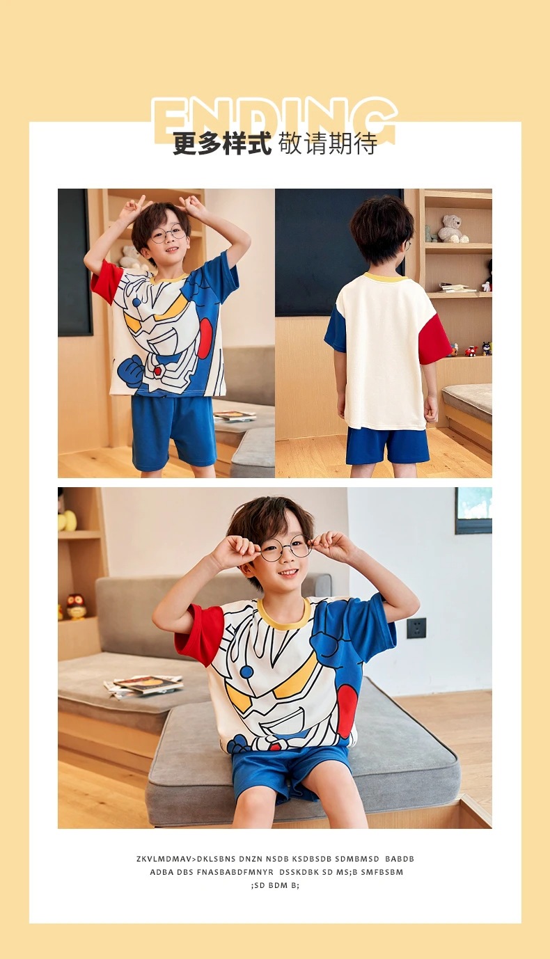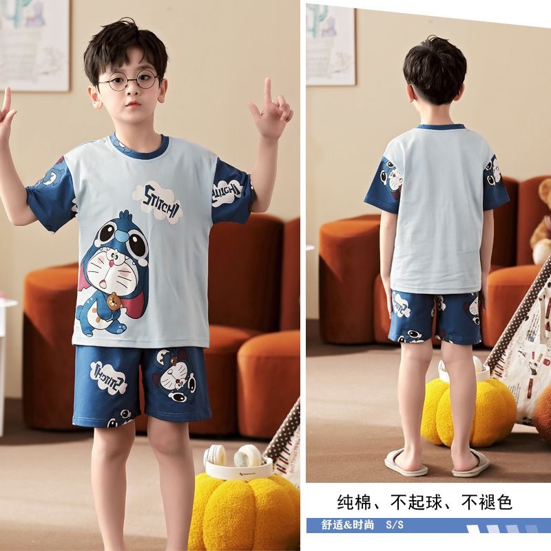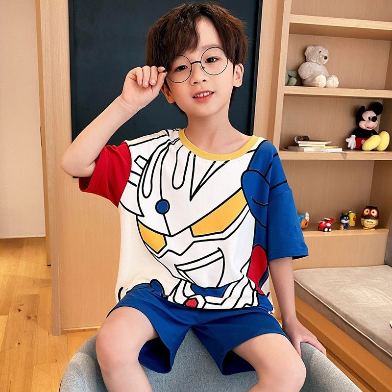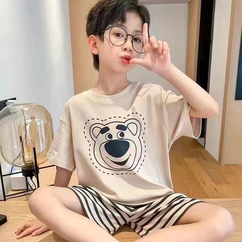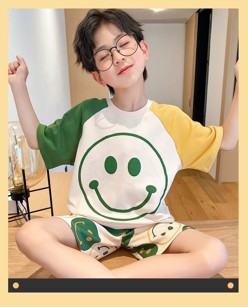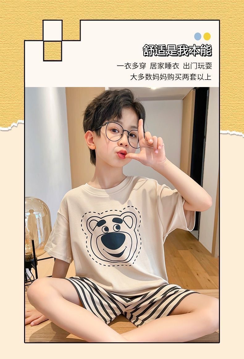 2025 새로운 어린이 잠옷 여름 모조 면화 반팔 얇은 양복 소년 소년 큰 어린이 청소년 가정 의류스토어 가기