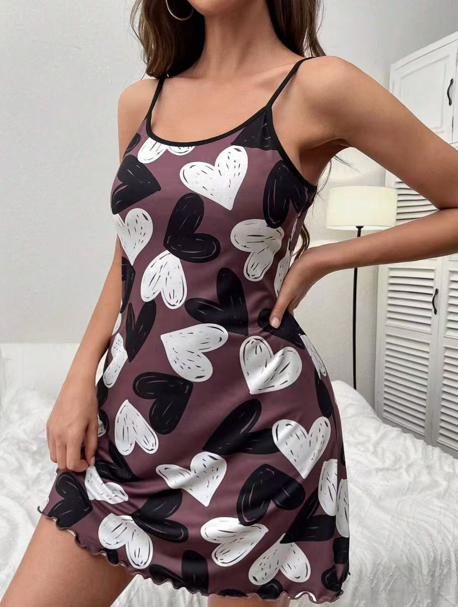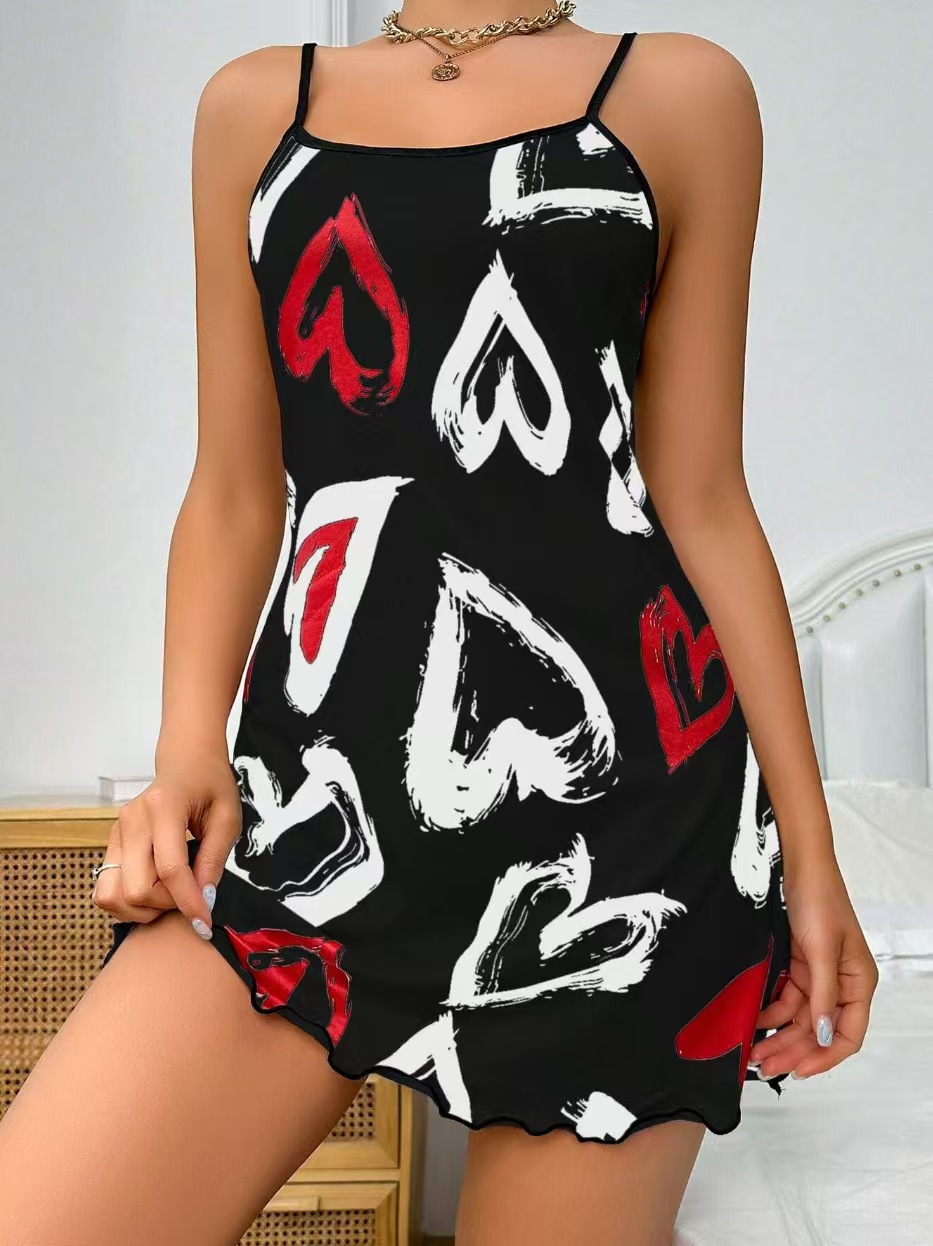 2025 대외 무역 유럽과 미국의 새로운 발렌타인 데이 레드 러브 프린트 서스펜더 잠옷 여성 홈웨어 도매