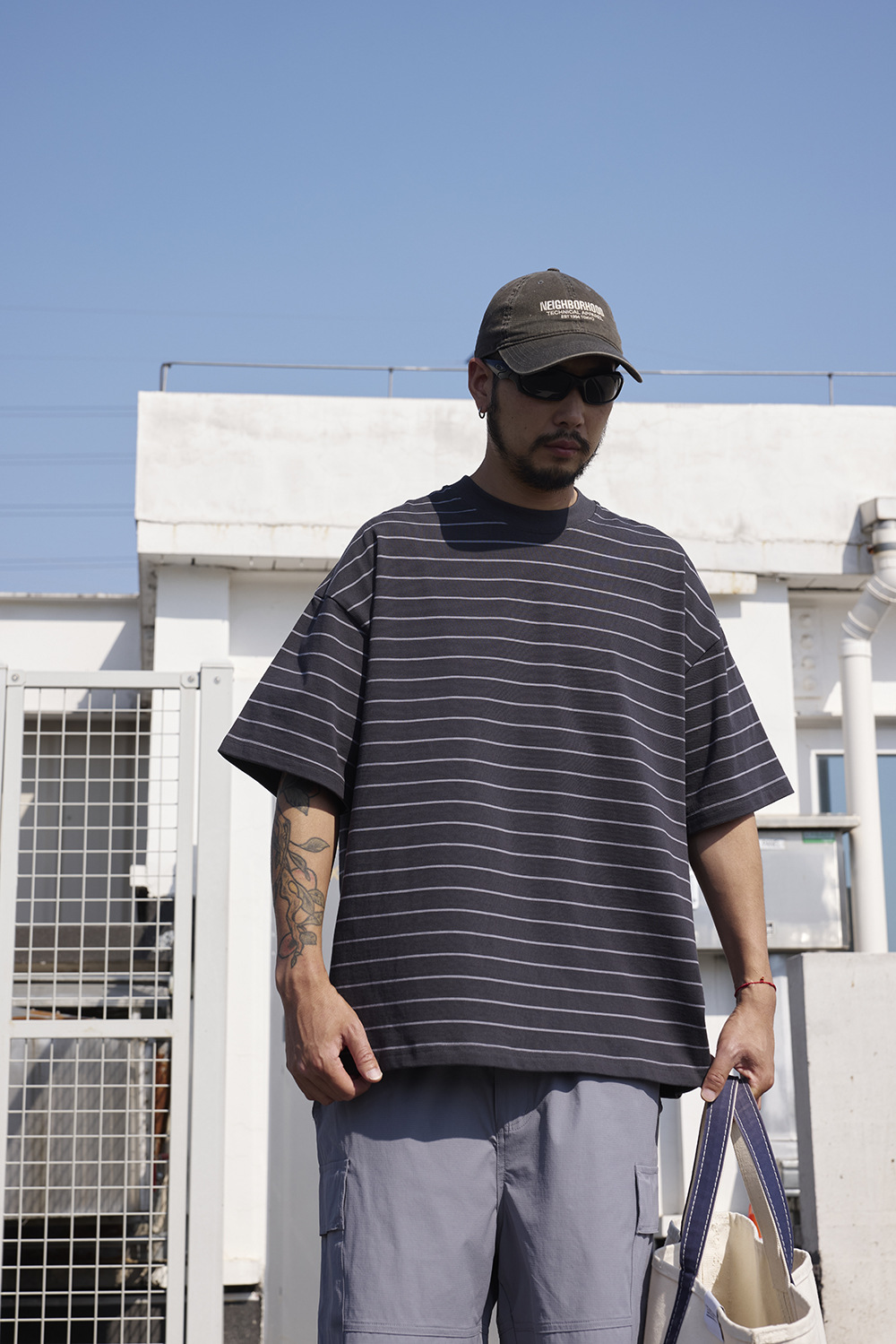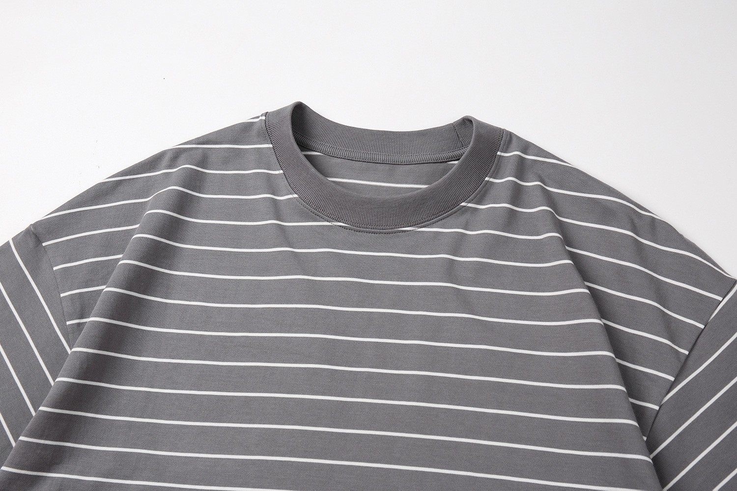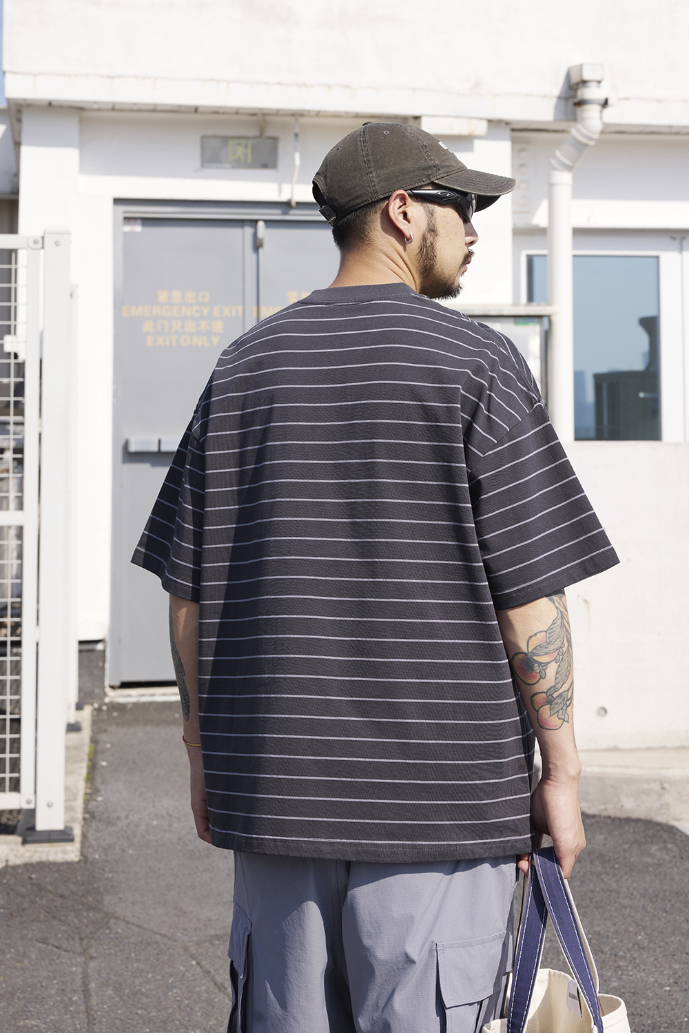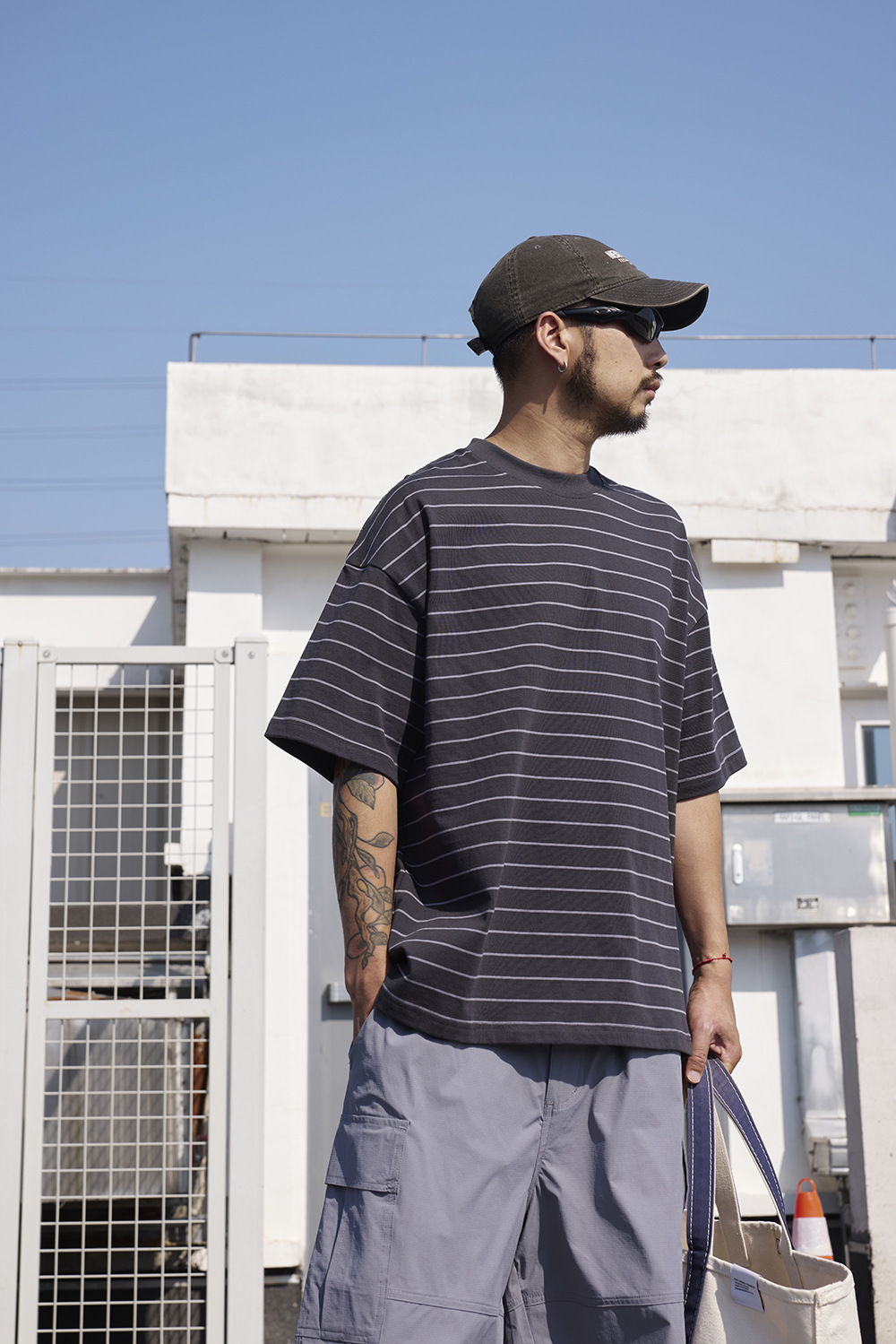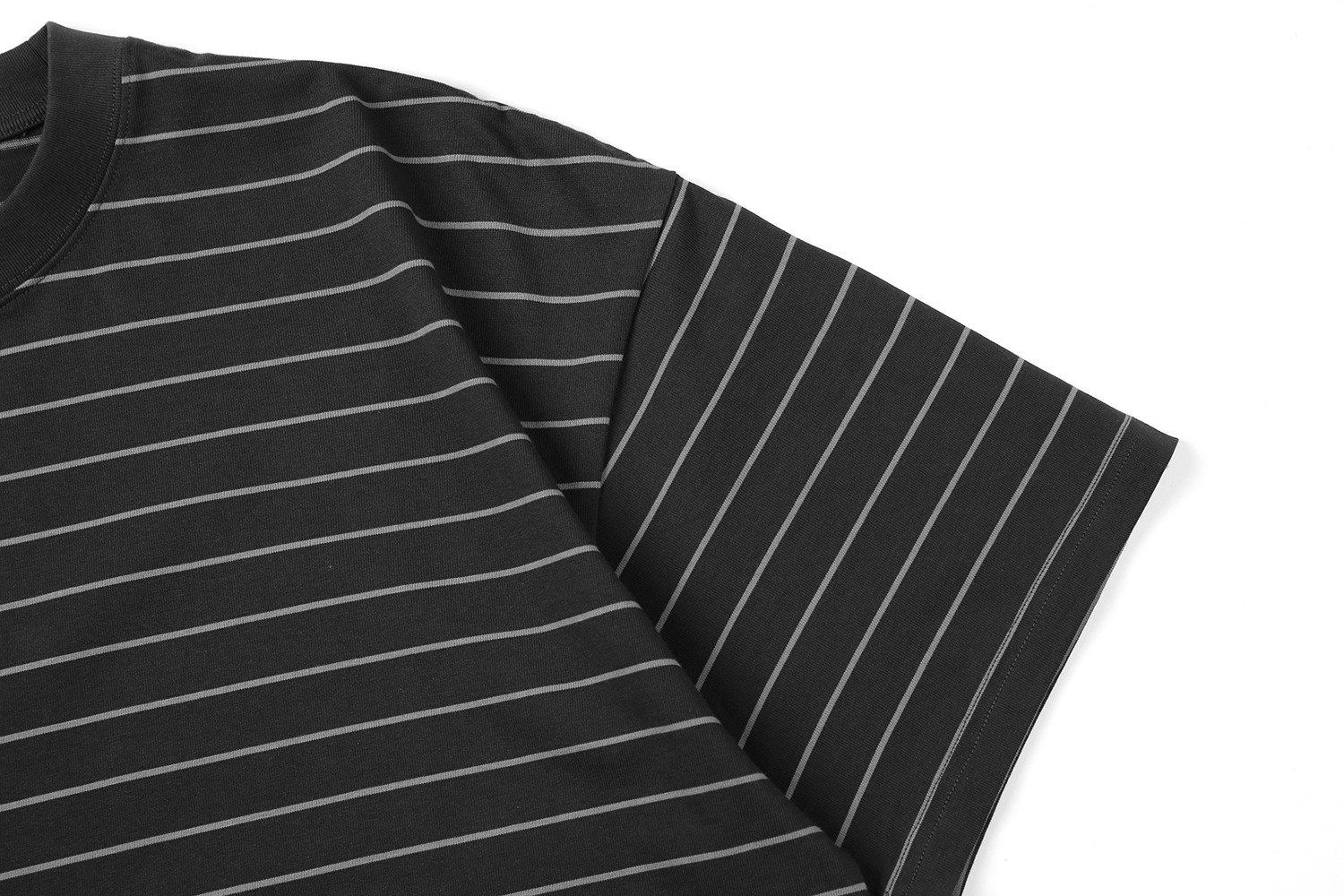 TRS 일본 패션 시리즈 | 26SS 맞춤 제작 310G 더블얀 라운드넥 스트라이프 반팔 루즈핏 드롭숄더 5부소매 티셔츠 남성용스토어 가기