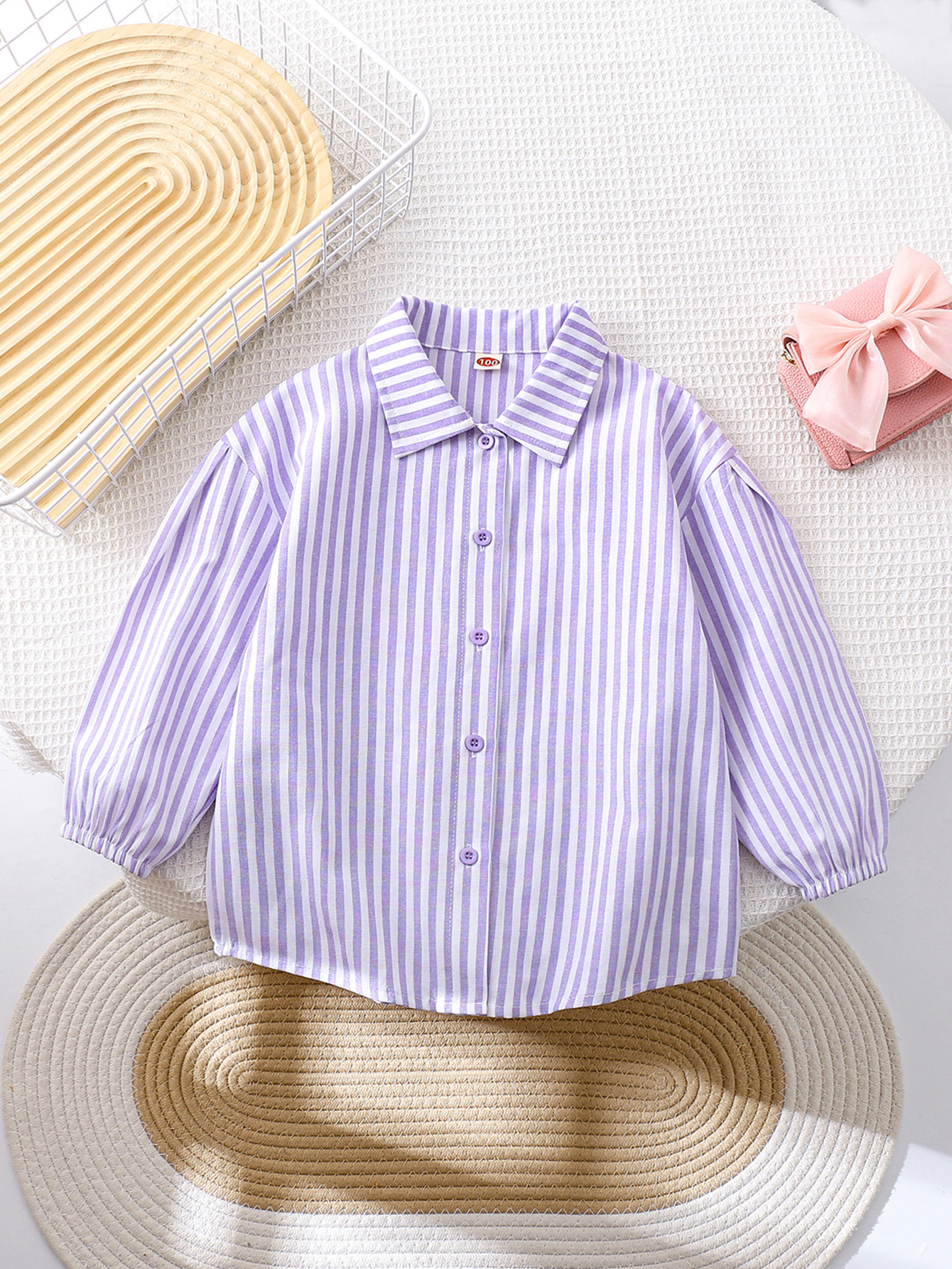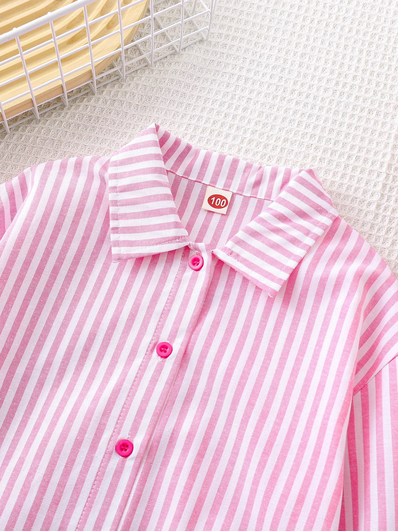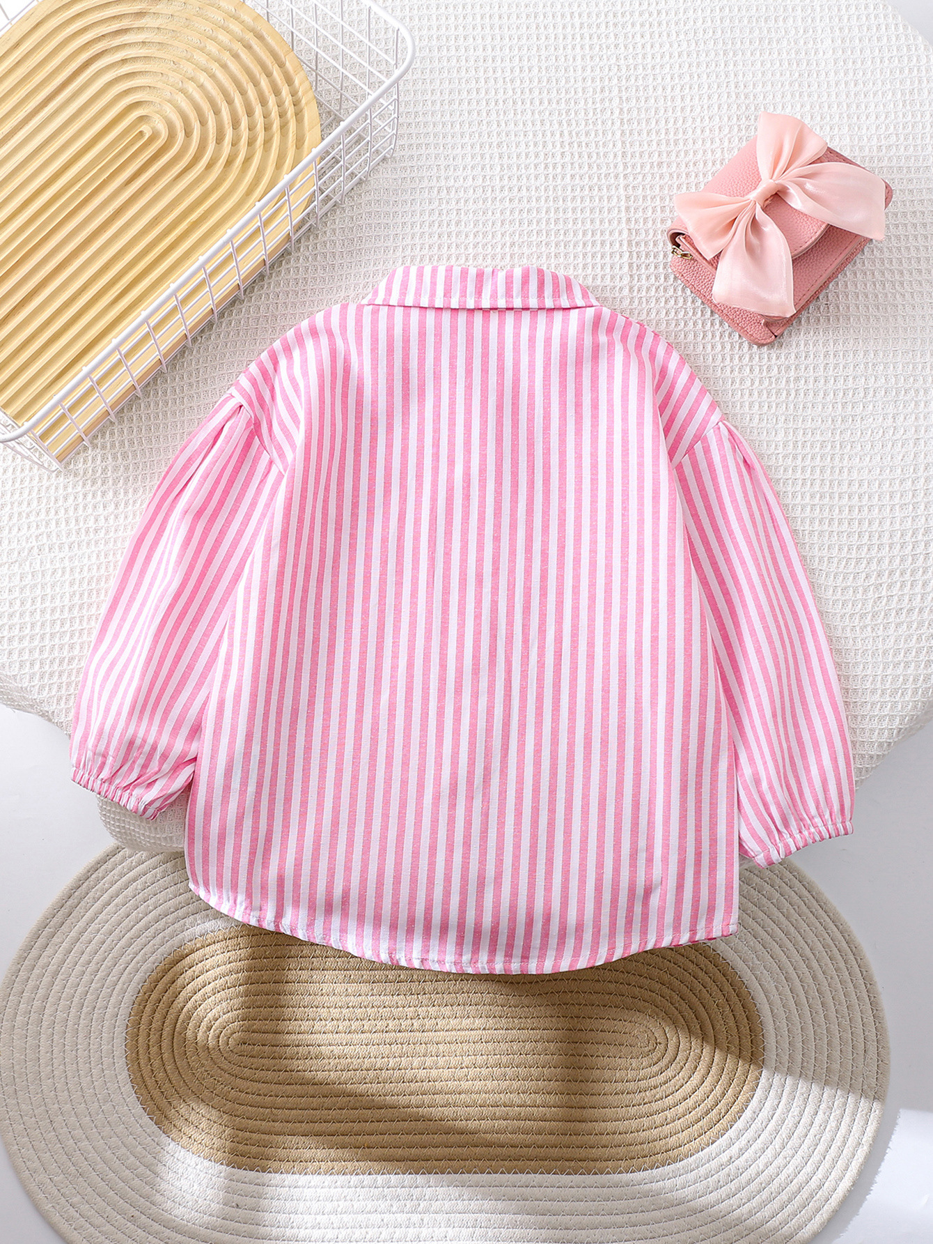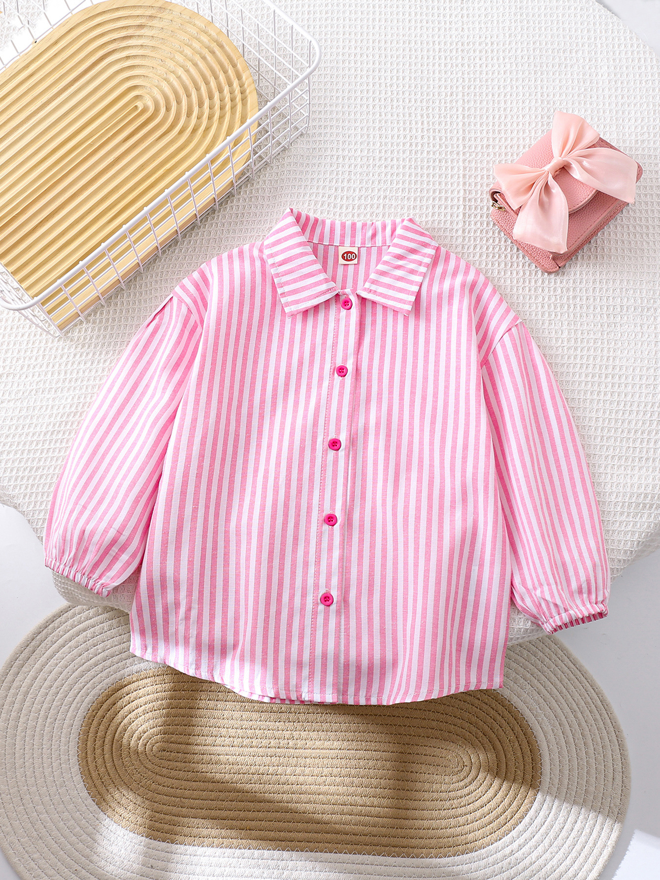국경 간 대외 무역 소녀 봄, 가을 긴팔 핑크 줄무늬 셔츠 오프 숄더 슬리브 버튼 디자인 루즈 탑스토어 가기