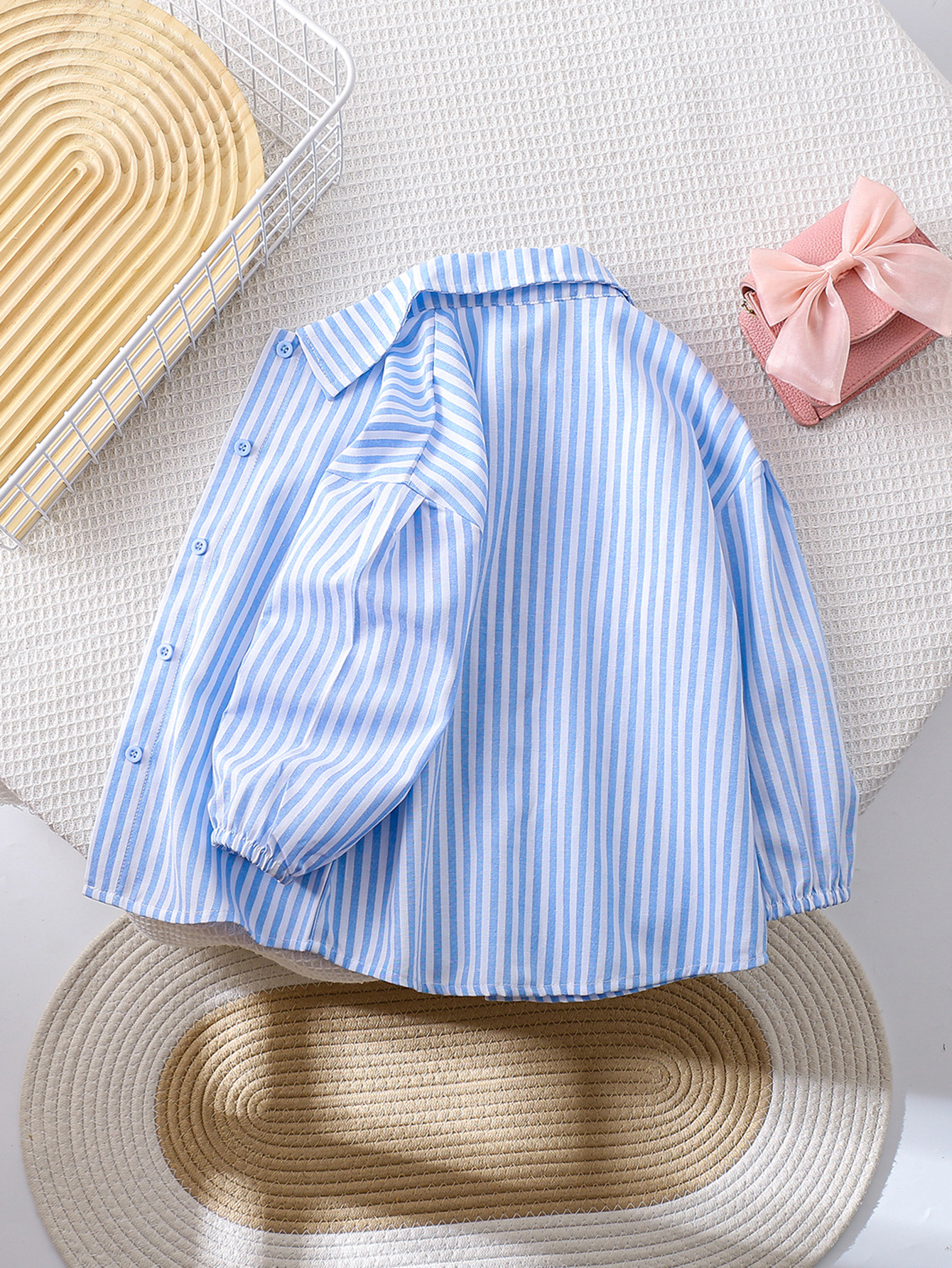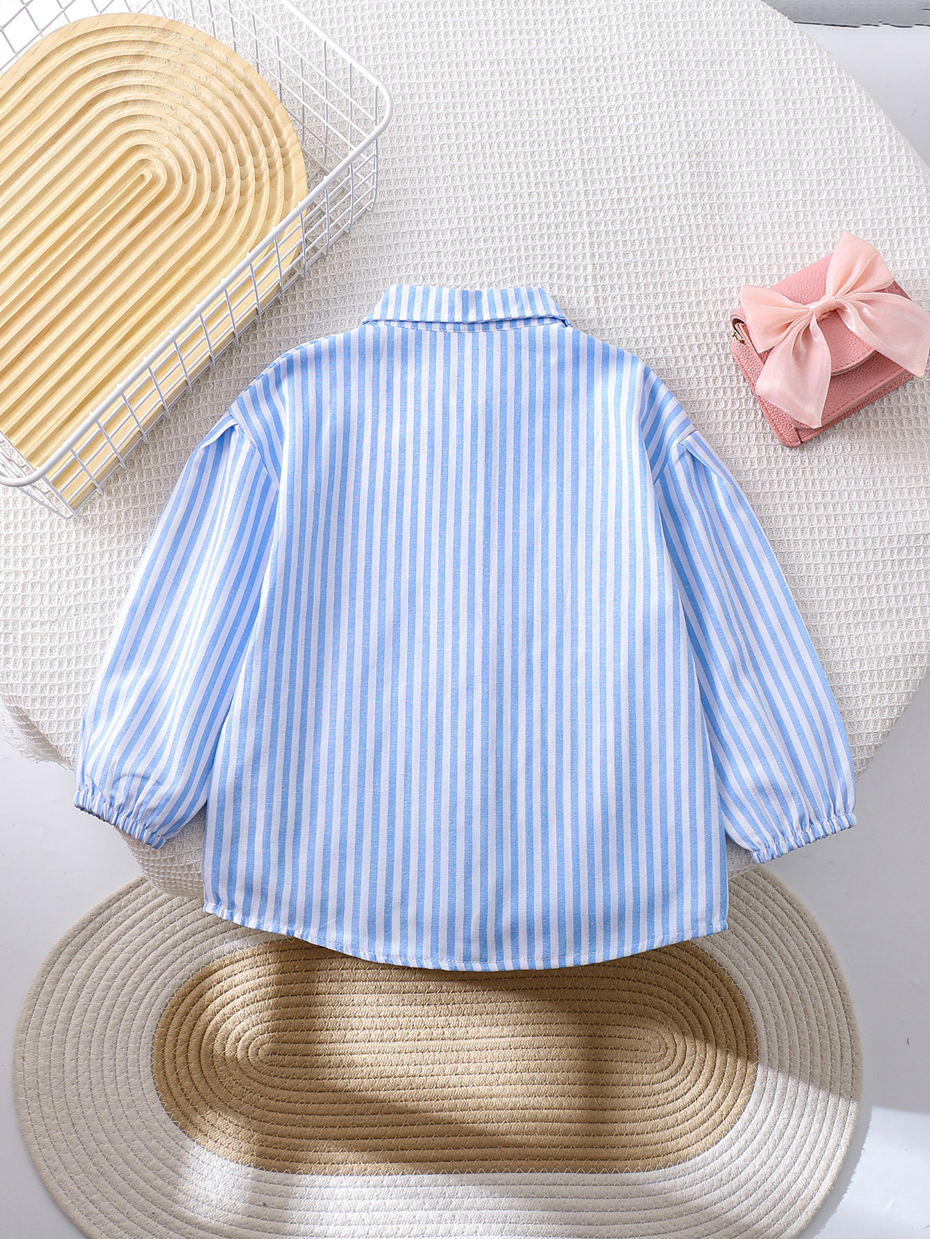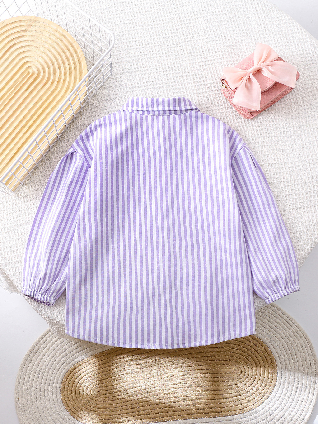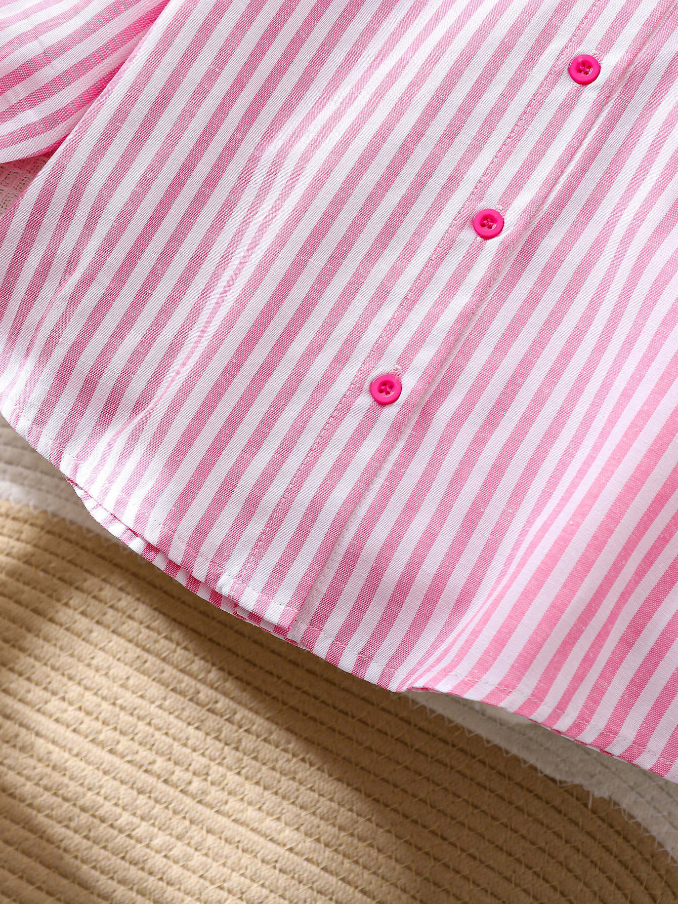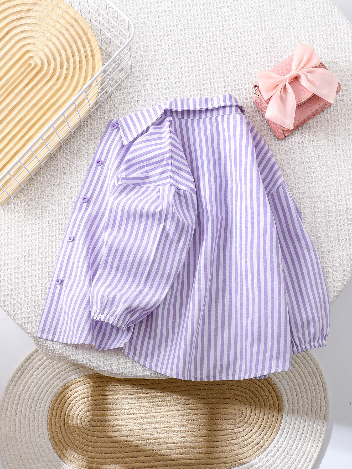 국경 간 대외 무역 소녀 봄, 가을 긴팔 핑크 줄무늬 셔츠 오프 숄더 슬리브 버튼 디자인 루즈 탑스토어 가기