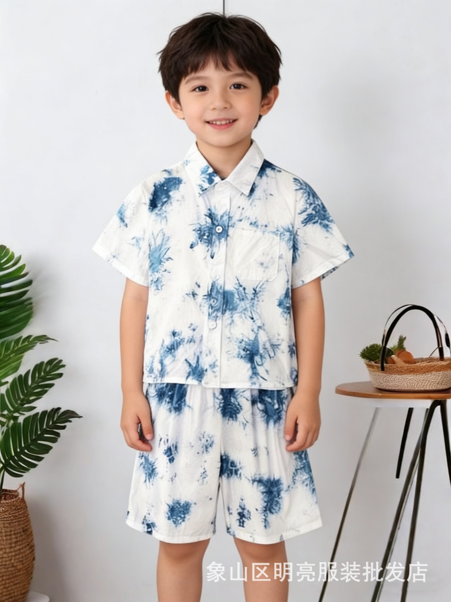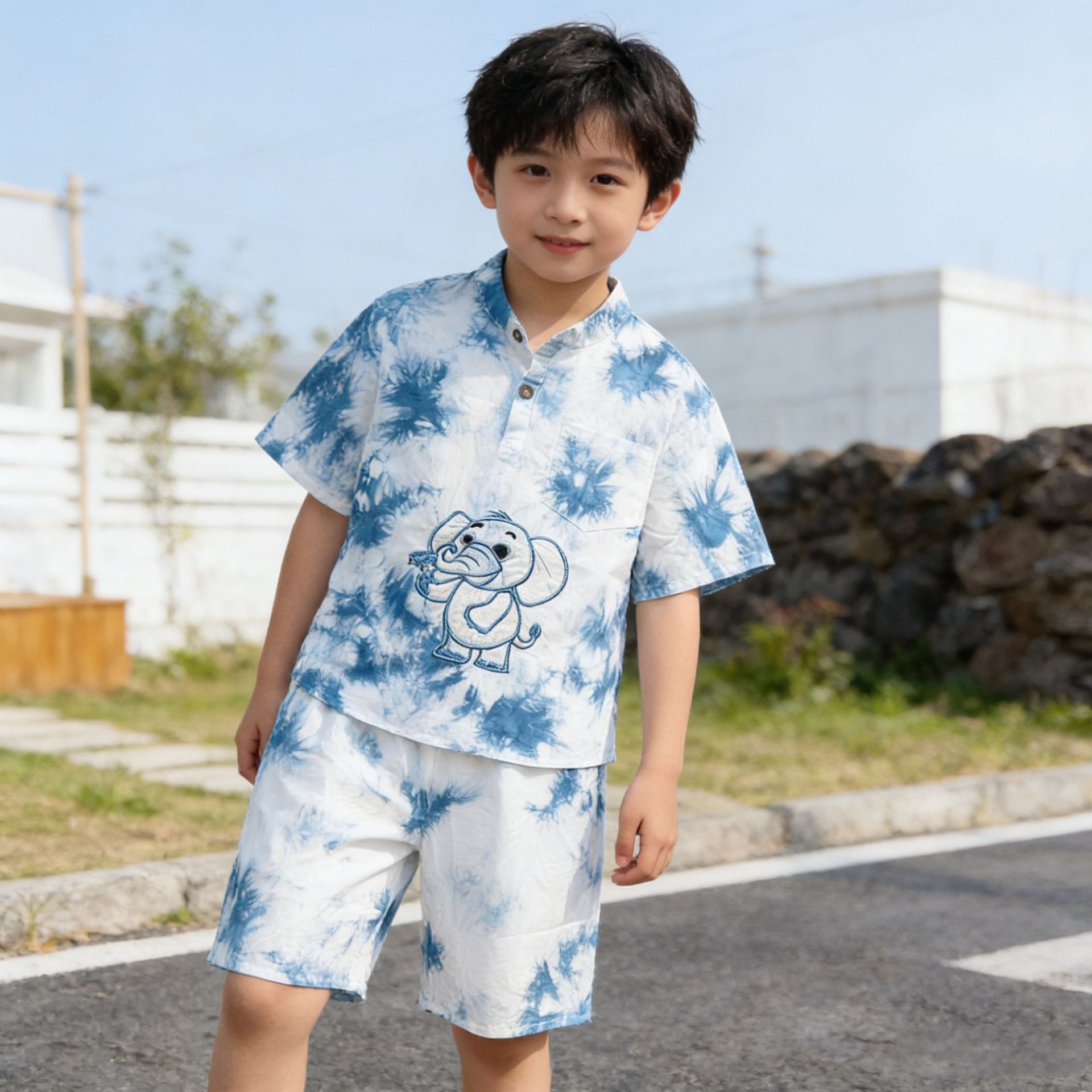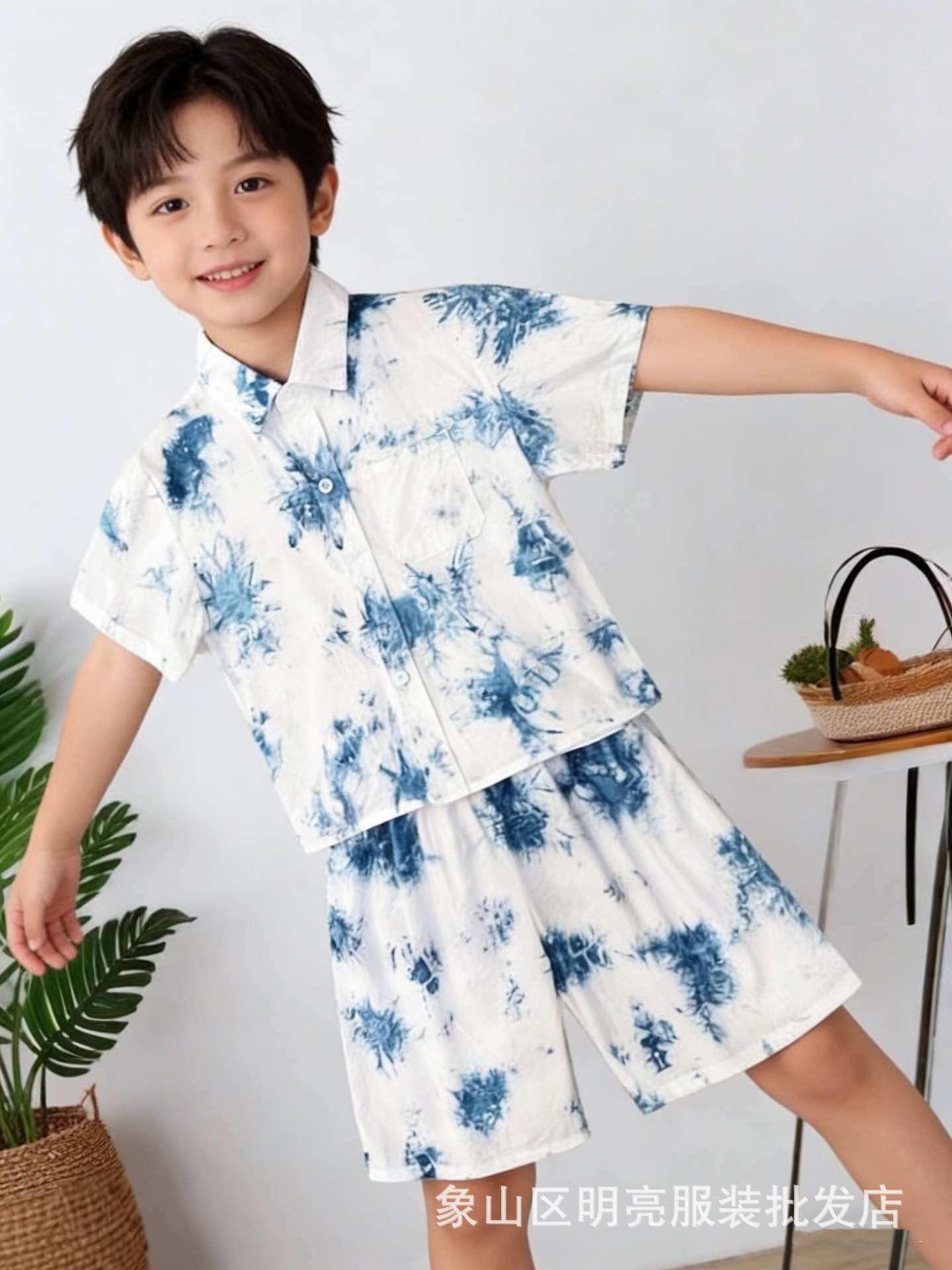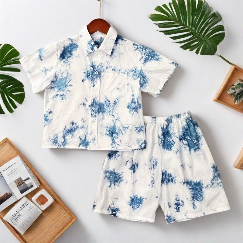 타이 염색 코튼 셔츠 여름 민족 스타일 수제 타이 염색 소년 셔츠 세트 통기성 편안한 여행 레저