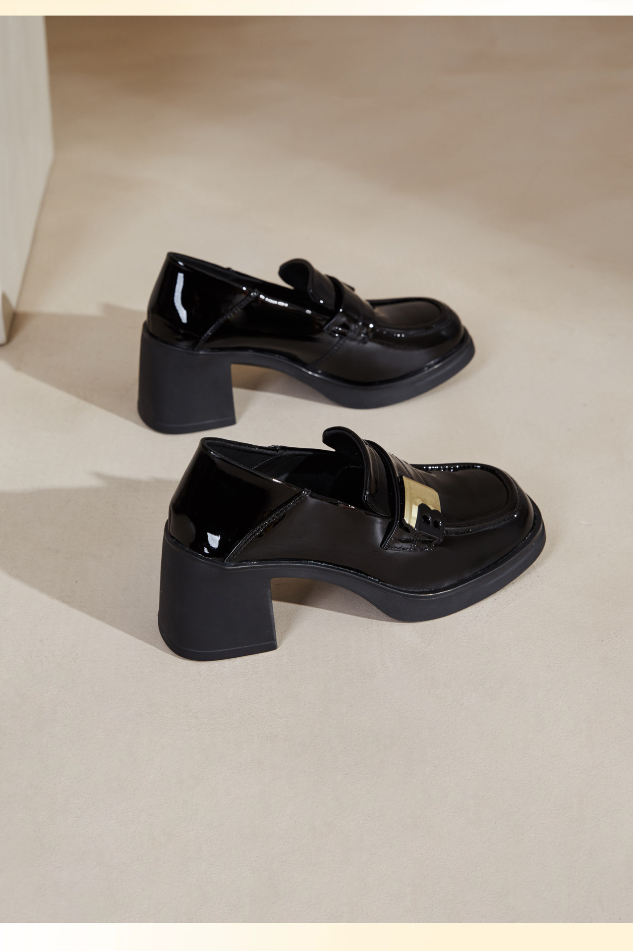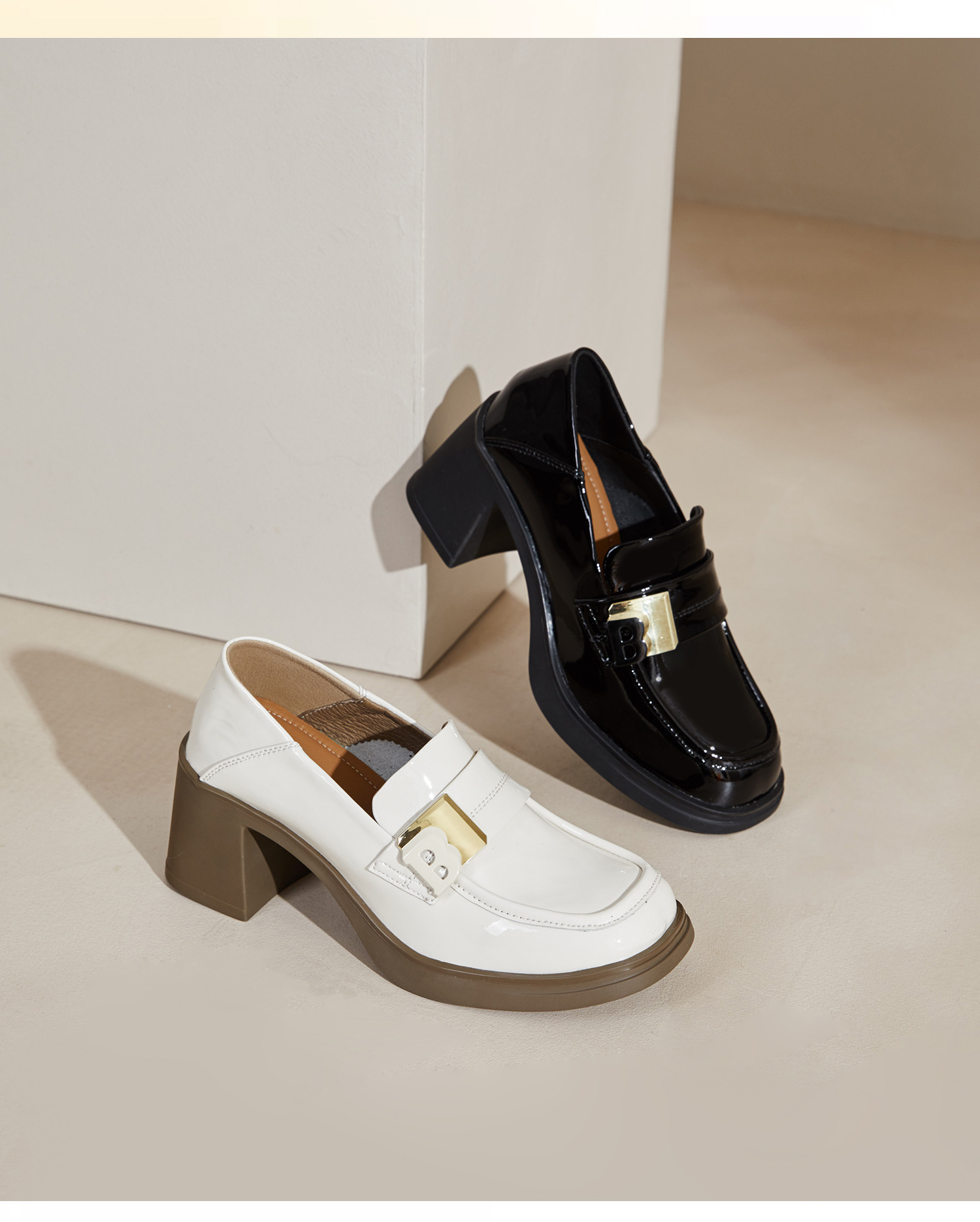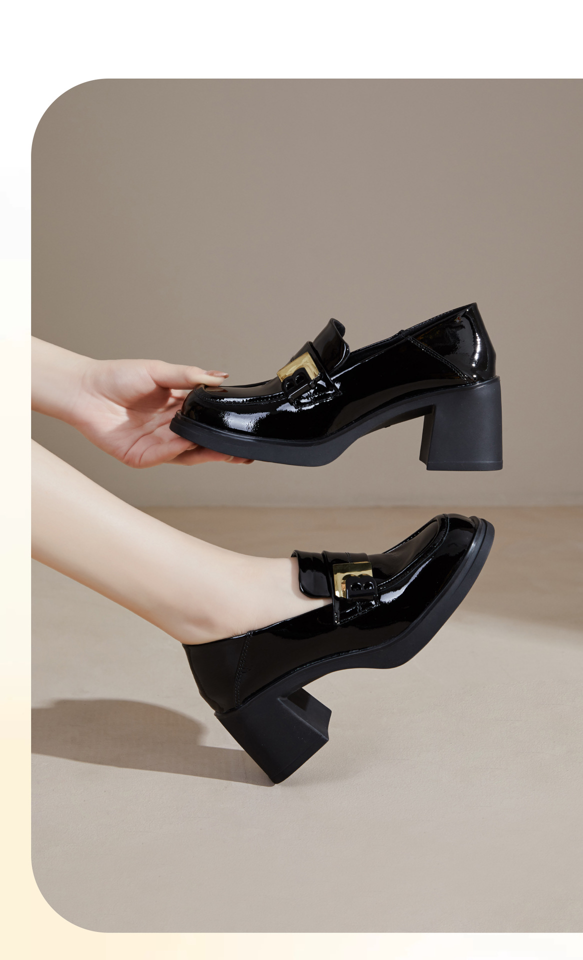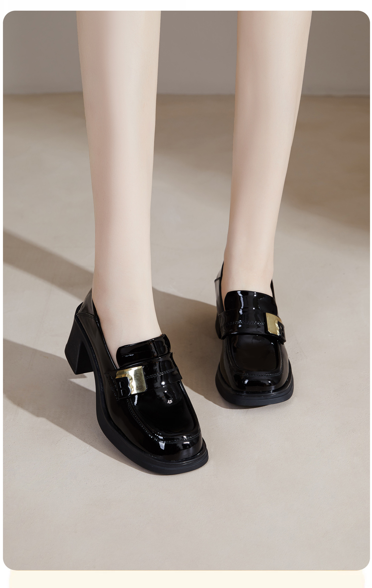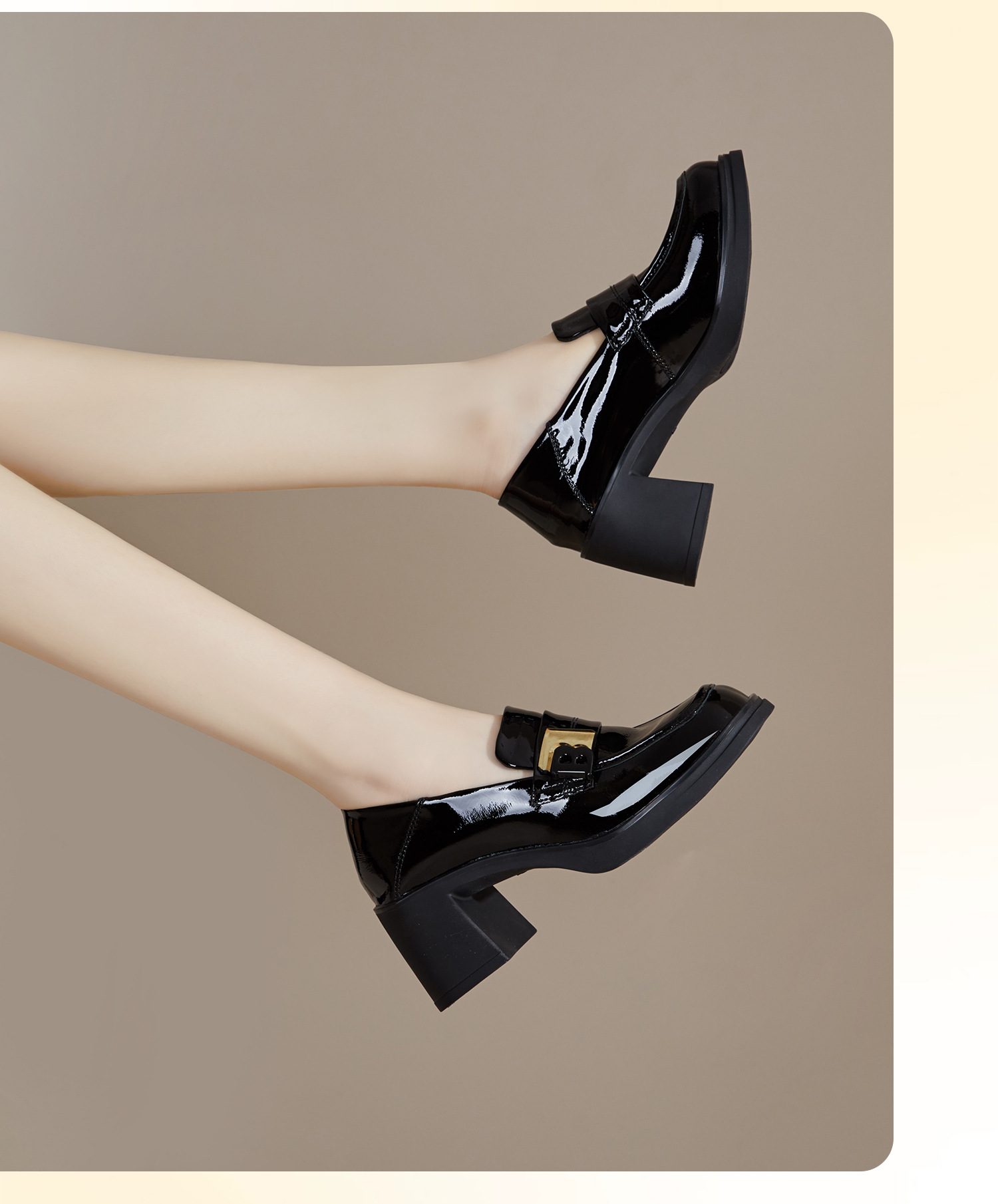 봄 2025 새로운 특허 가죽 굵은 뒤꿈치 여성 스퀘어 헤드 원 페달 가죽 로퍼 영국식 가죽 신발스토어 가기