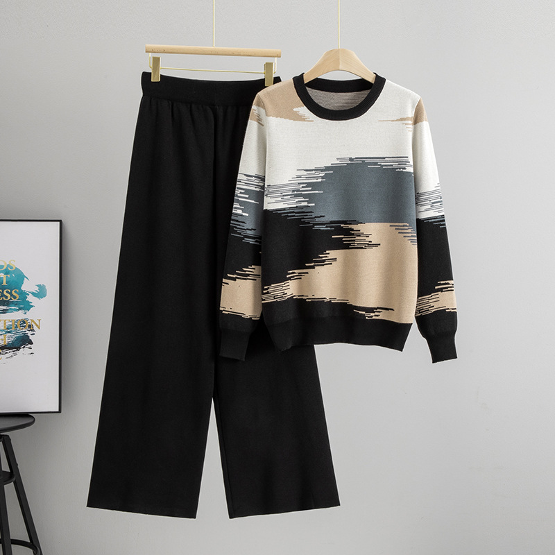 국경 2025 가을과 겨울 새로운 컬러 매칭 스웨터 바지 여성 세트 플러스 사이즈 슬리밍 우아한 캐주얼 니트 투피스 세트