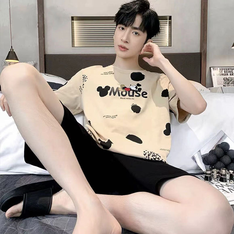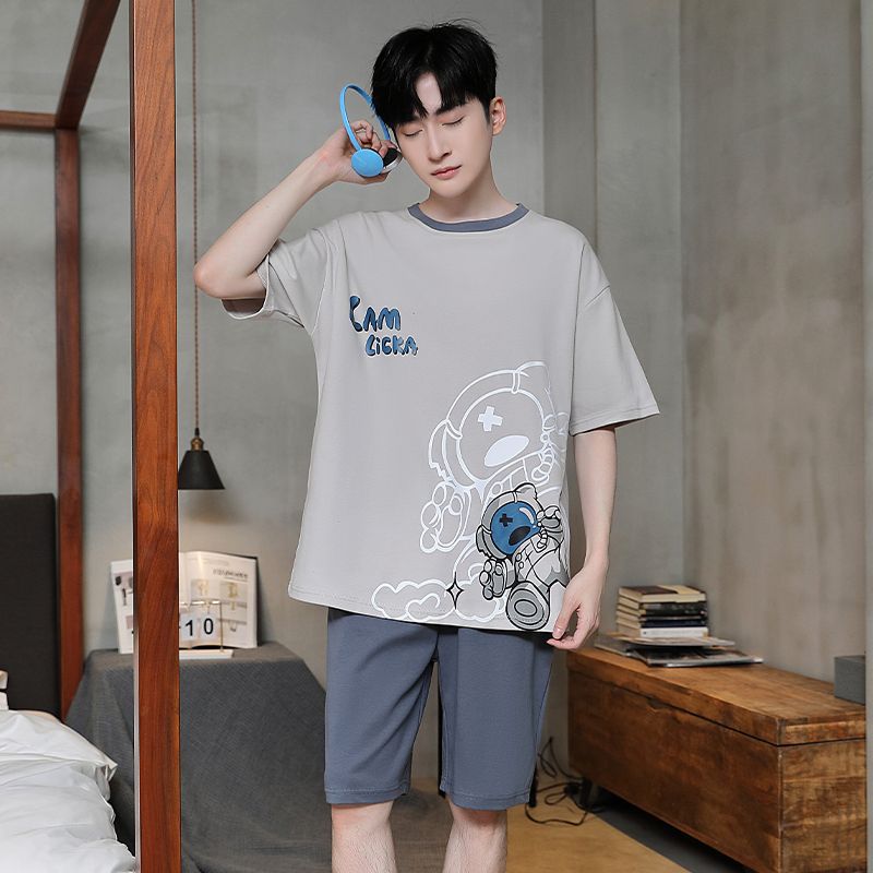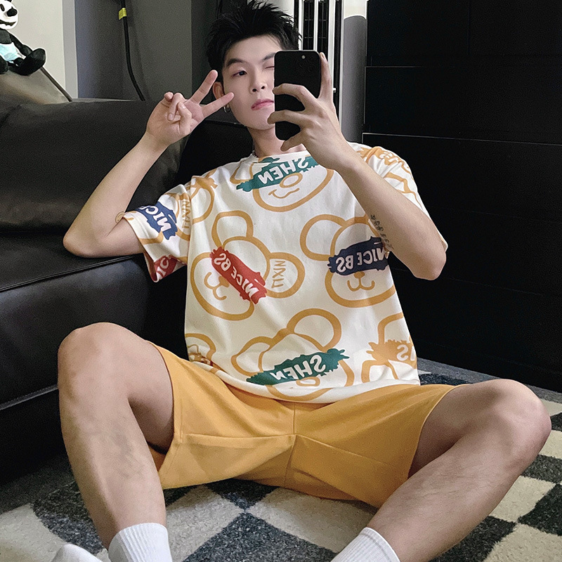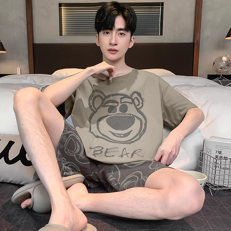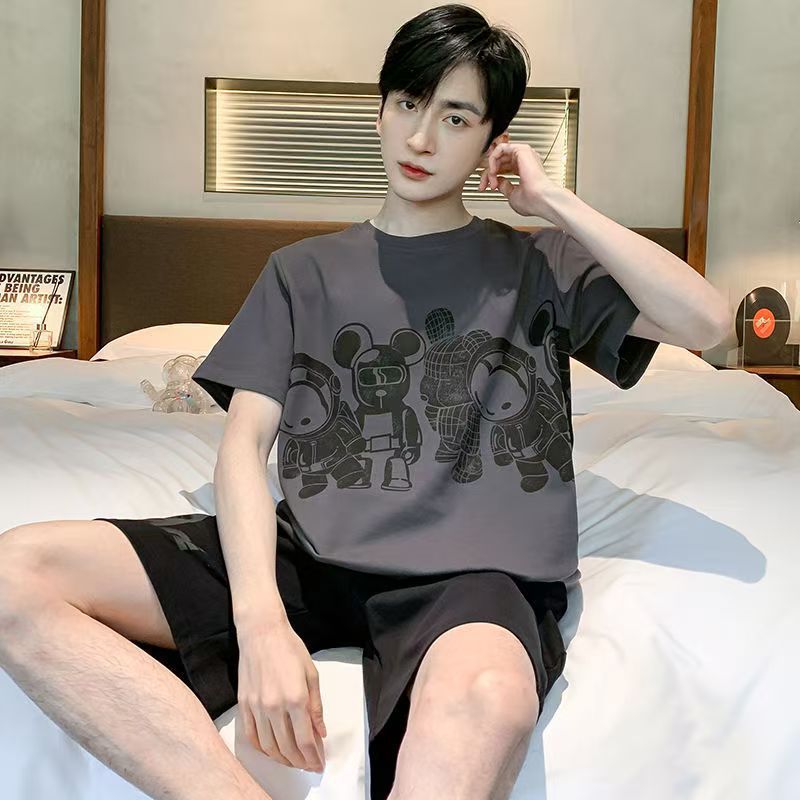국경 새 도착 잠옷 남자 여름 반팔 세트 한국식 느슨한 플러스 사이즈 만화 캐주얼 아웃웨어 홈 옷스토어 가기