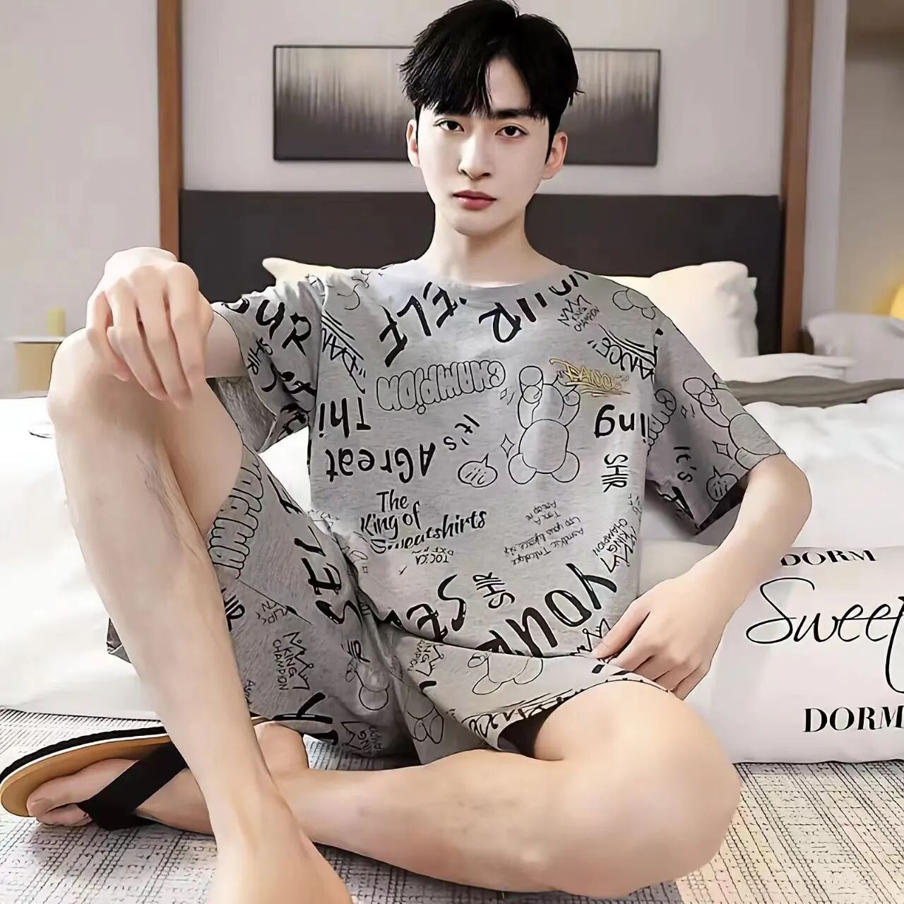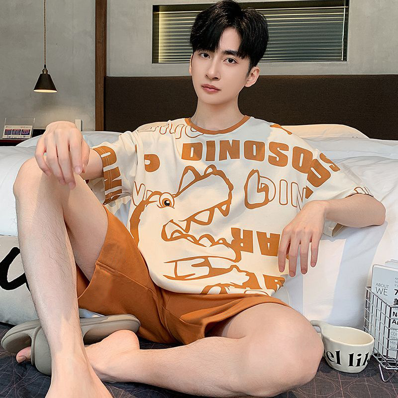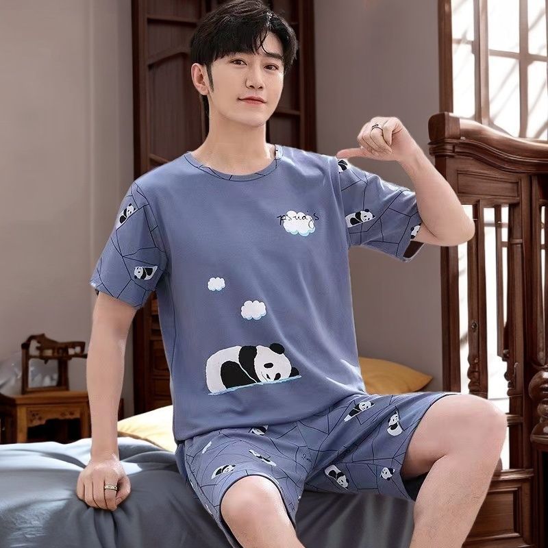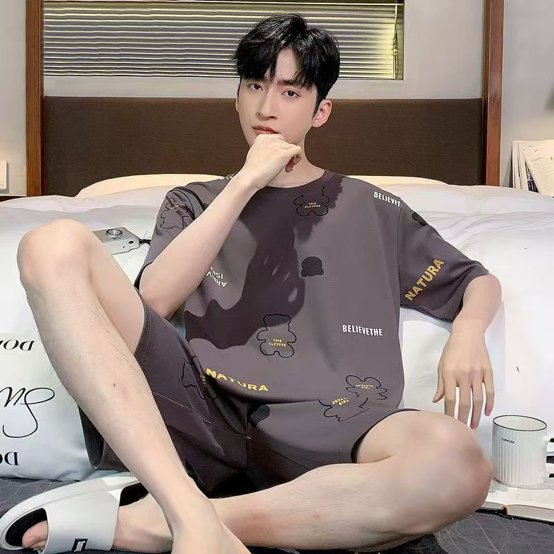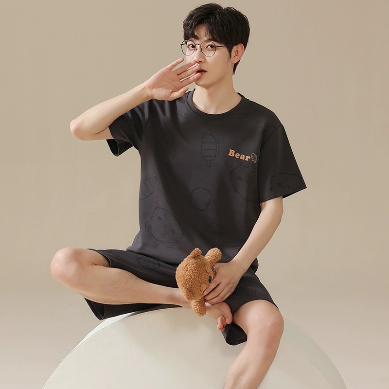 국경 새 도착 잠옷 남자 여름 반팔 세트 한국식 느슨한 플러스 사이즈 만화 캐주얼 아웃웨어 홈 옷스토어 가기