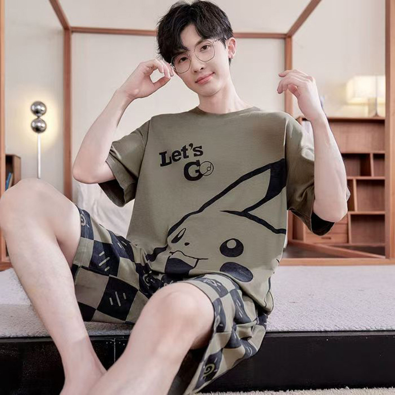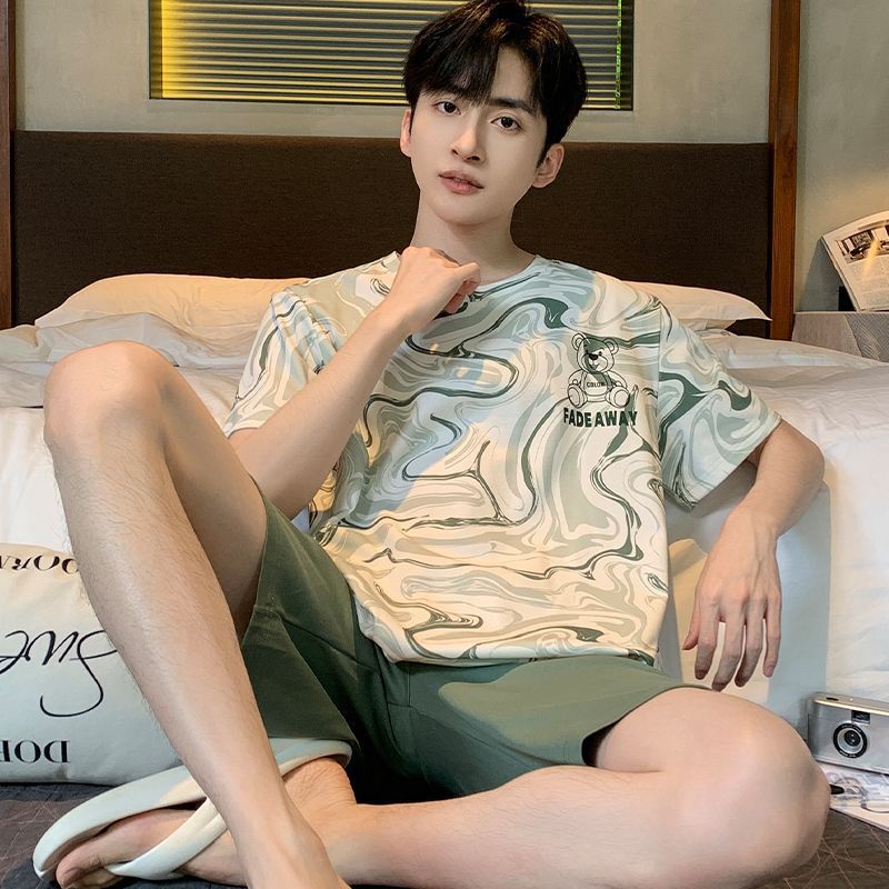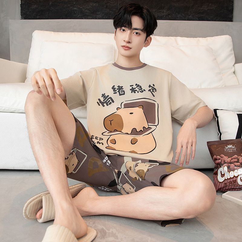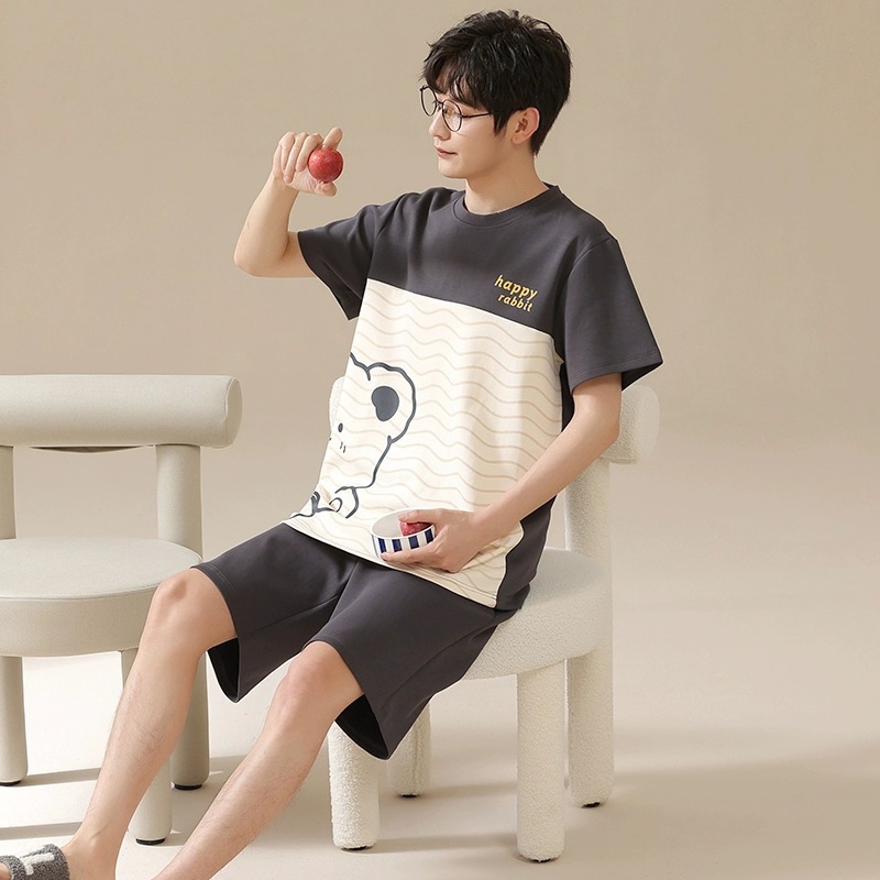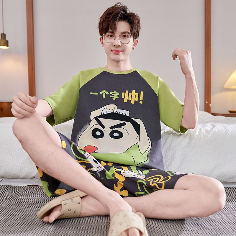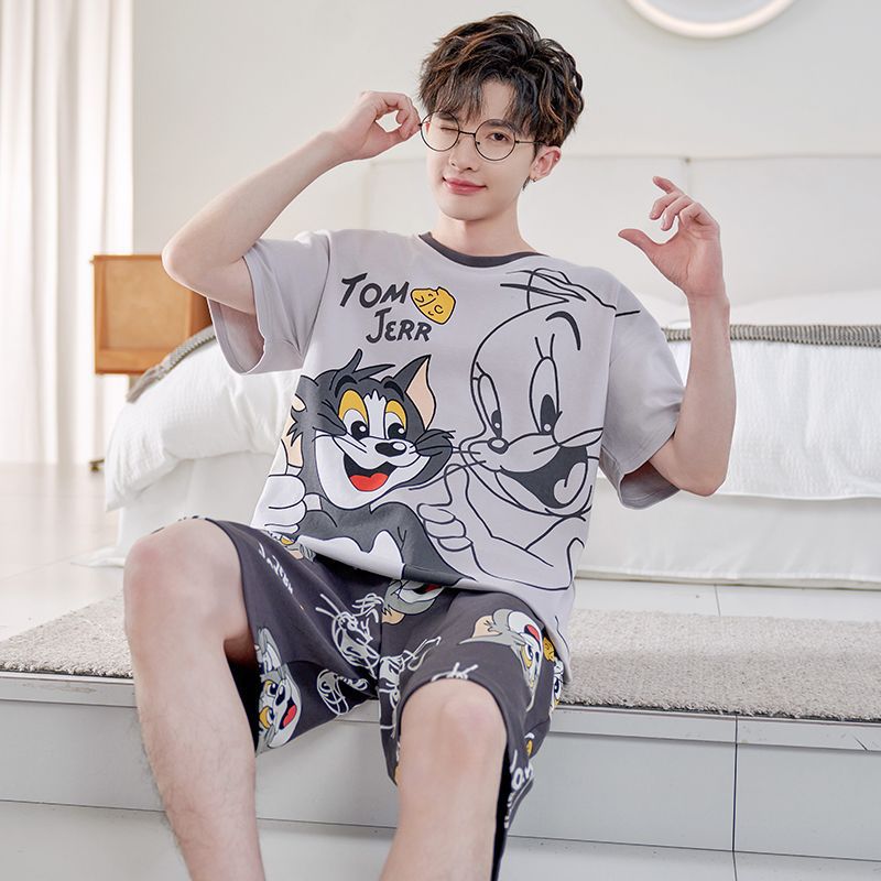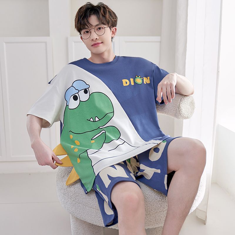 국경 새 도착 잠옷 남자 여름 반팔 세트 한국식 느슨한 플러스 사이즈 만화 캐주얼 아웃웨어 홈 옷
