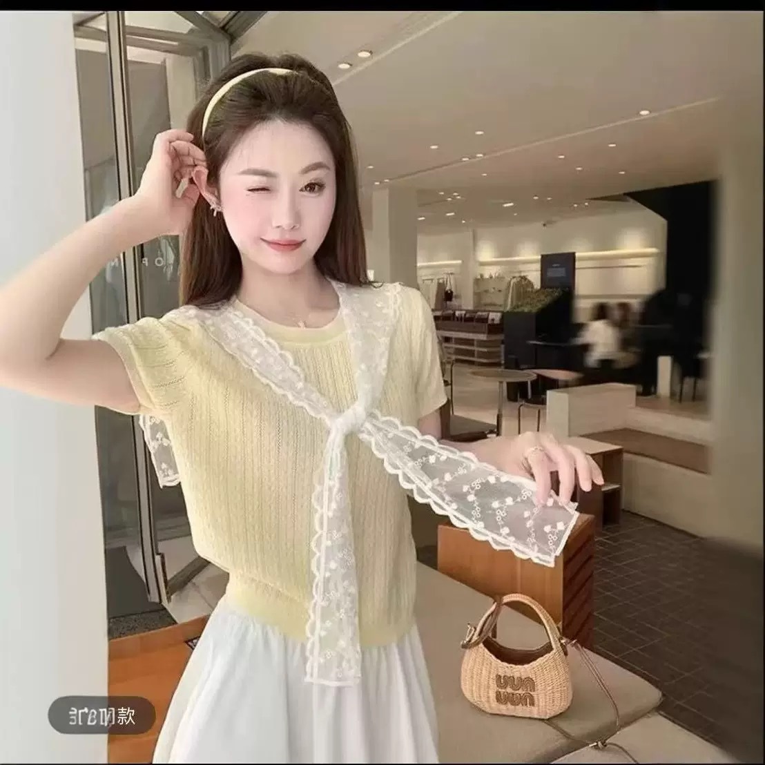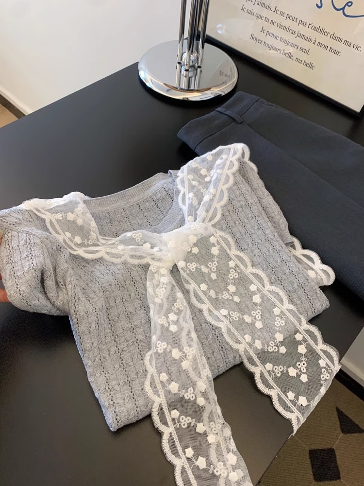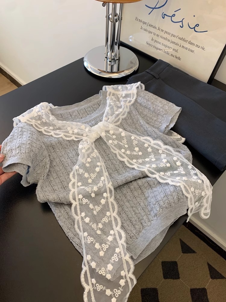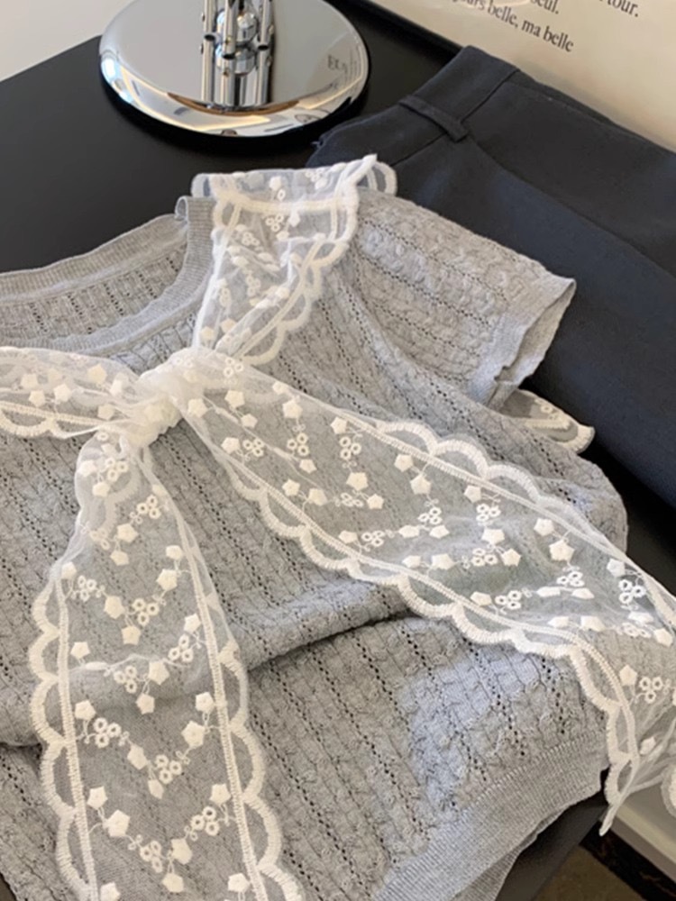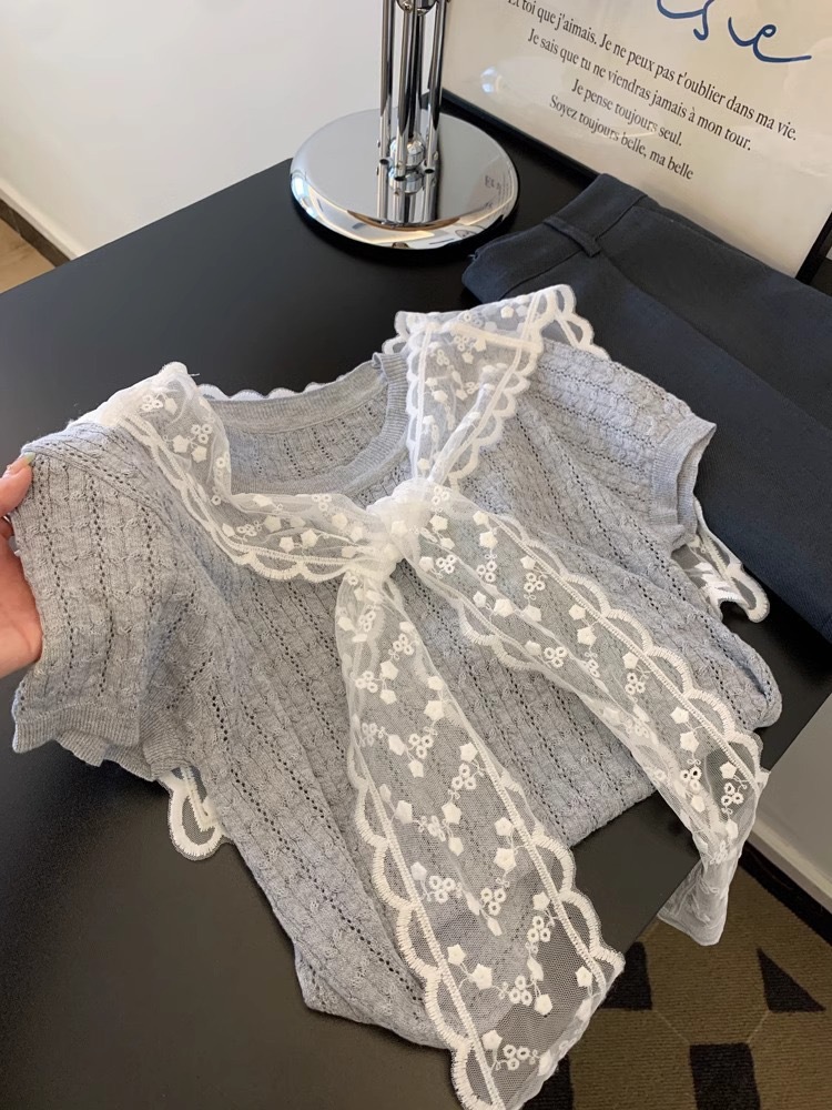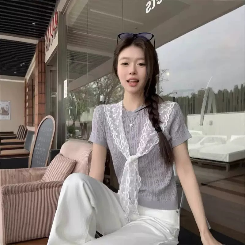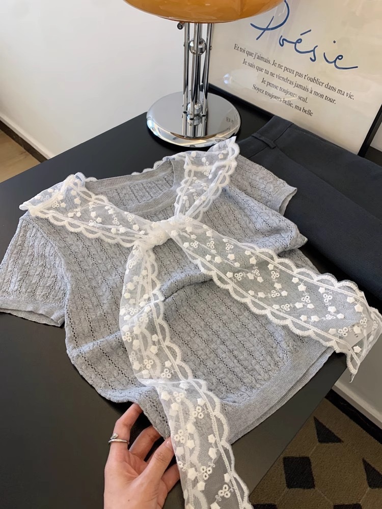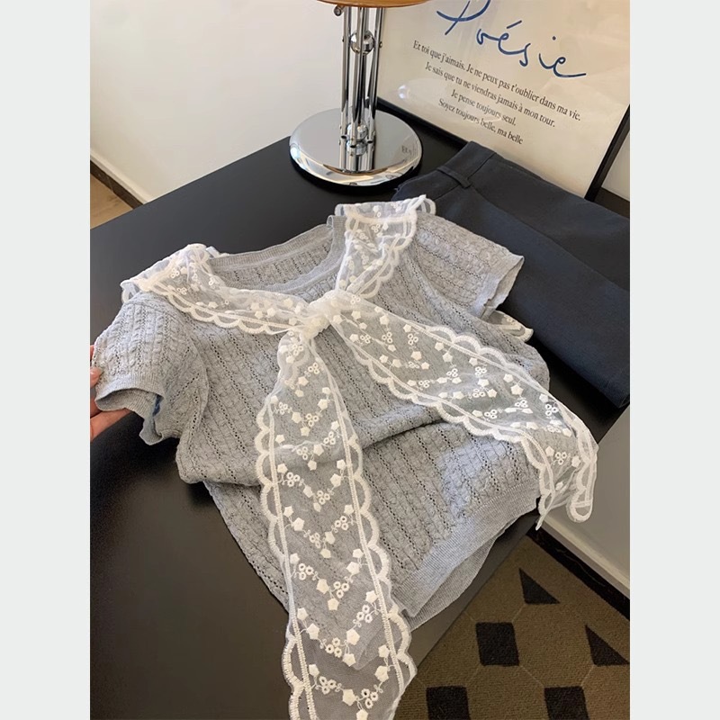 여름 새로운 한국 스타일 레트로 우아한 레이스 숄이 겹쳐진 그레이 니트 반팔 여성 연령 감소 디자인 탑스토어 가기
