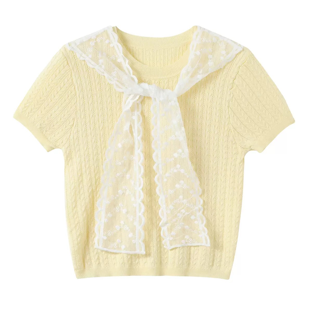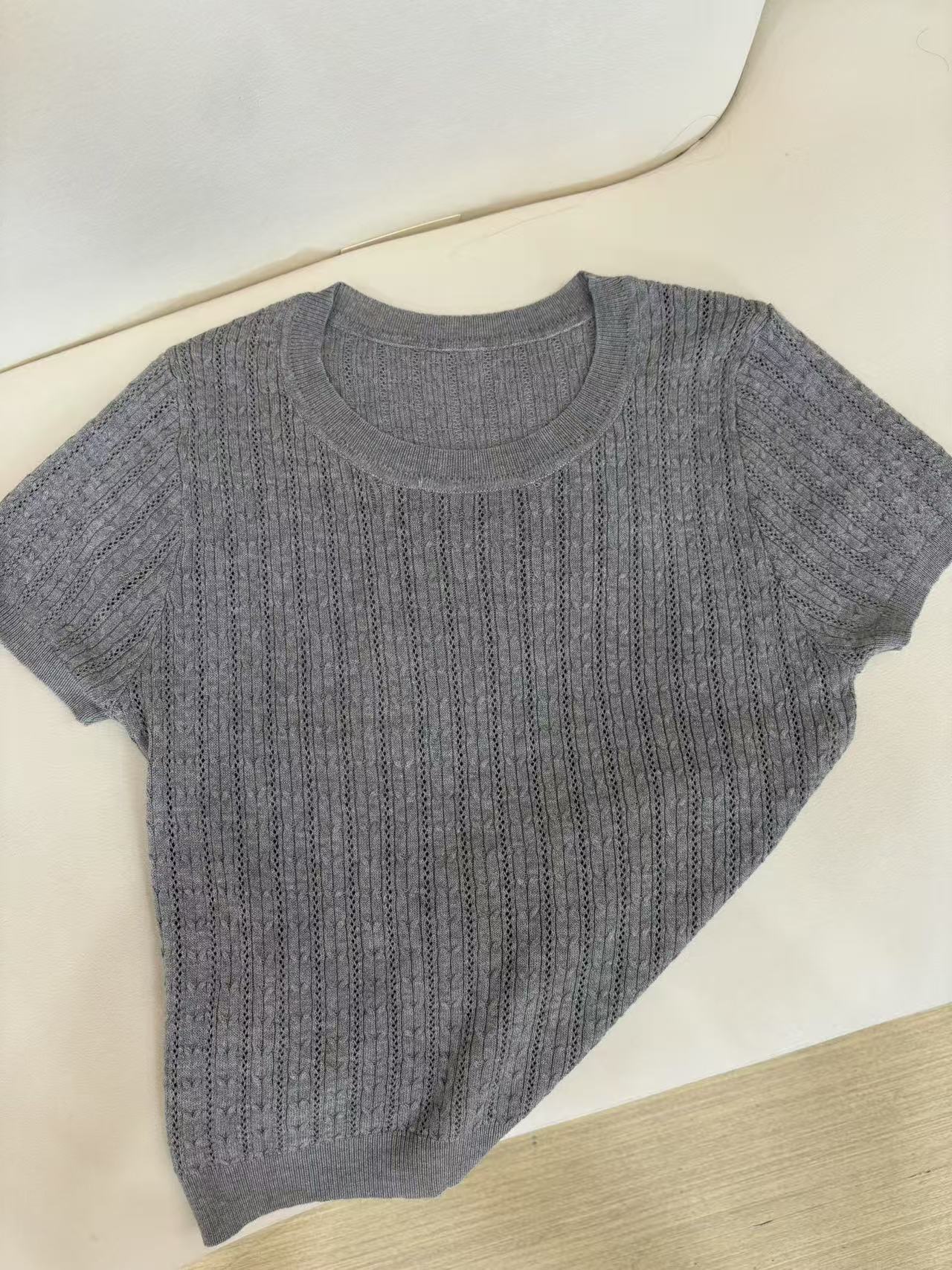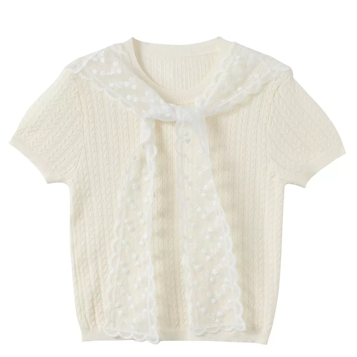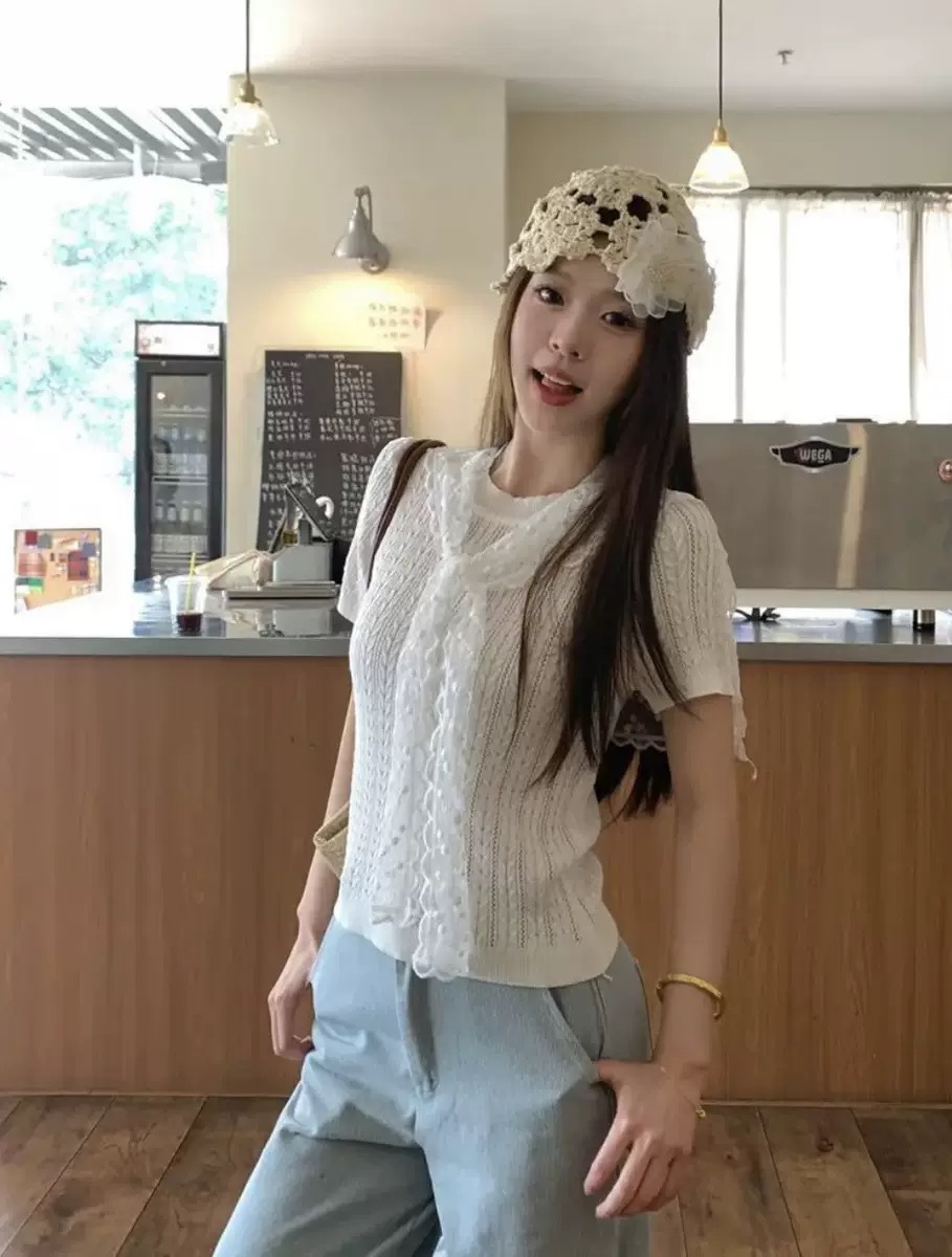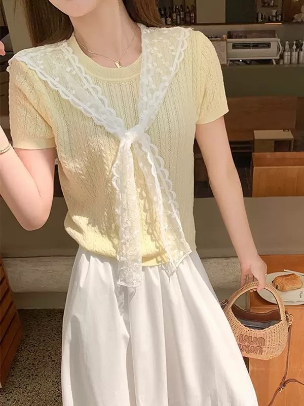여름 새로운 한국 스타일 레트로 우아한 레이스 숄이 겹쳐진 그레이 니트 반팔 여성 연령 감소 디자인 탑스토어 가기