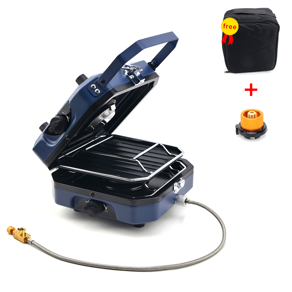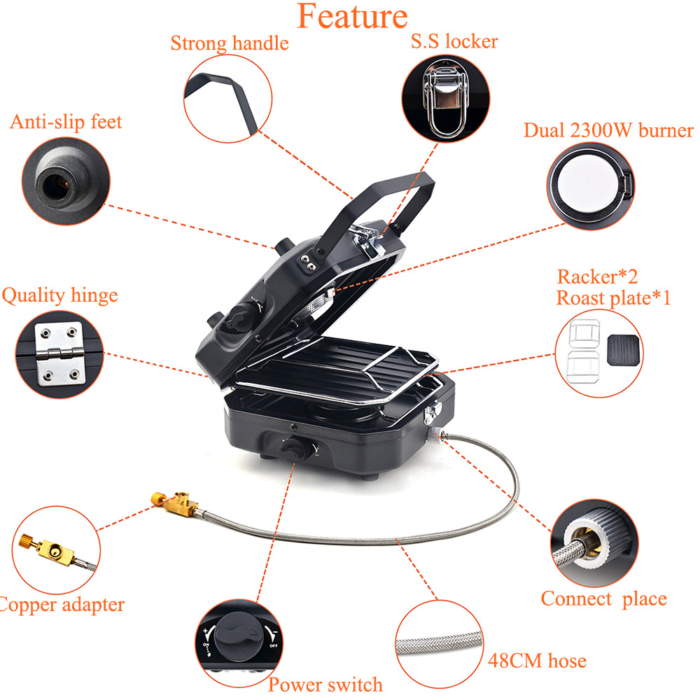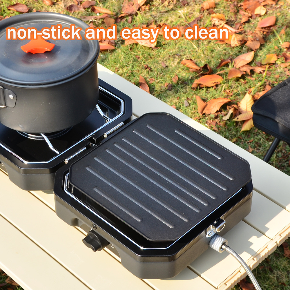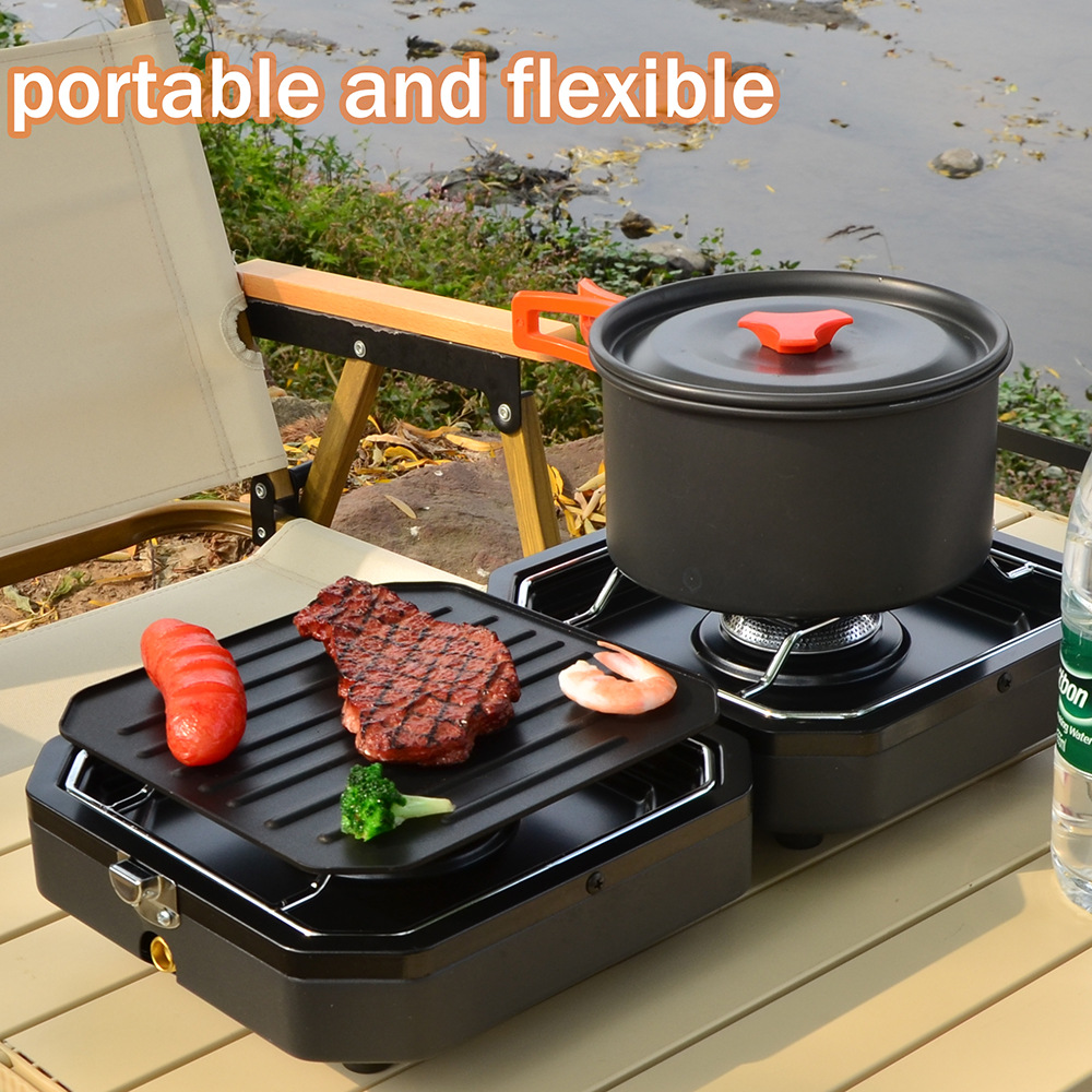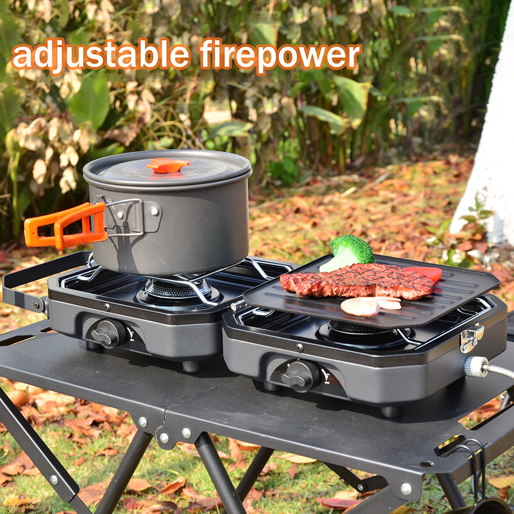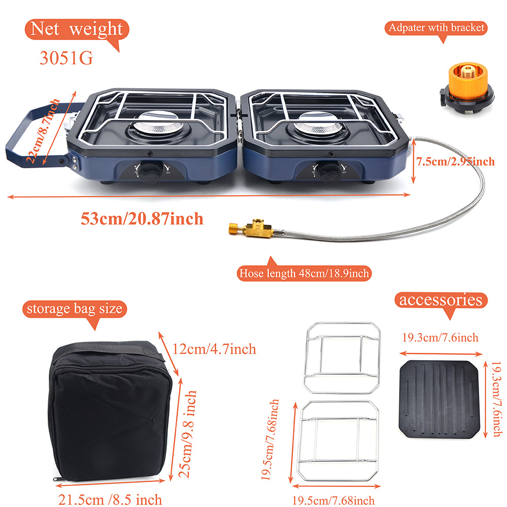 1.Item name: Protable Dual Gas Stove 2.Foldable design, saving more space 3.Simple & safe automatic piezo electric ignition