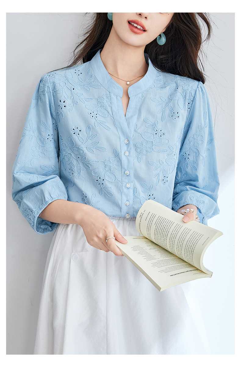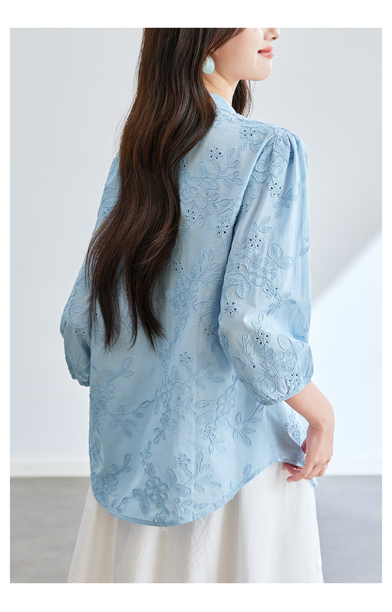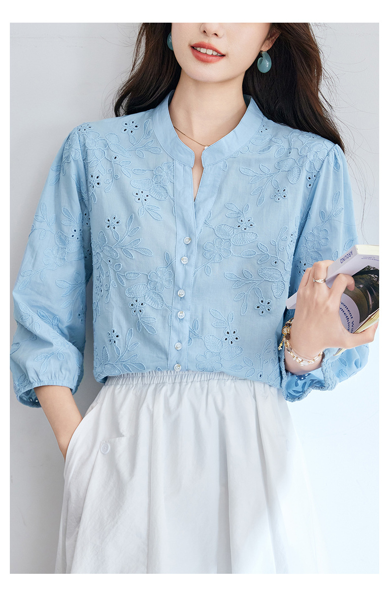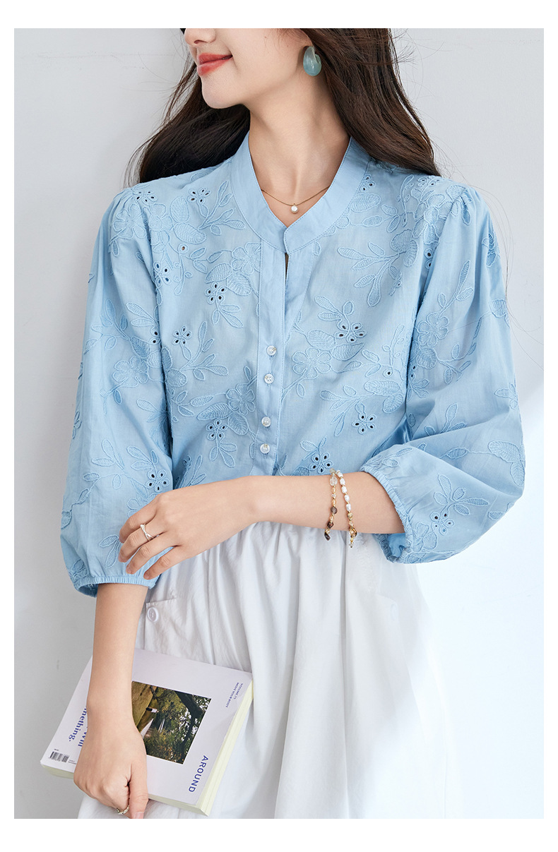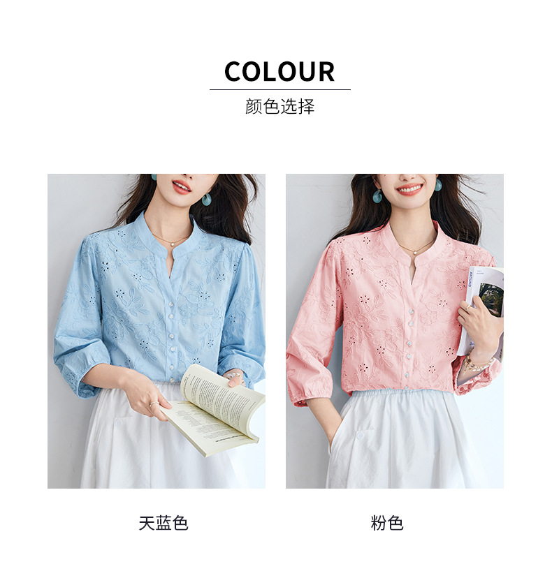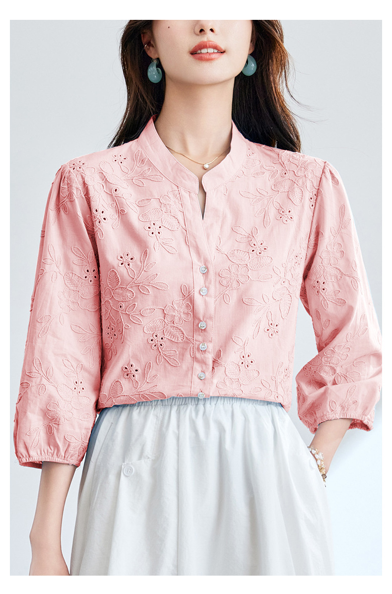 살구색 V넥 셔츠 여성용 7부 소매 2026 여름 신상 순면 자수 펀칭 탑 우아한 셔츠스토어 가기