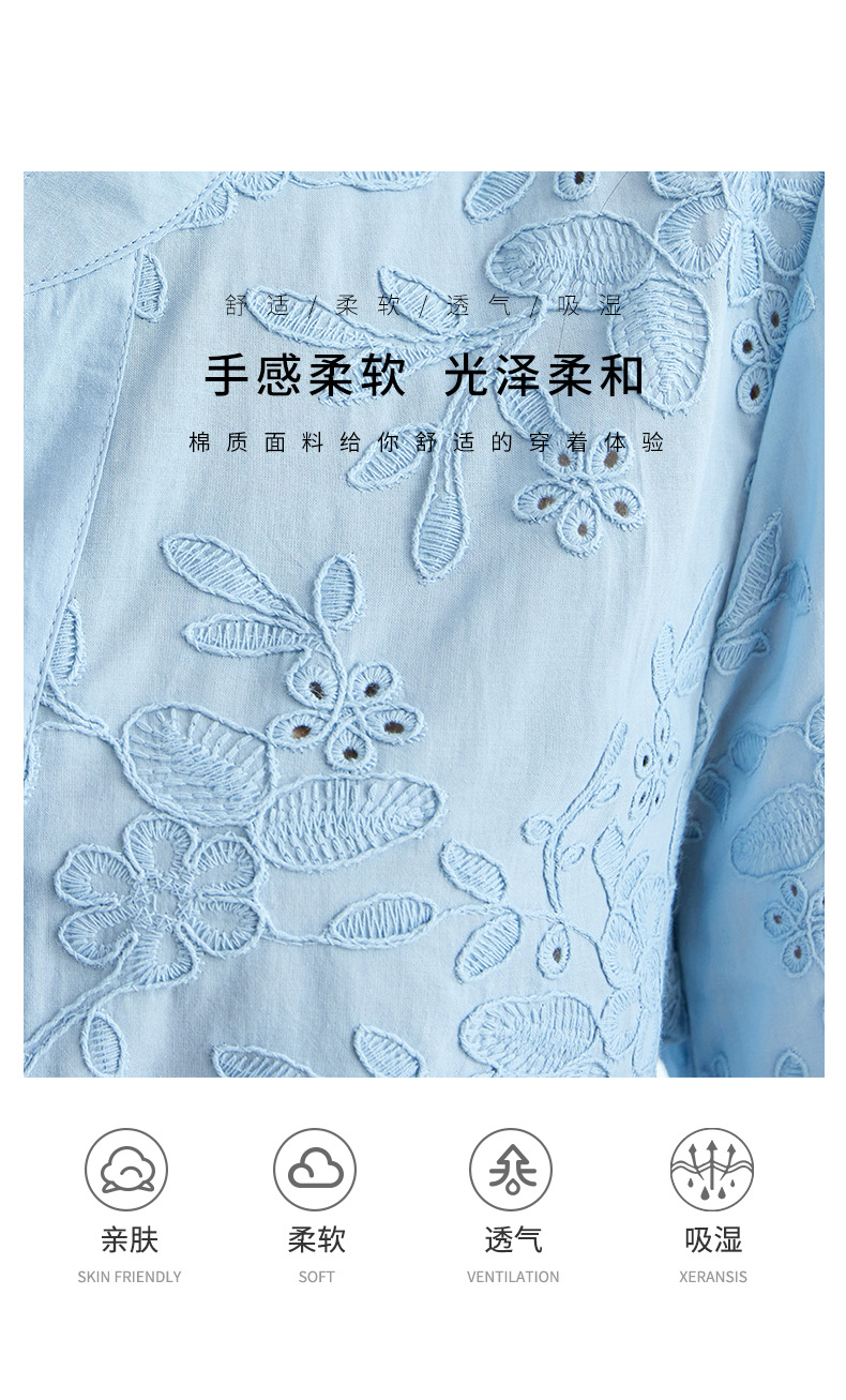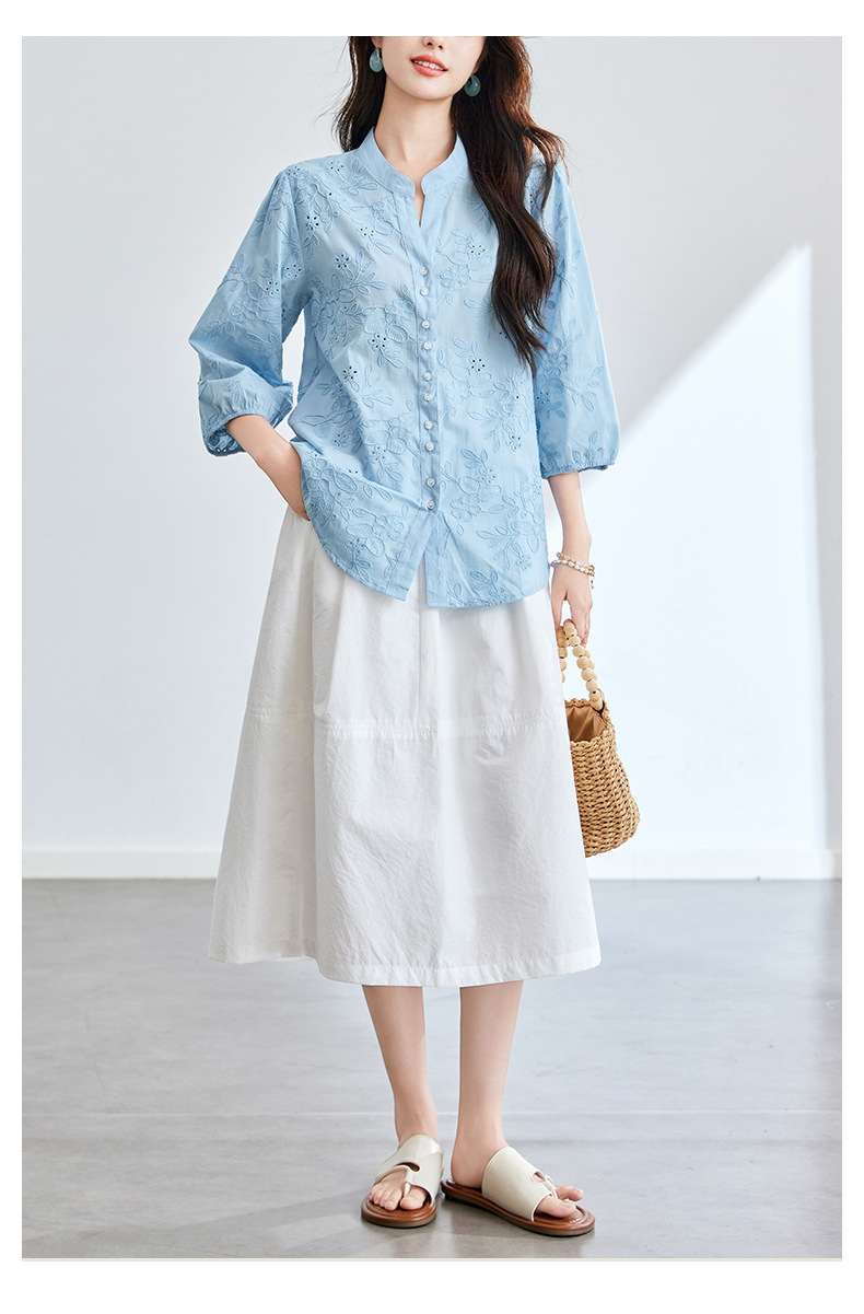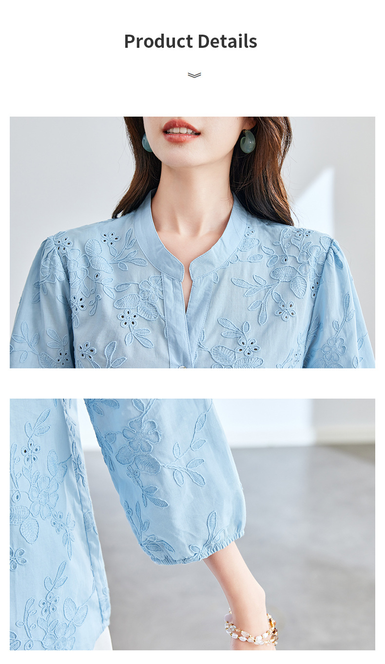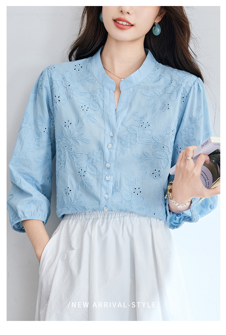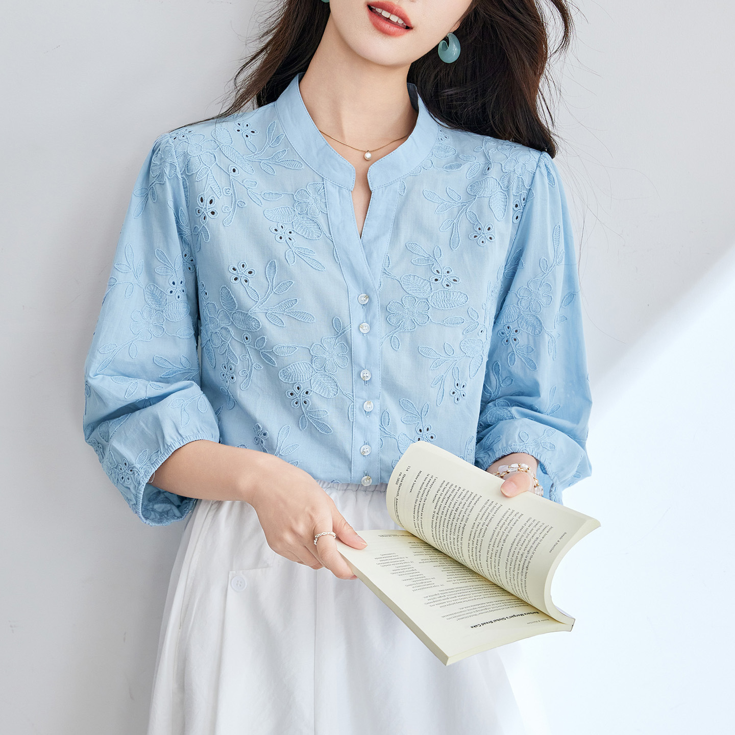 살구색 V넥 셔츠 여성용 7부 소매 2026 여름 신상 순면 자수 펀칭 탑 우아한 셔츠스토어 가기
