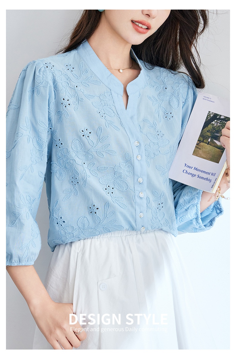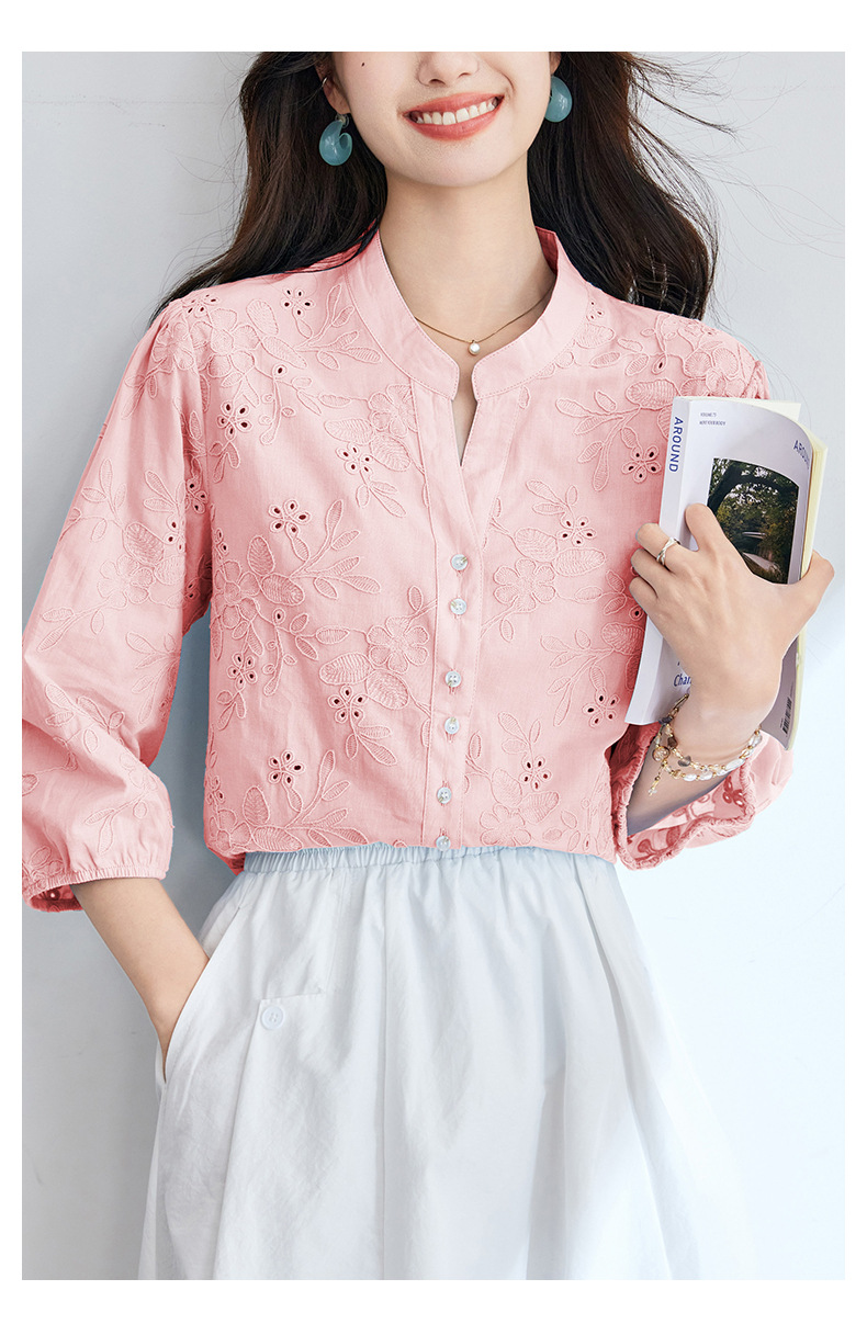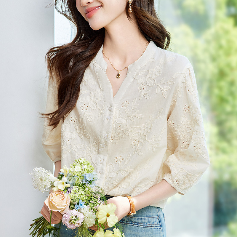 살구색 V넥 셔츠 여성용 7부 소매 2026 여름 신상 순면 자수 펀칭 탑 우아한 셔츠