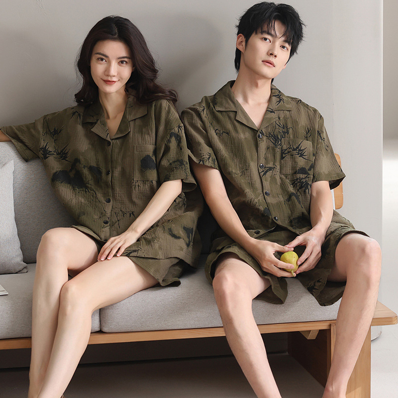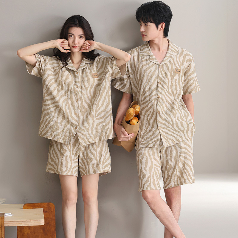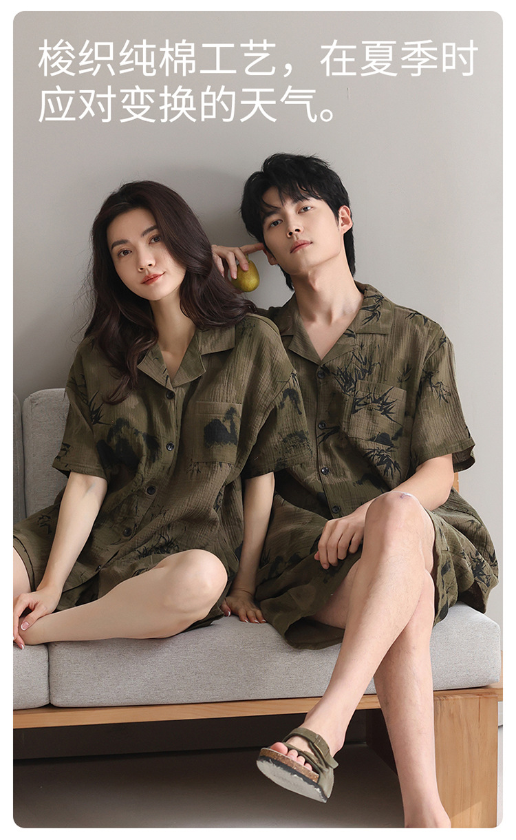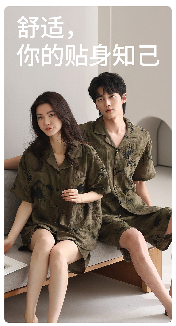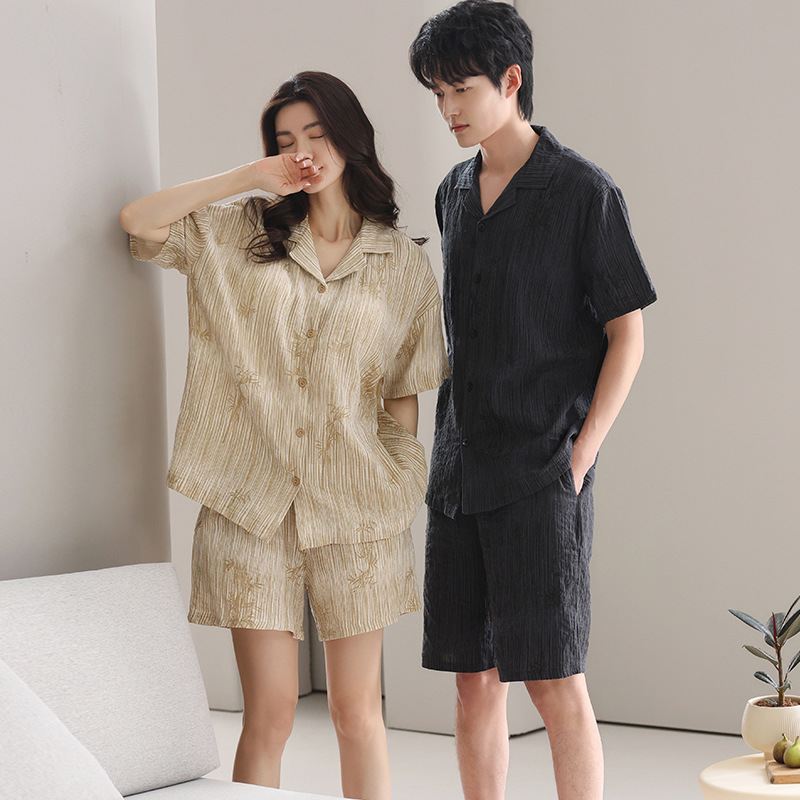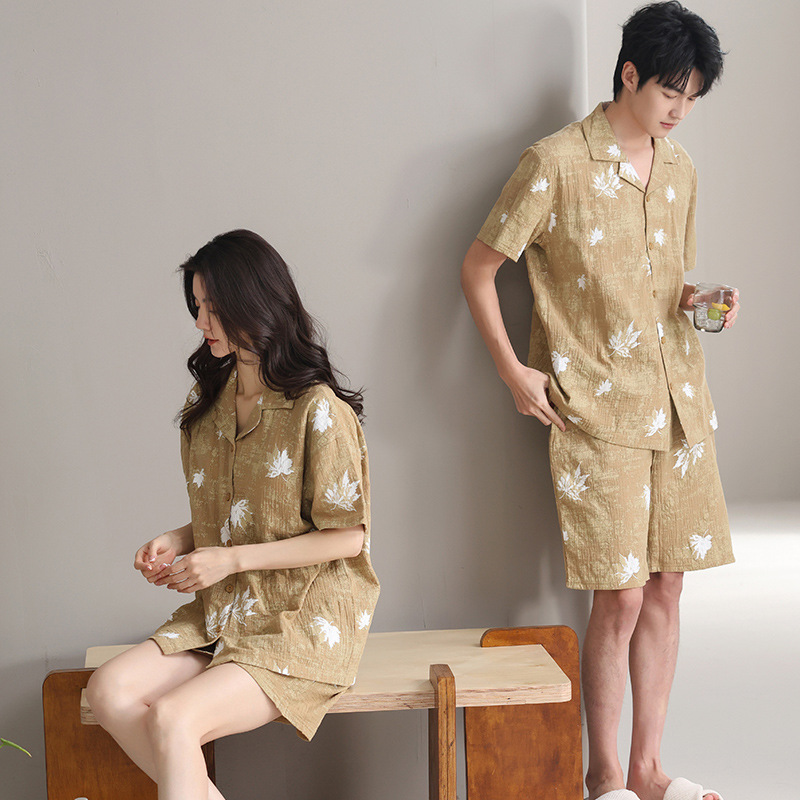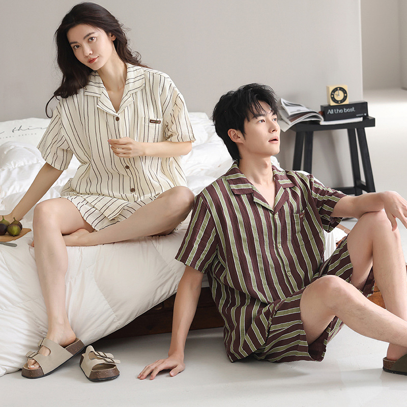 가슴 패드가있는 여름 순수 코튼 거즈 커플 잠옷 남성과 여성 반팔 반바지 카디건 얇은 고급 여름 정장스토어 가기