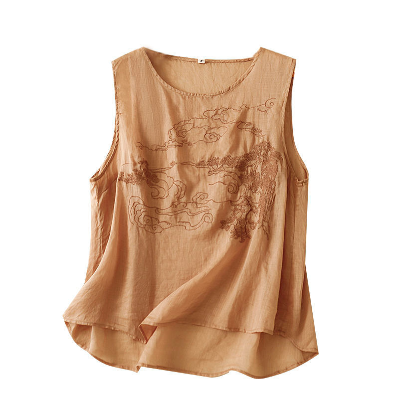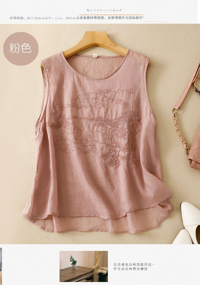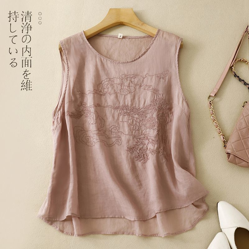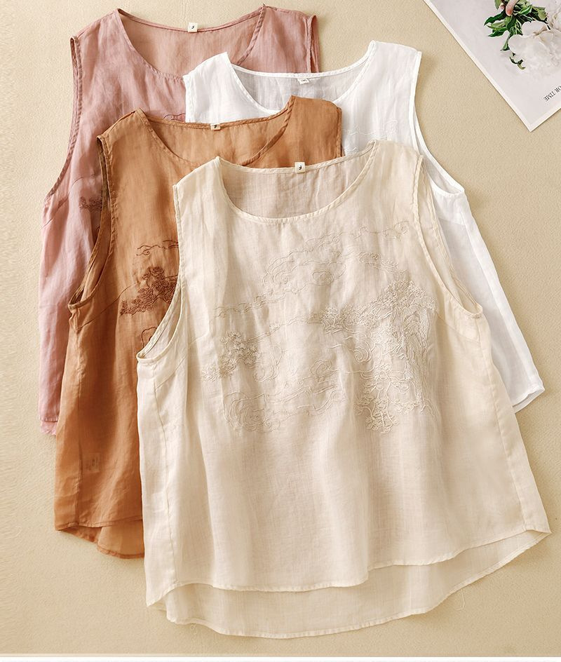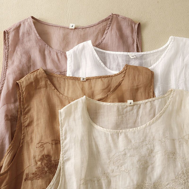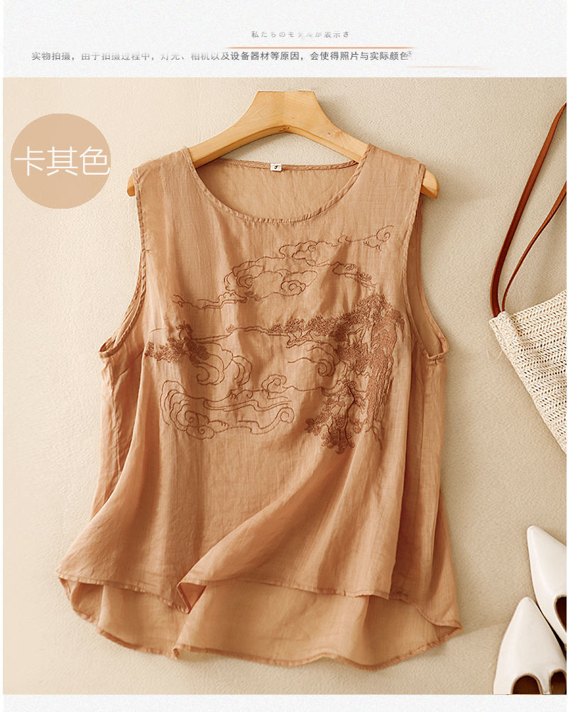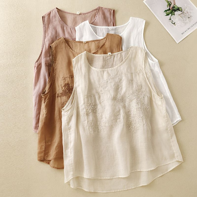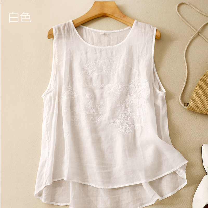우아하고 시크한 캐미솔 코튼과 린넨 자수 솔리드 컬러 여성 여름 신작 다재다능하고 편안한 루즈 라운드 넥 탑스토어 가기