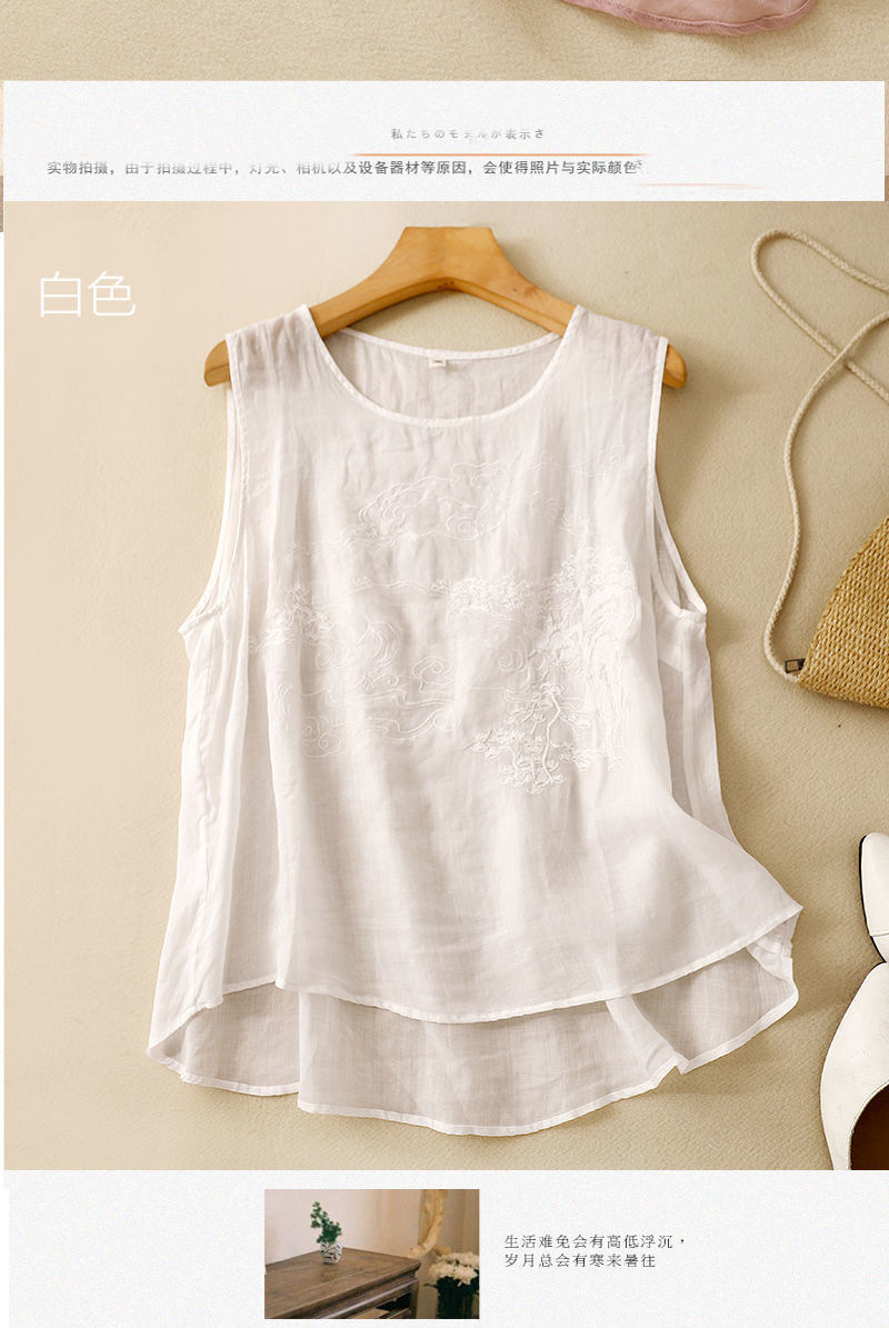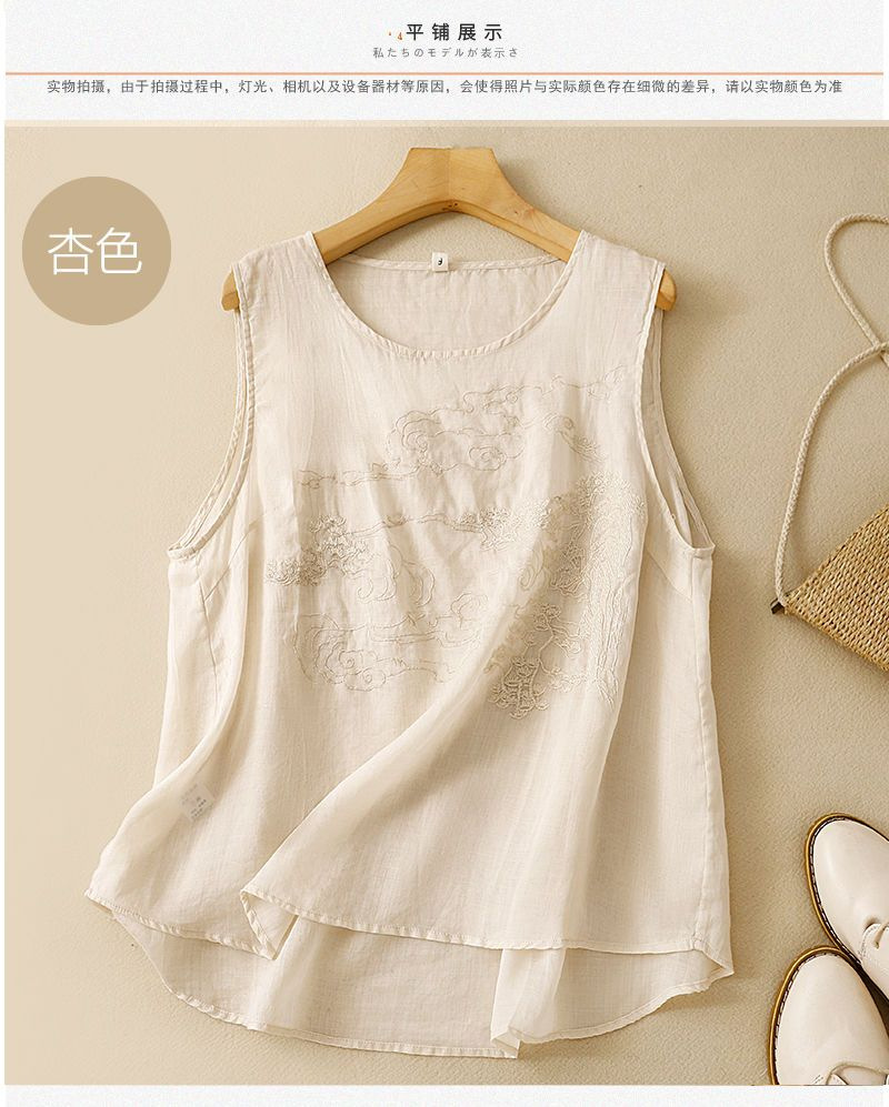 우아하고 시크한 캐미솔 코튼과 린넨 자수 솔리드 컬러 여성 여름 신작 다재다능하고 편안한 루즈 라운드 넥 탑