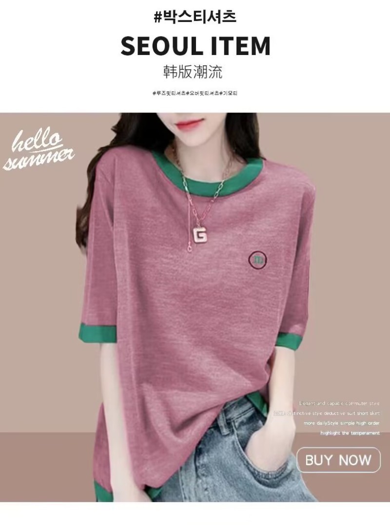 반팔 대나무 면 티셔츠 여성용 2025 년 봄과 여름 새로운 얇은 플러스 사이즈 느슨한 캐주얼 스티칭 반소매 최고 여성 의류스토어 가기