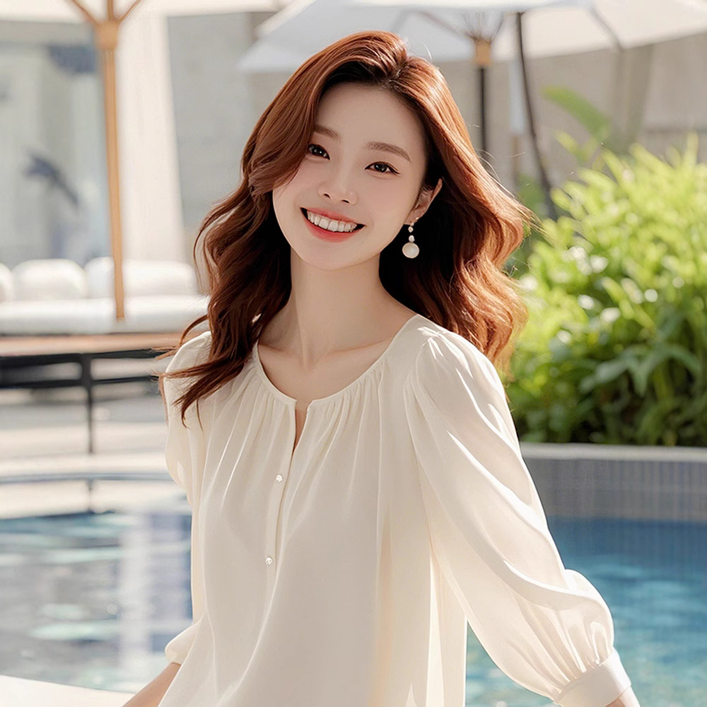 신선하고 요정 7 점 소매 우아한 패션 탑 느슨한 독특한 흰색 쉬폰 셔츠 여성의 여름스토어 가기