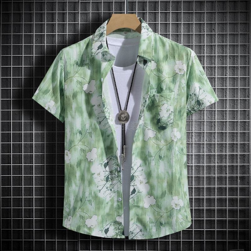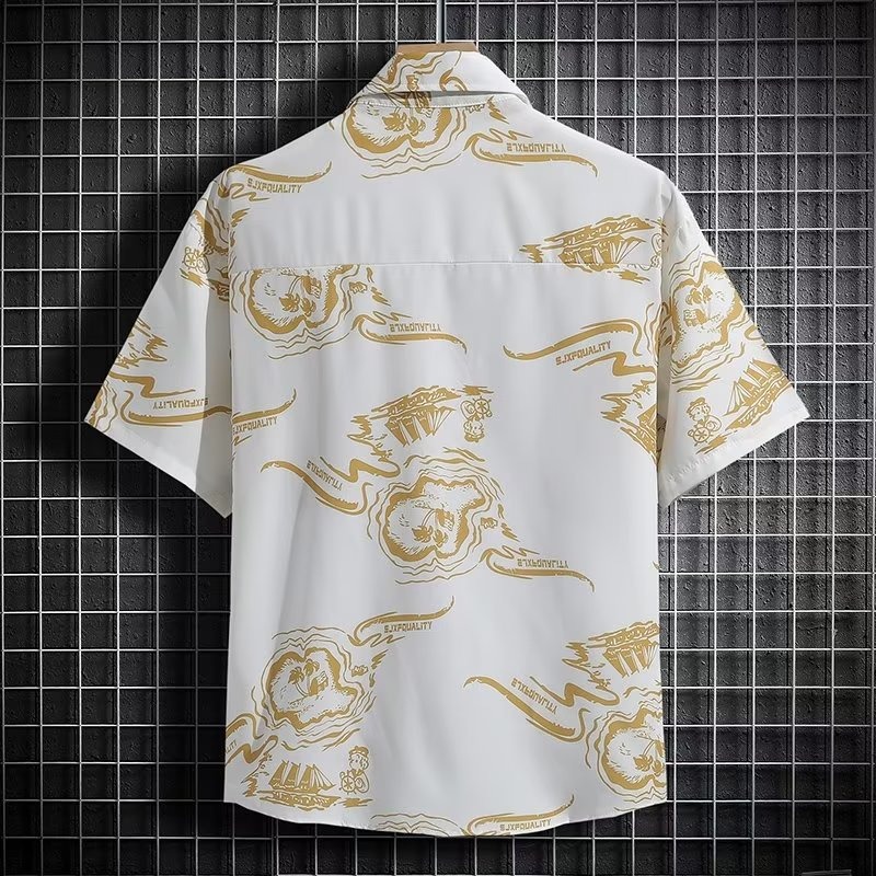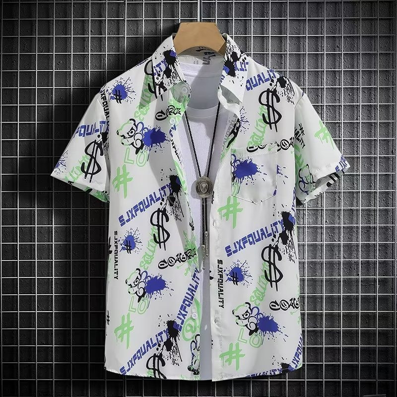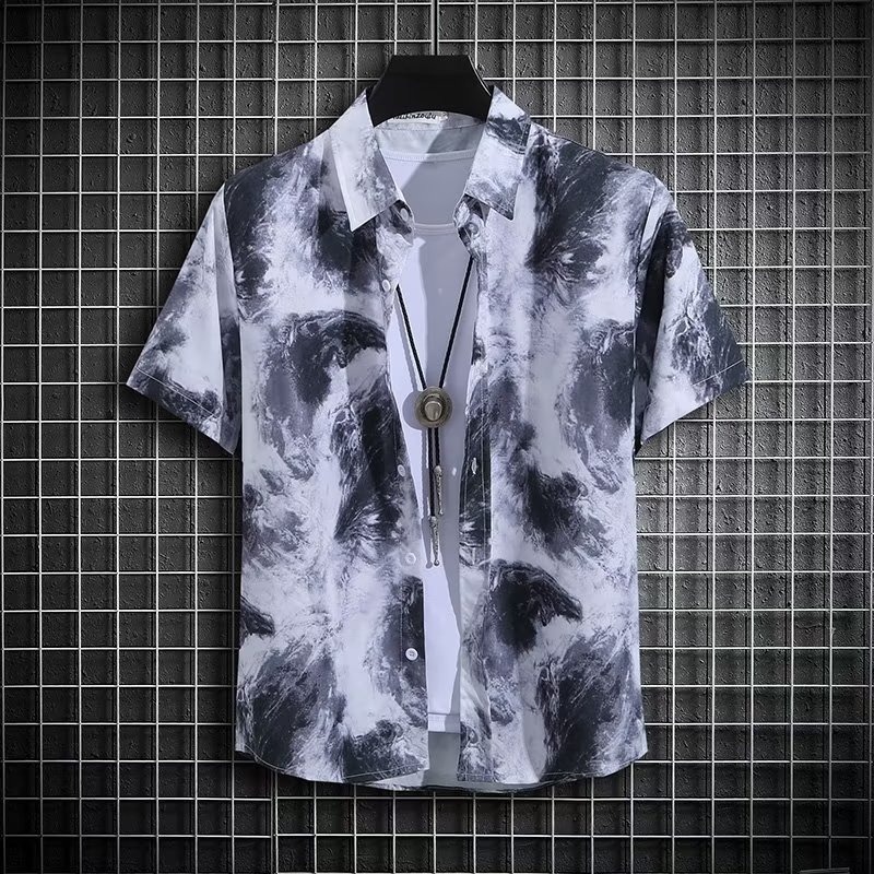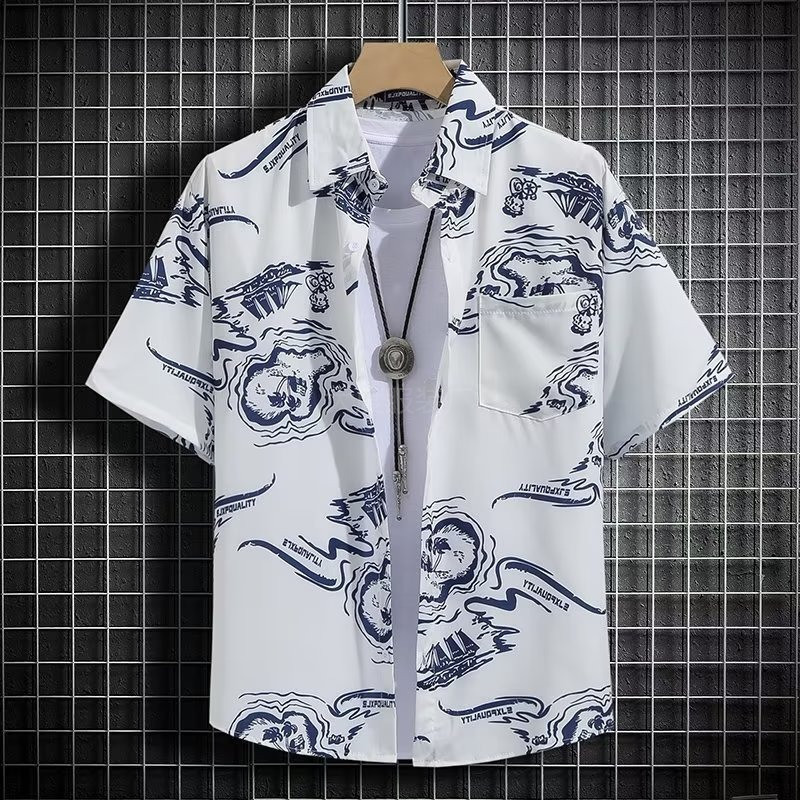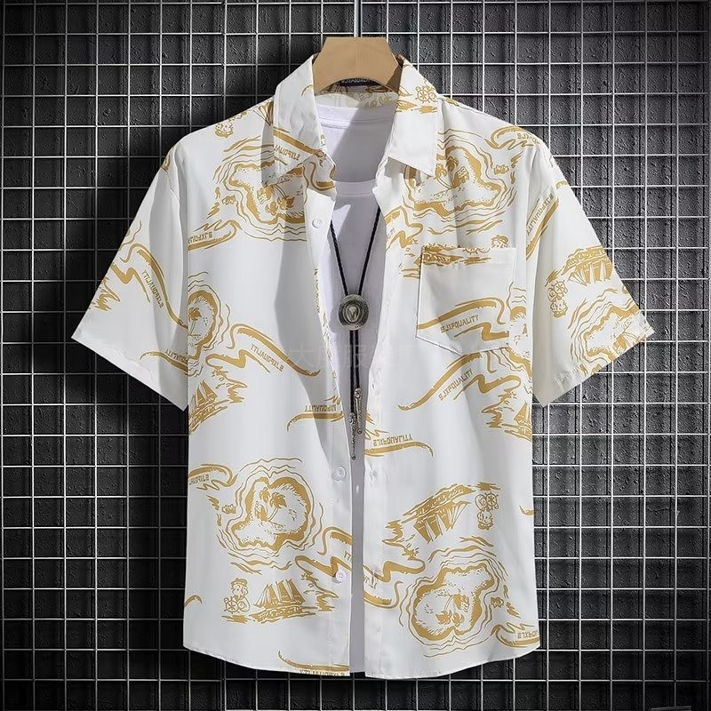 국경 2025 새로운 반팔 셔츠 남자 아이스 실크 통기성 여름 한국식 트렌디 프린트 셔츠 반소매 셔츠