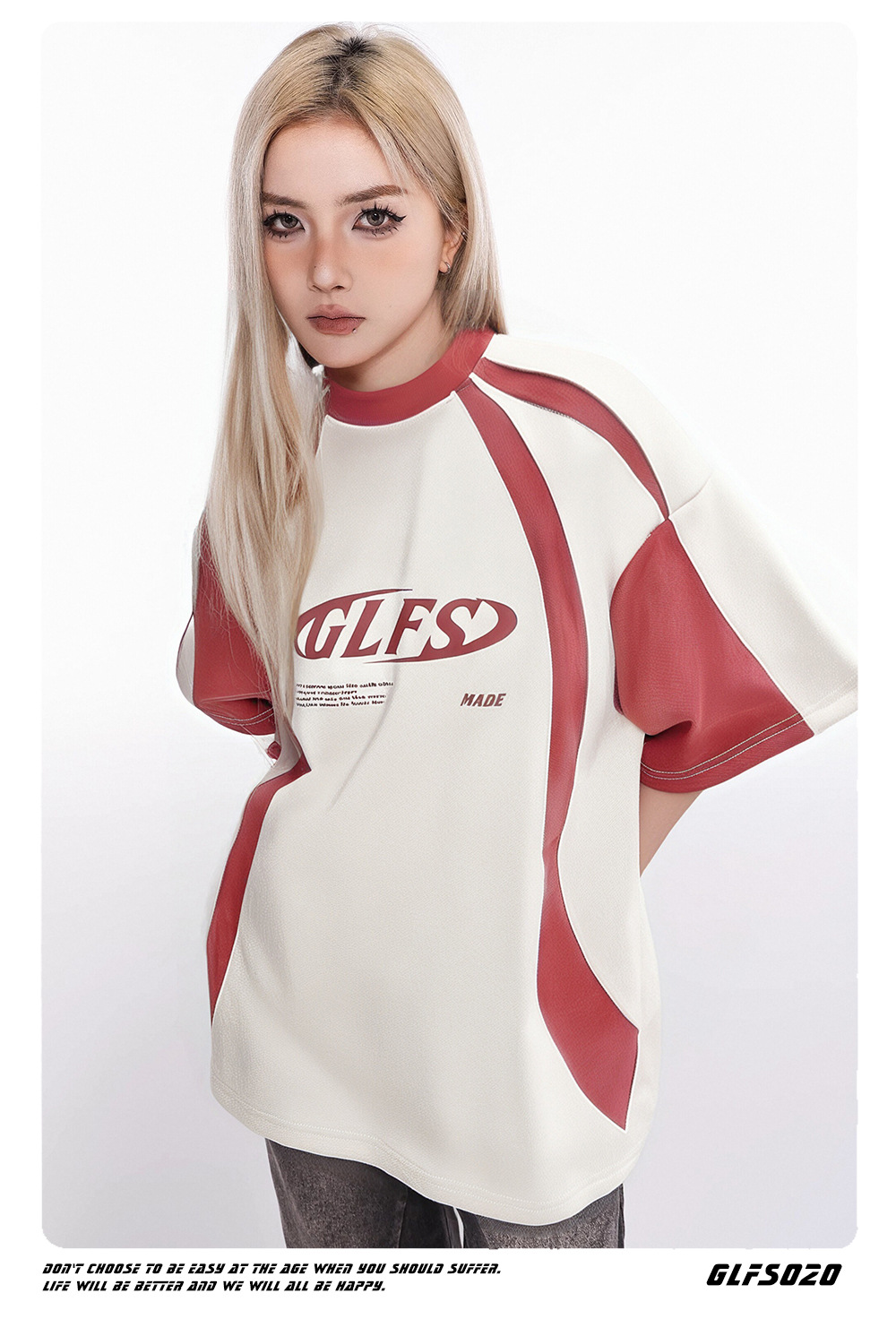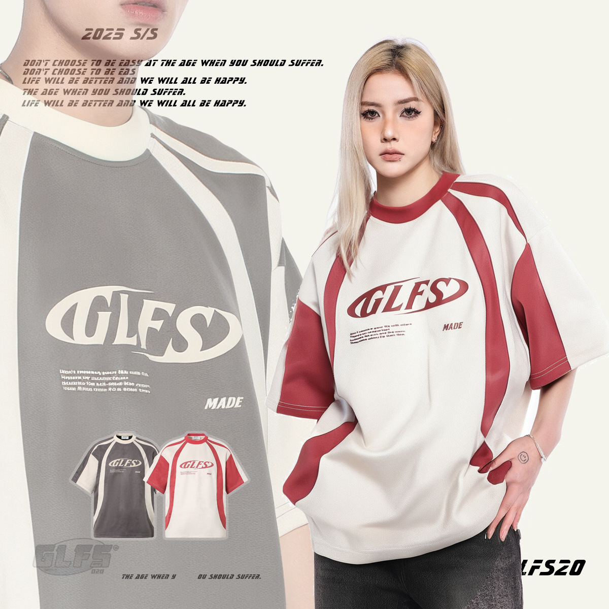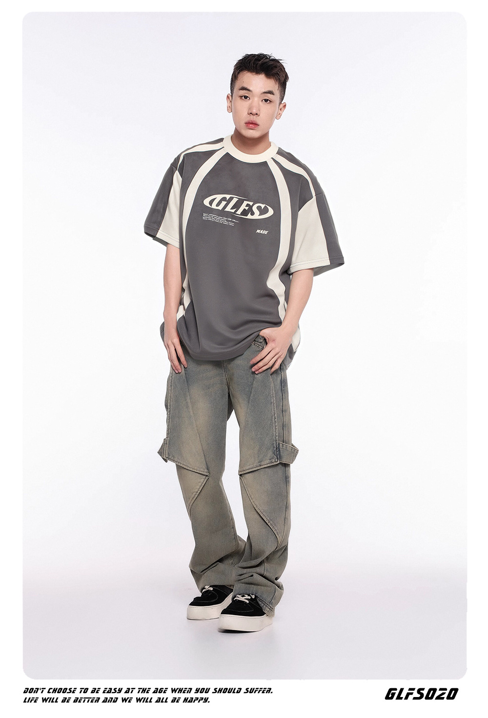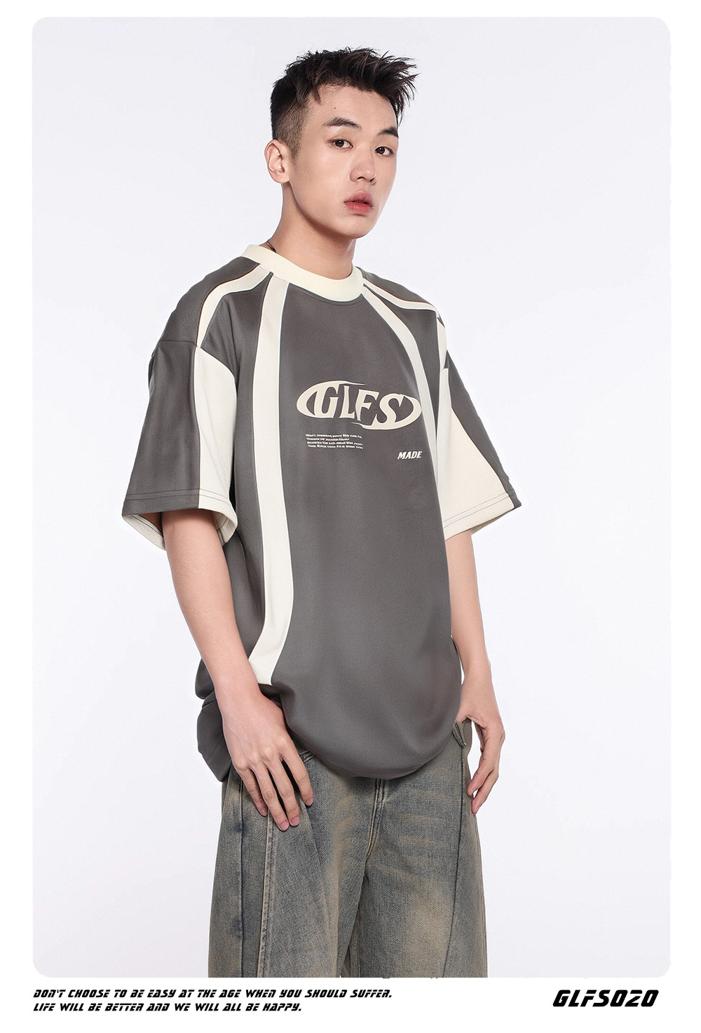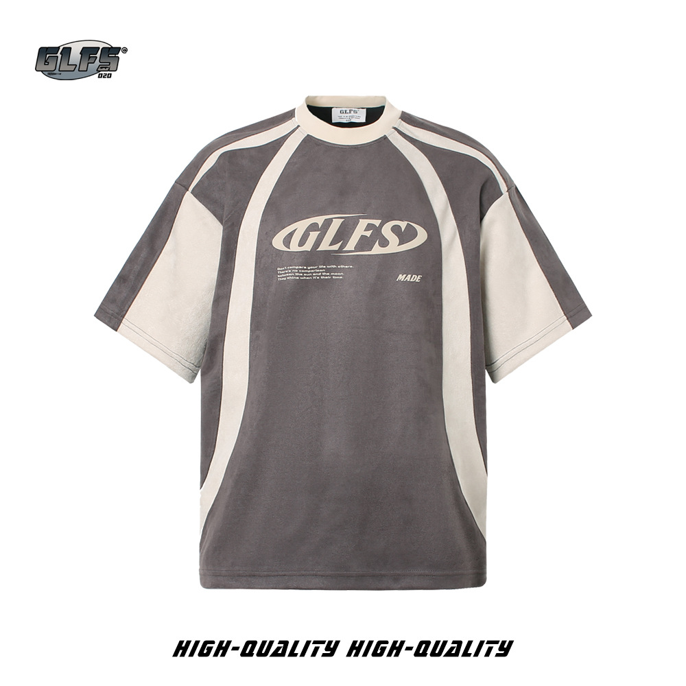 GLFS 국가 패션 남성 스티칭 디자인 스웨이드 짧은 소매 폼 인쇄 하이 스트리트 티 대학 스타일 청소년 t