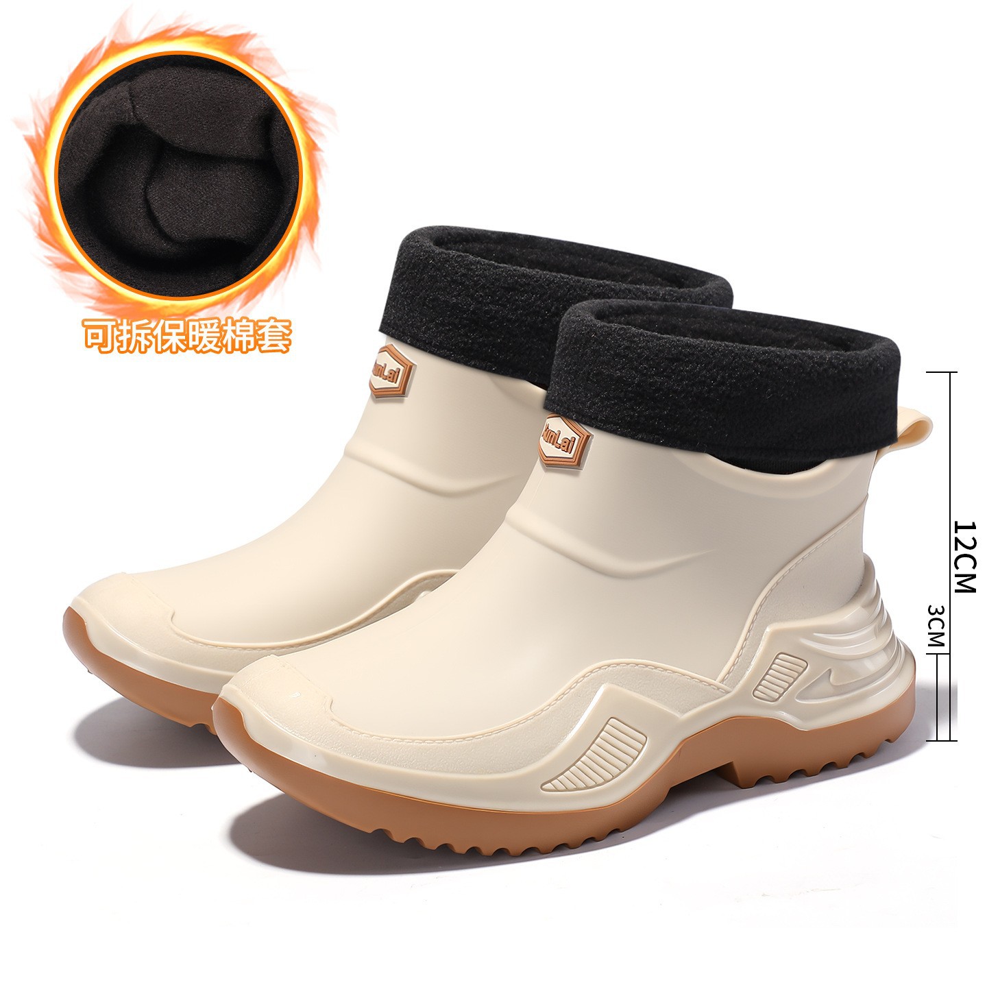 밀리터리 그린 트렌디하고 패셔너블한 남성용 짧은 장화, 스포츠 스타일 남성용 방수 고무신, 두껍고 넓어진 미끄럼 방지 남성용 대외 무역 장화스토어 가기