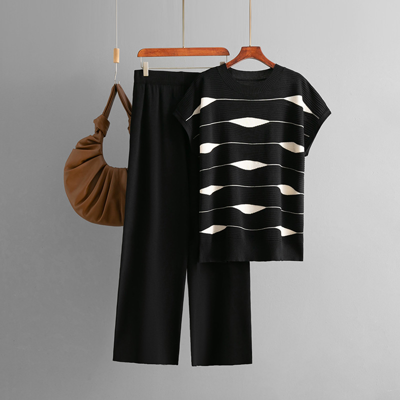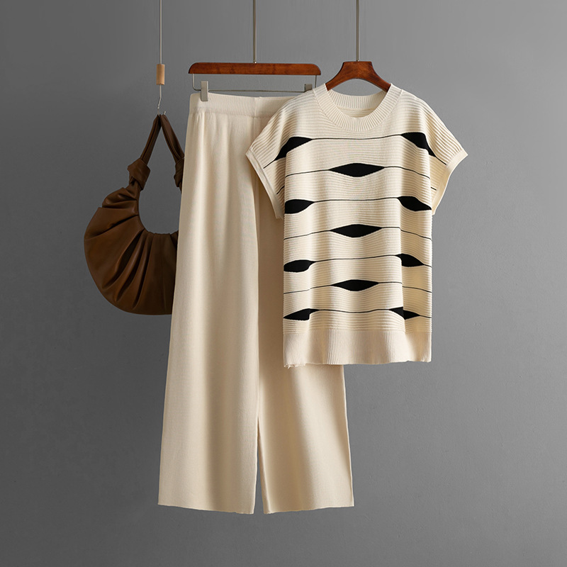 국경 간 패션 세트 여성의 여름 새 줄무늬 스웨터 탑 높은 허리 넓은 다리 바지 캐주얼 투피스 세트스토어 가기