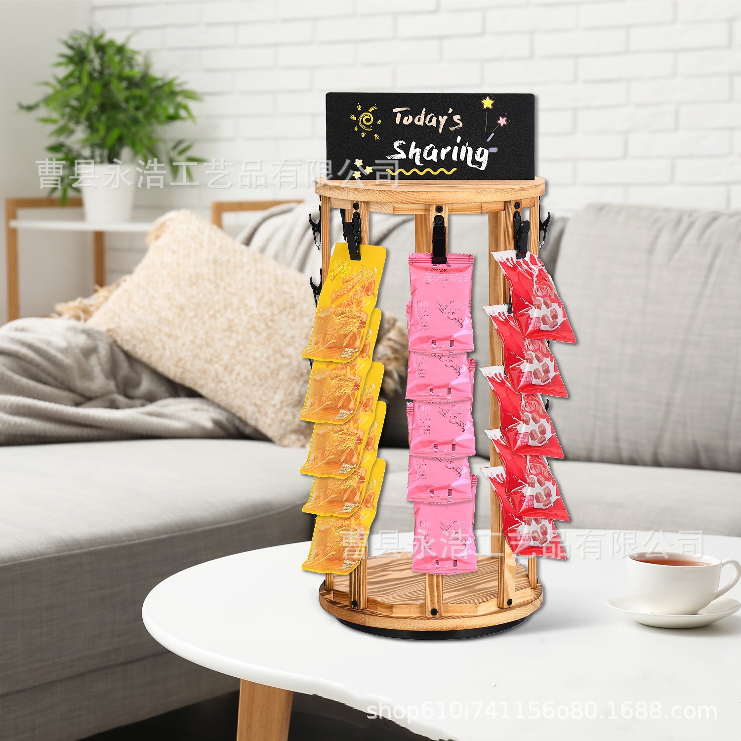 나무 리셉션 스낵 디스플레이 랙 샹차오 감자 칩 스토리지 랙 데스크탑 회전 가능한 스토리지 랙 칠판스토어 가기